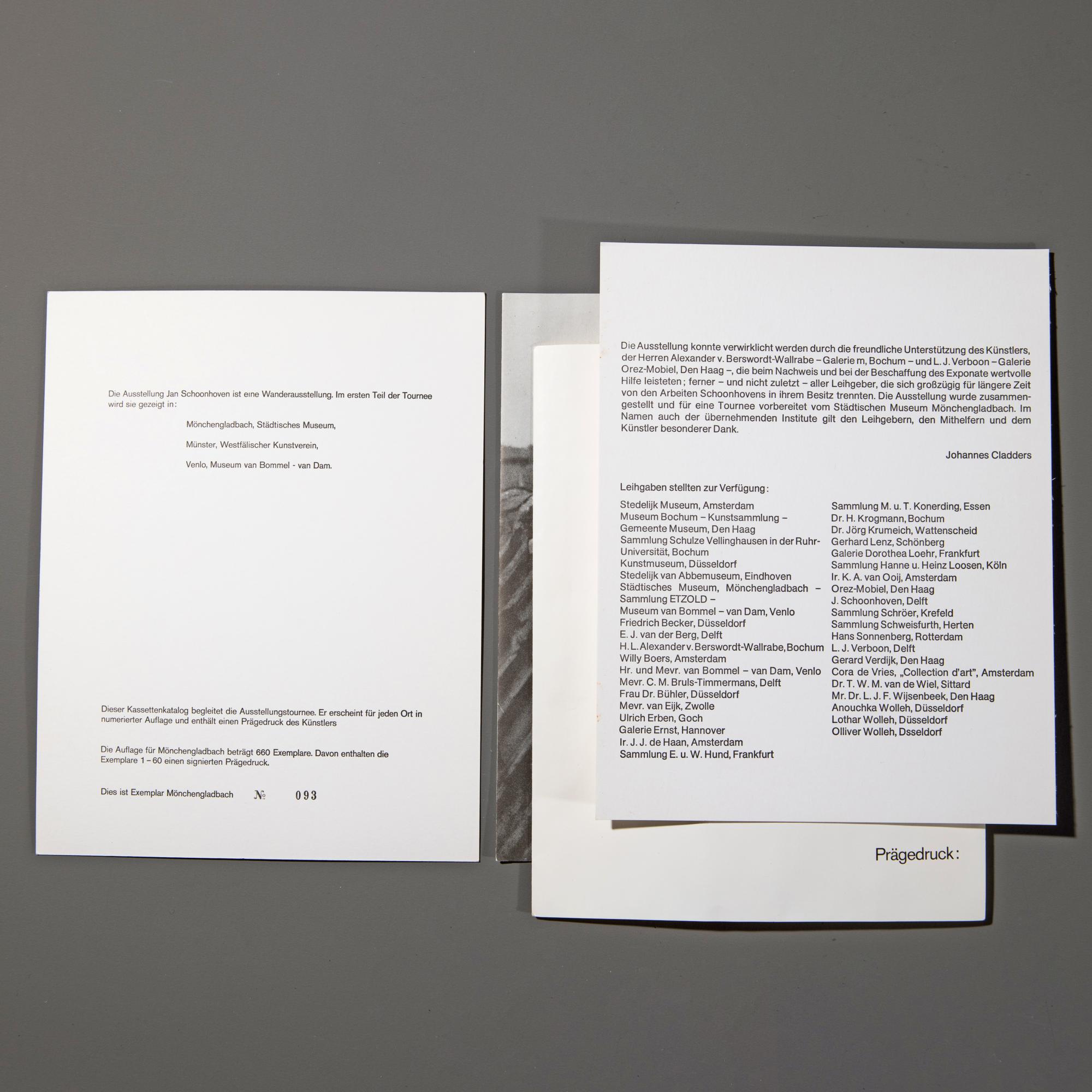 Zu der Ausstellung Schoonhoven, Städtisches Museum Mönchengladbach, 01. März - 09. April 1972, 29,5 x 16 cm. Auf der Rückseite des Vorsatzblatts nummeriert: 93 (gestempelt); mit einem Prägedruck und 23 Offset-Drucken auf Karton. Exemplar 93 von 660 Exemplaren.