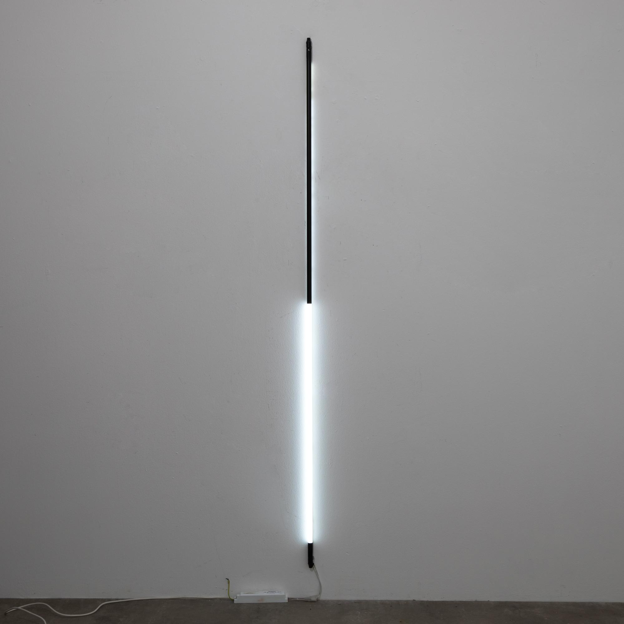 Lichtskulptur, 200 x 1,6 cm. Neonröhre teilweise mit Klebeband geschwärzt. Mit Kabel und Transformer.