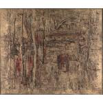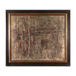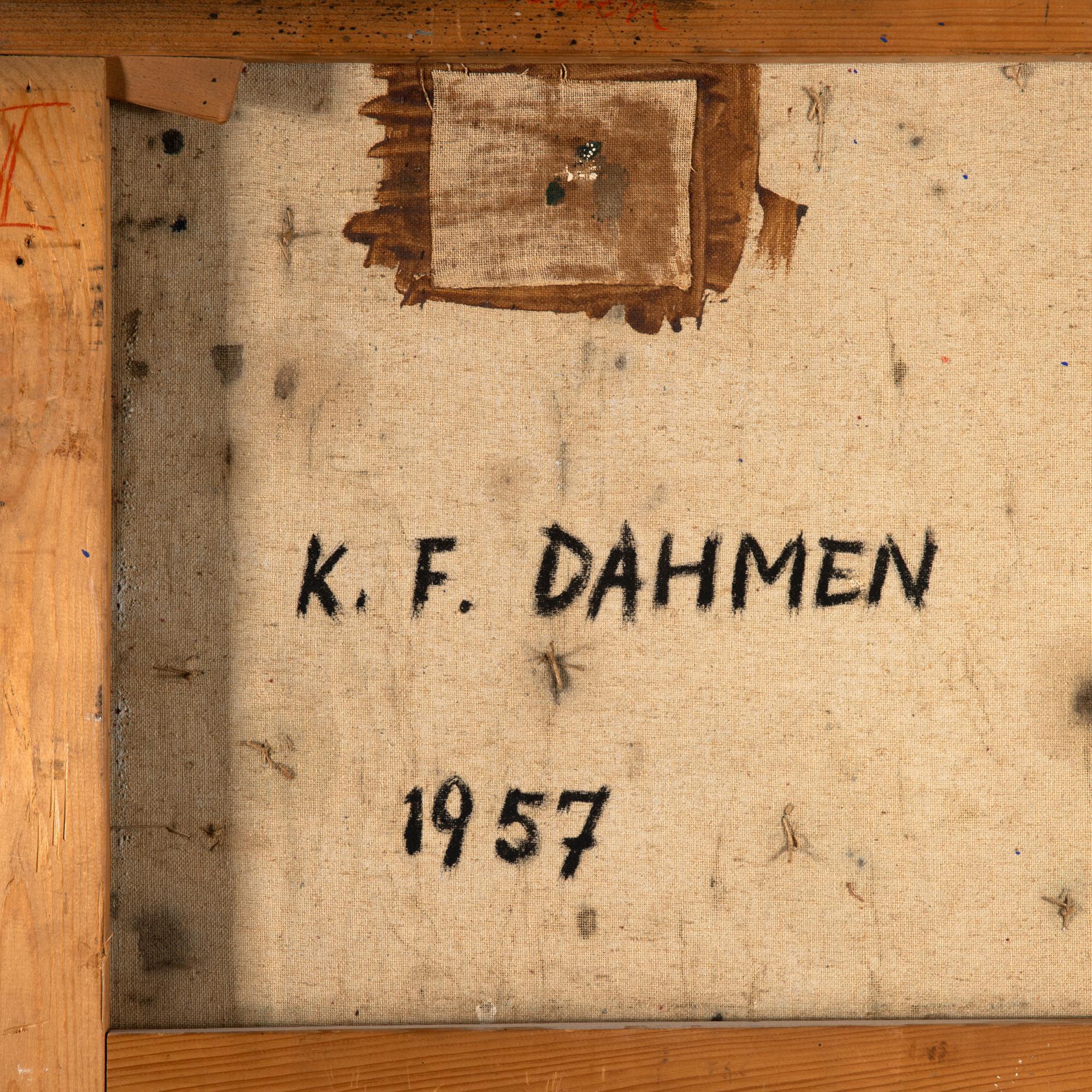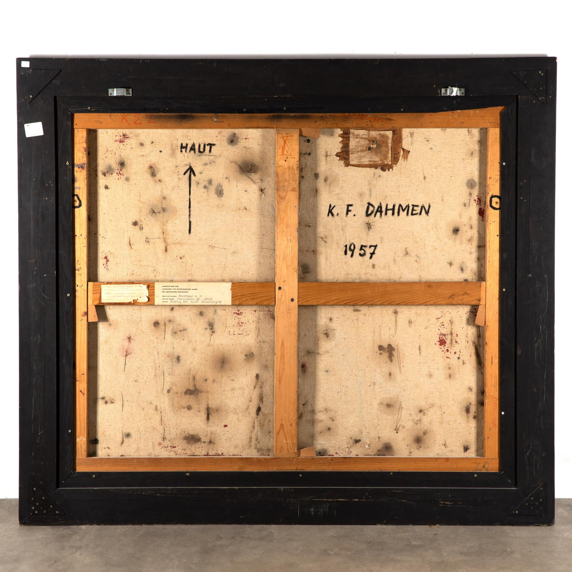 Mischtechnik auf Leinwand. 110 x 130 cm. Verso mit Faserstift signiert und datiert: K. F. Dahmen 1975 (Öl) sowie auf zwei Ausstellungsetiketten typographisch bezeichnet. Gerahmt und so beschrieben.
