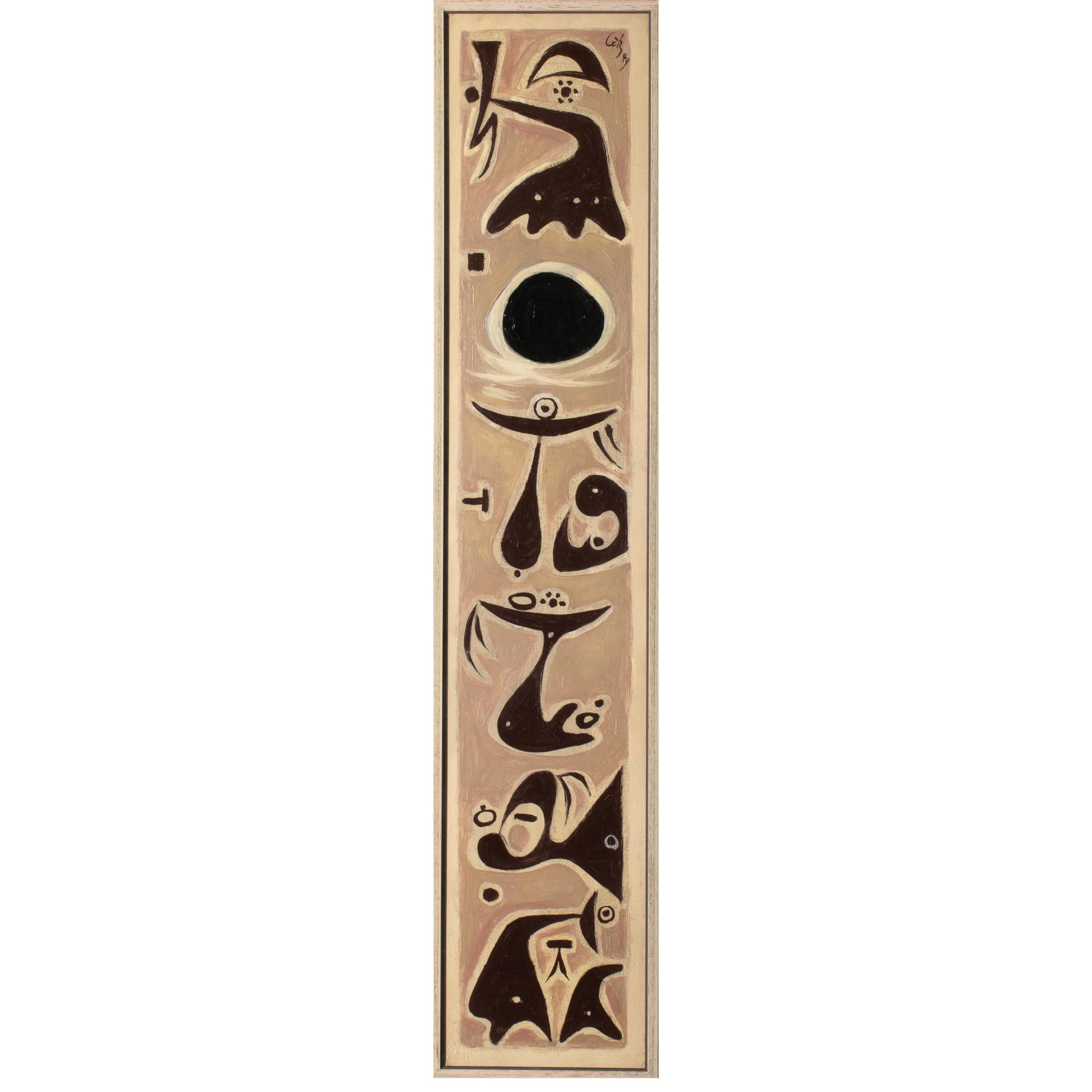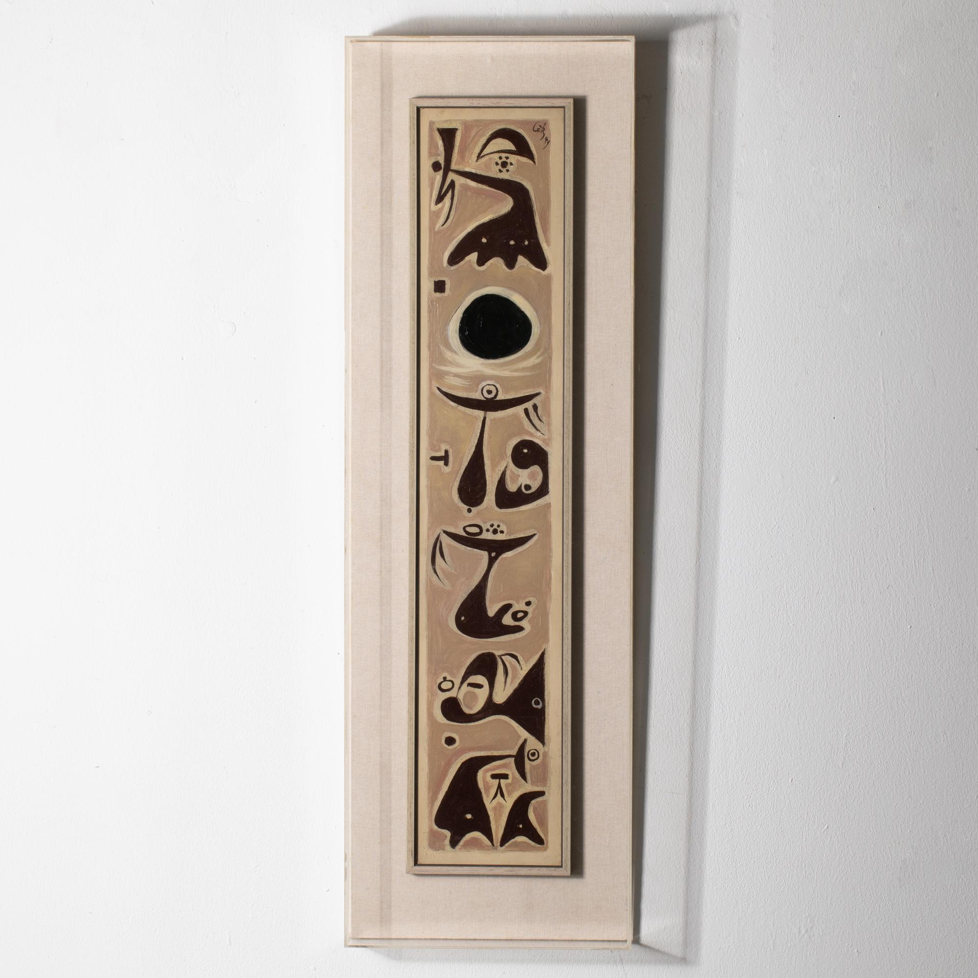 Öl auf Hartfaserplatte. 92 x 18 cm. Oben rechts mit Pinsel signiert und datiert: Götz(19)49 (Öl), verso bezeichnet: K.O. Götz / "Zu: 24 VARIATIONEN MIT EINER FAKTUR" / 1949 / ÖL (schwarzer Faserstift) sowie Sammlungsstempel Rissa Götz. In einem Objektrahmen aus Acryl gerahmt und so beschrieben.