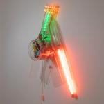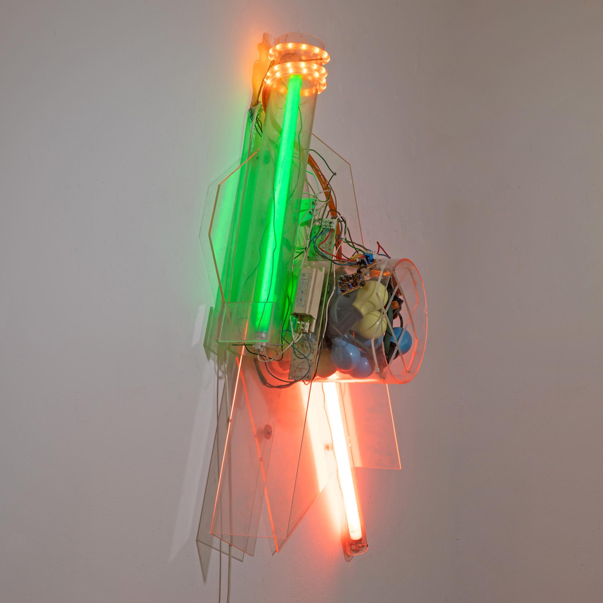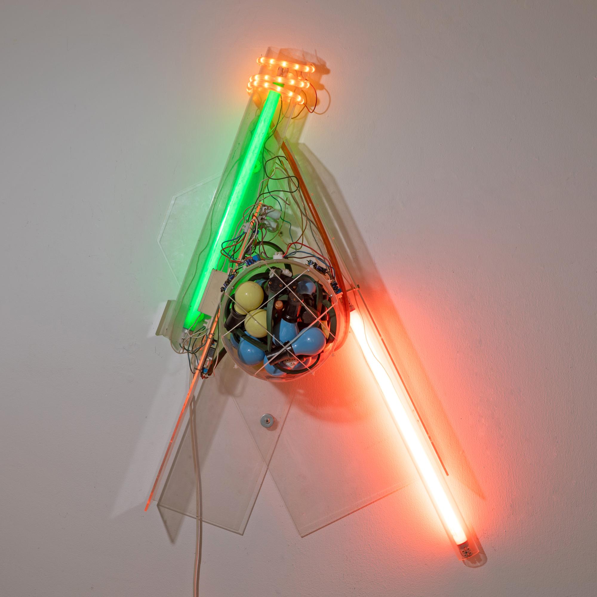Plexiglas und Glühbirnen montiert und teilweise in Plexiglaszylinder gelegt, elektrifiziert. 100 x 70 x 30 cm.
