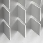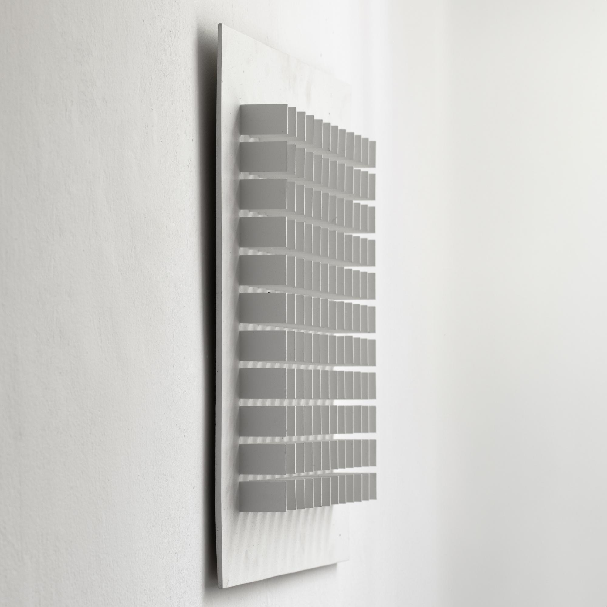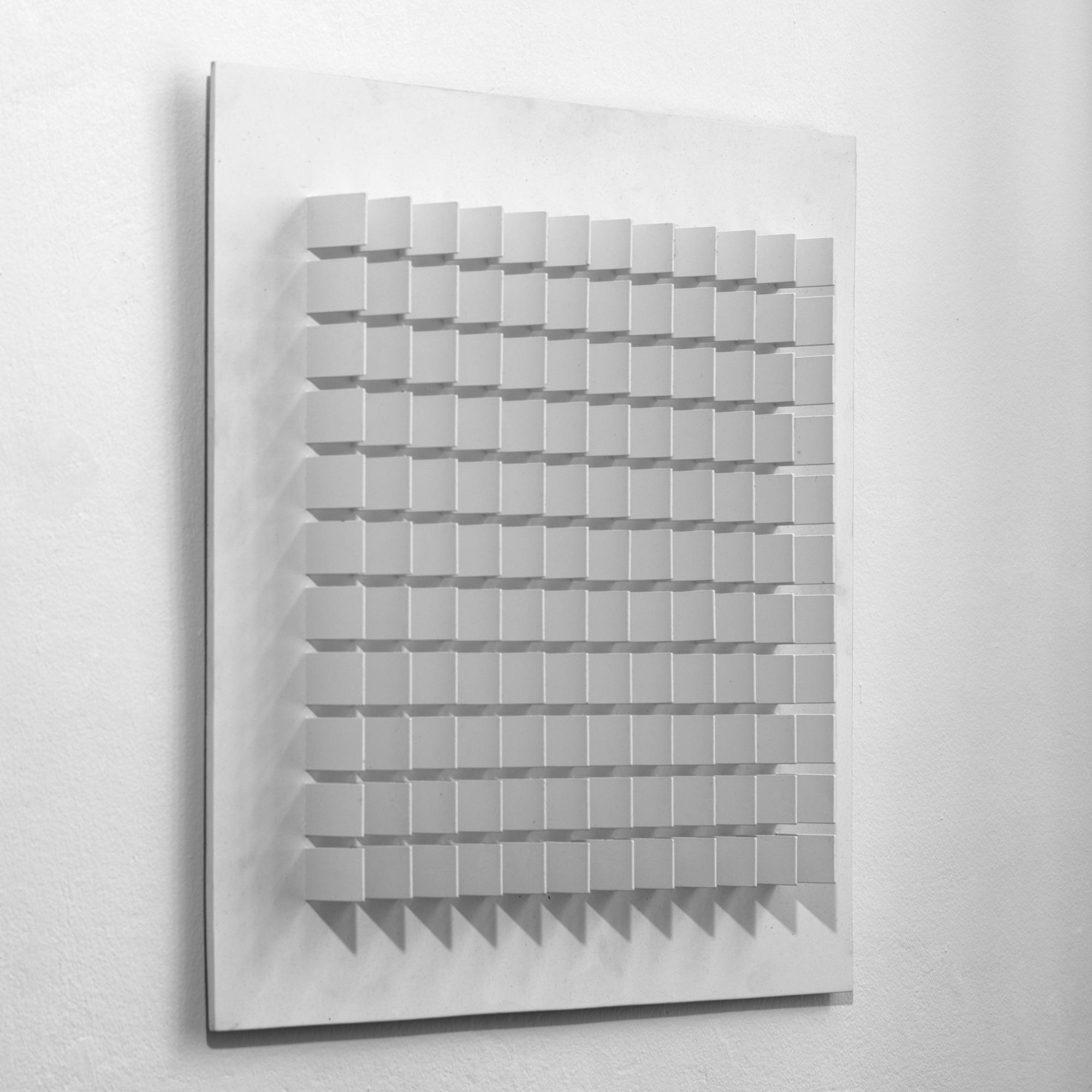 132 Holzplättchen auf Holz montiert und weiß lackiert. 60 x 60 cm. Verso signiert und datiert: Waibel75.