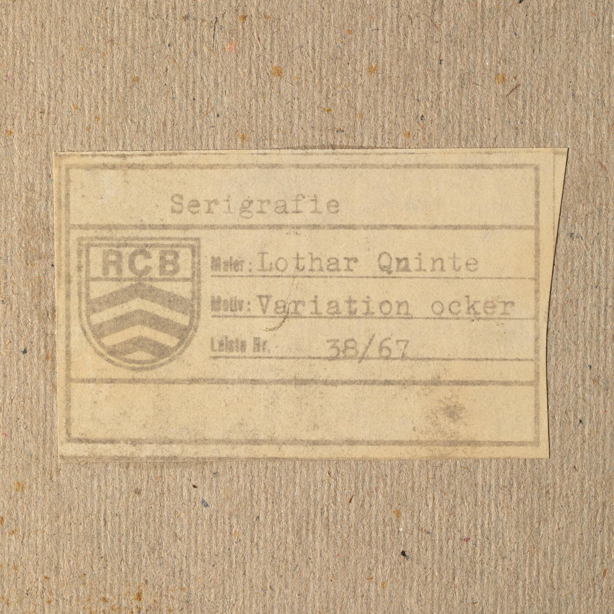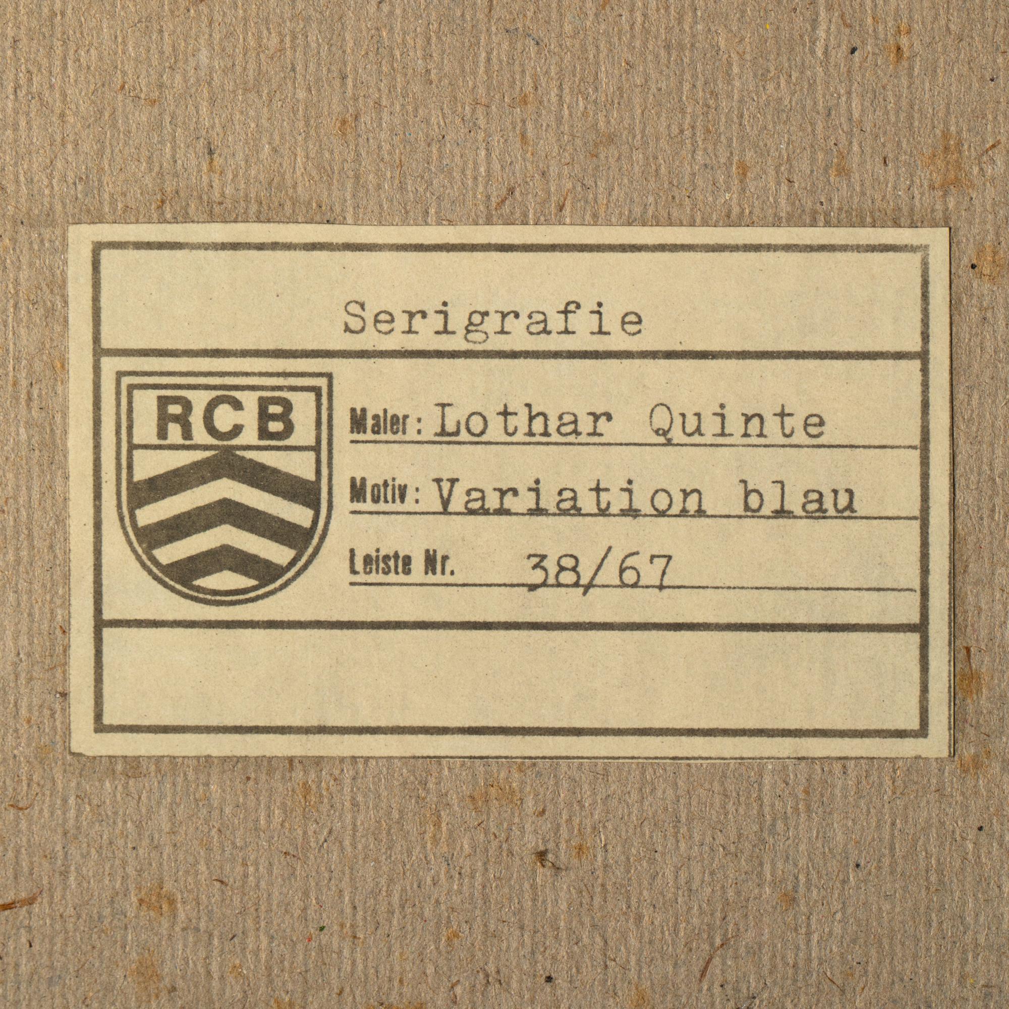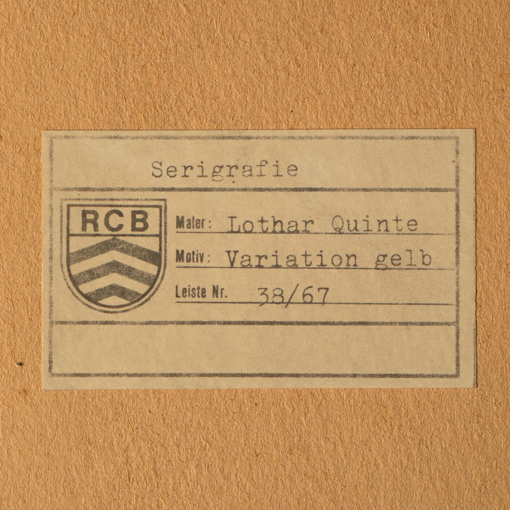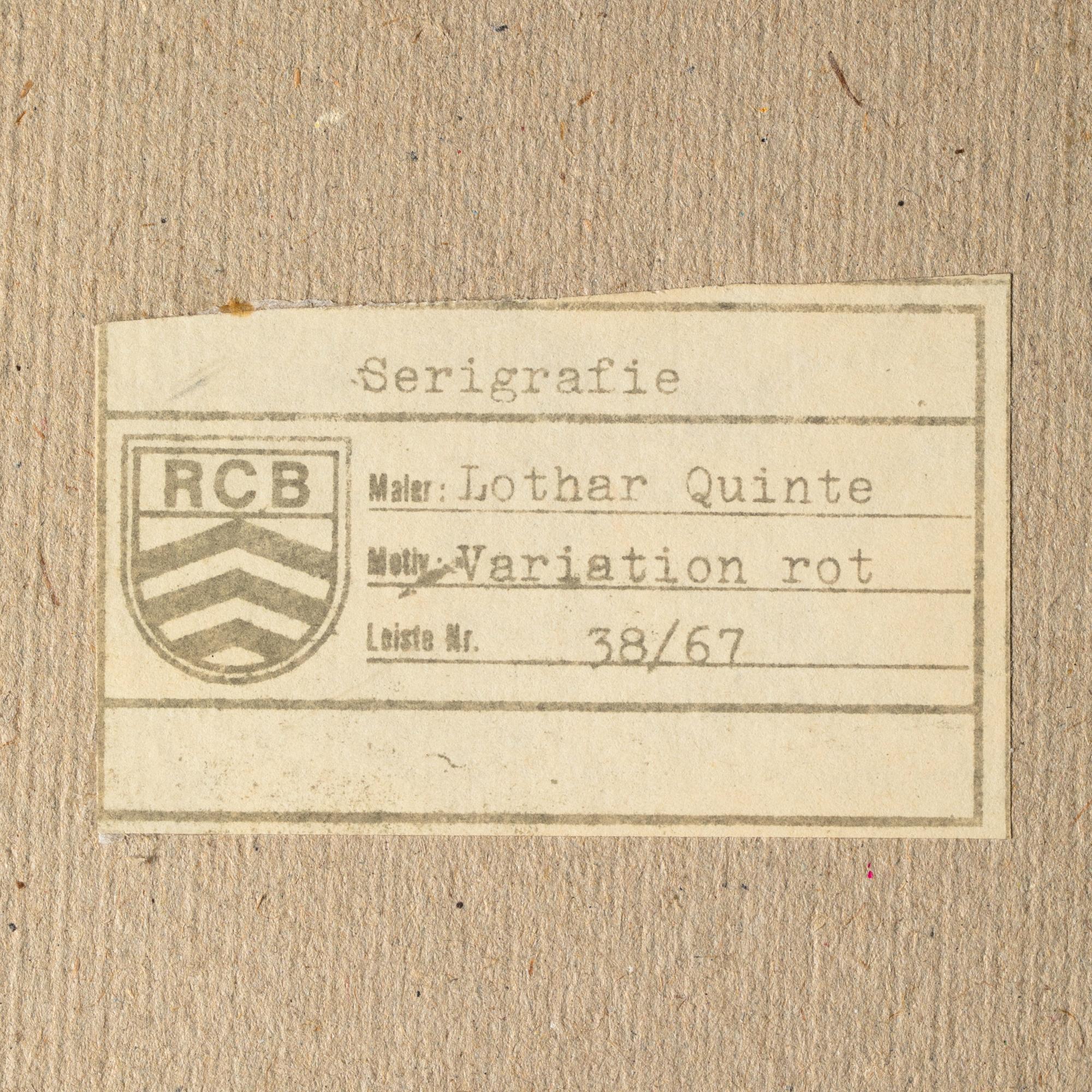 4 Bll. Farbserigraphien. 18 x 18 cm. 'Corona Gelb' (c.1973). 'Variation Rot' (1973). 'Quasar Orange' (1974). 'Variation Blau' (c.1973). Hinter Glas gerahmt und so beschrieben. Jeweils auf Klebeetikett bezeichnet und nummeriert: Lothar Quinte / 38/67.