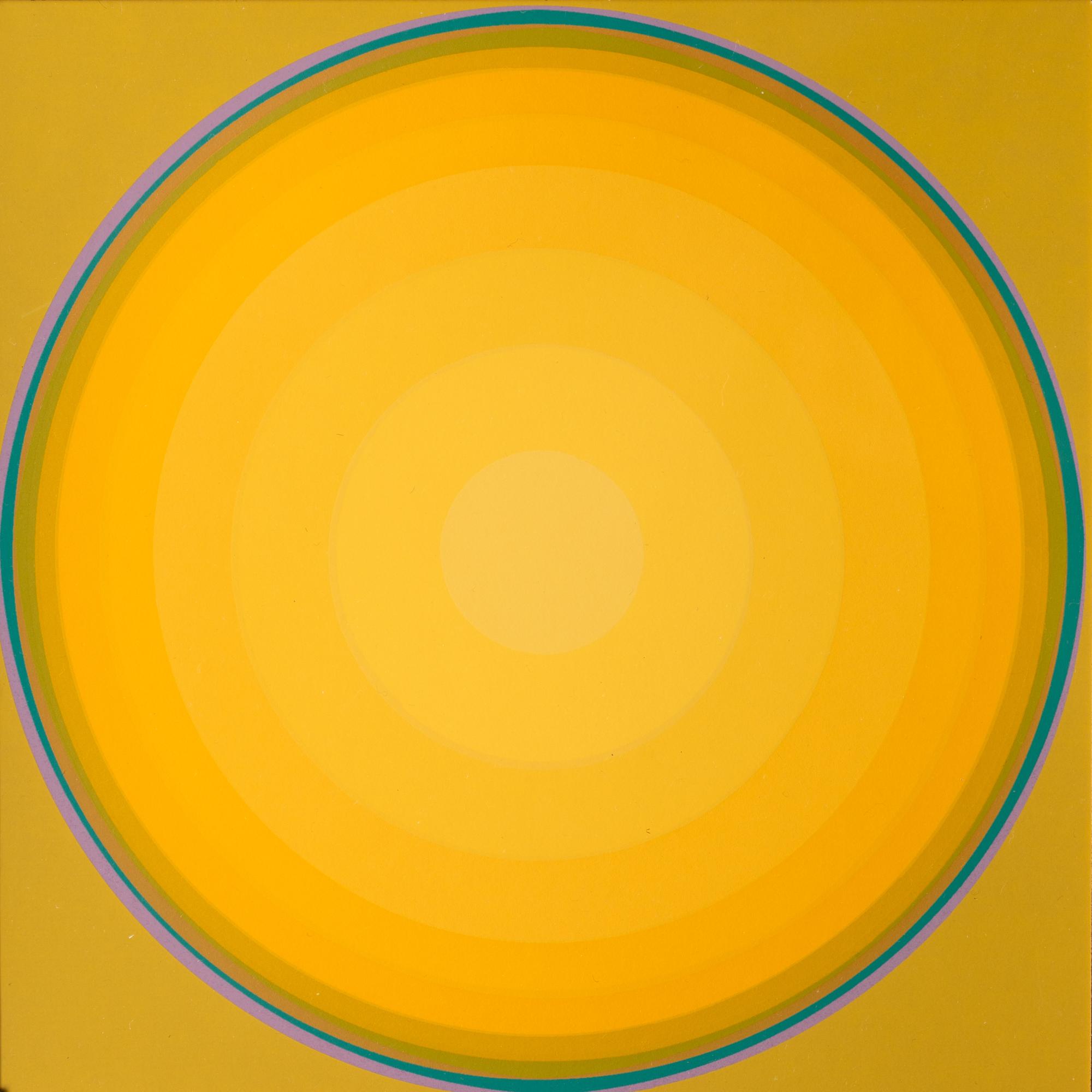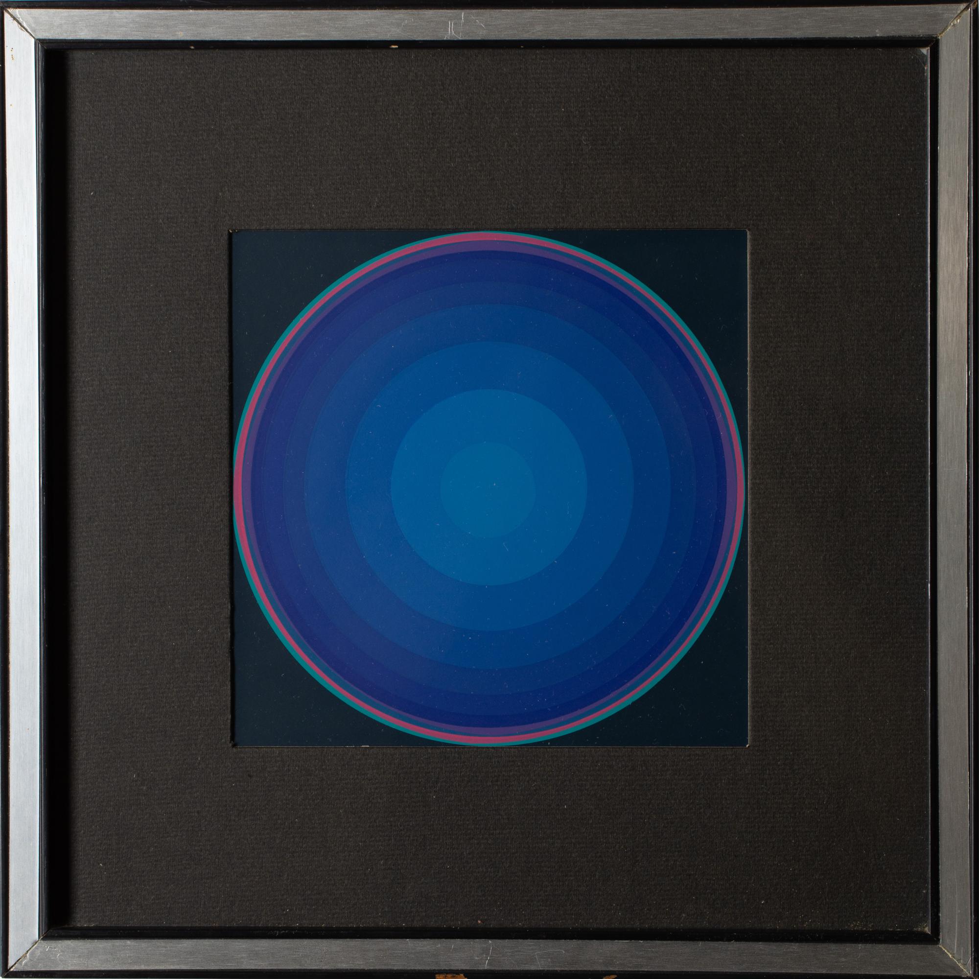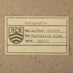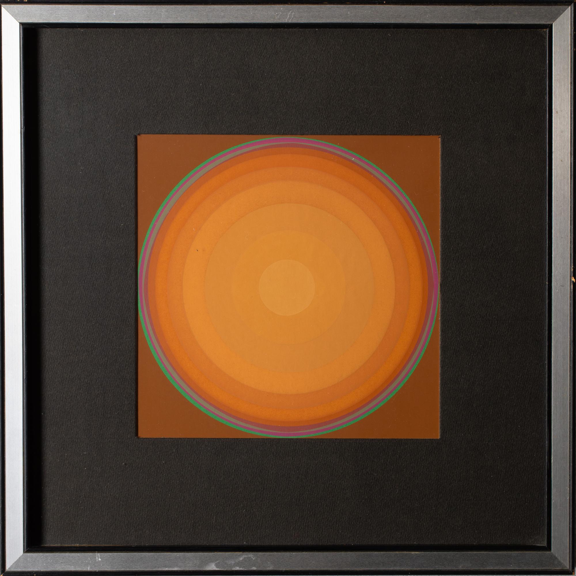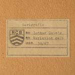4 Bll. Farbserigraphien. 18 x 18 cm. 'Corona Gelb' (c.1973). 'Variation Rot' (1973). 'Quasar Orange' (1974). 'Variation Blau' (c.1973). Hinter Glas gerahmt und so beschrieben. Jeweils auf Klebeetikett bezeichnet und nummeriert: Lothar Quinte / 38/67.