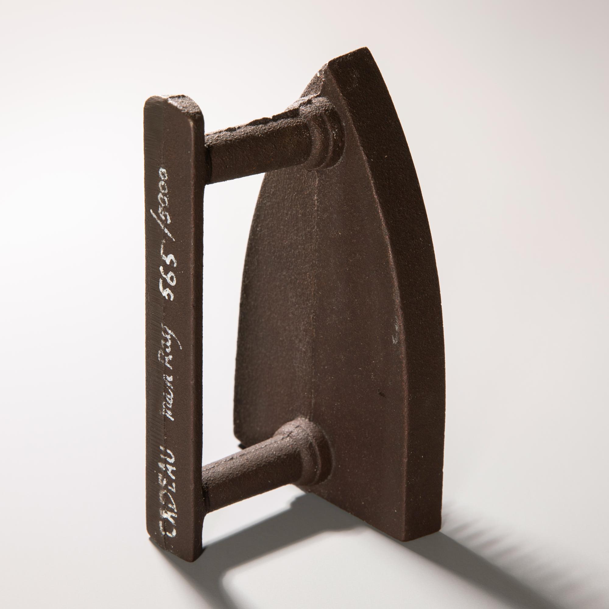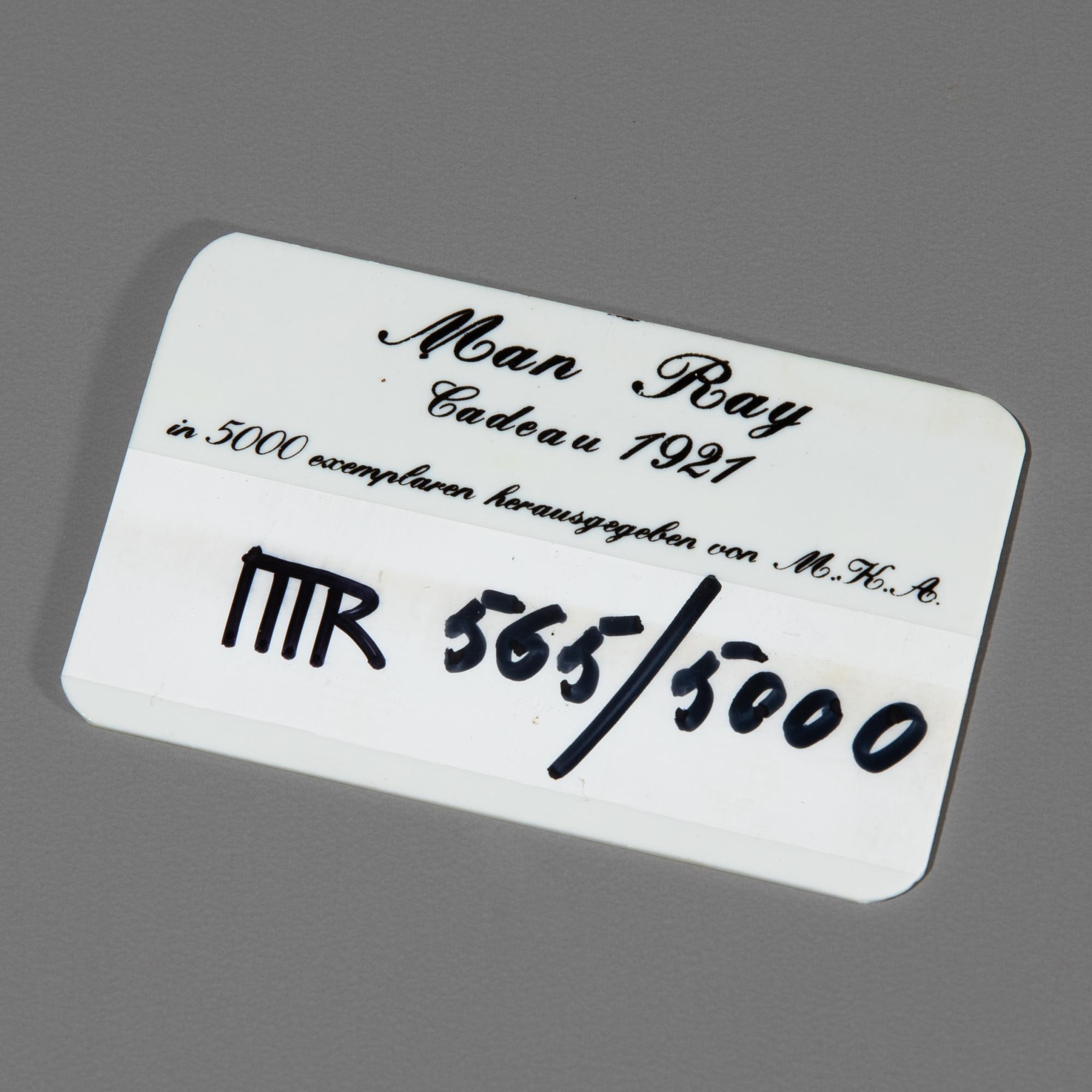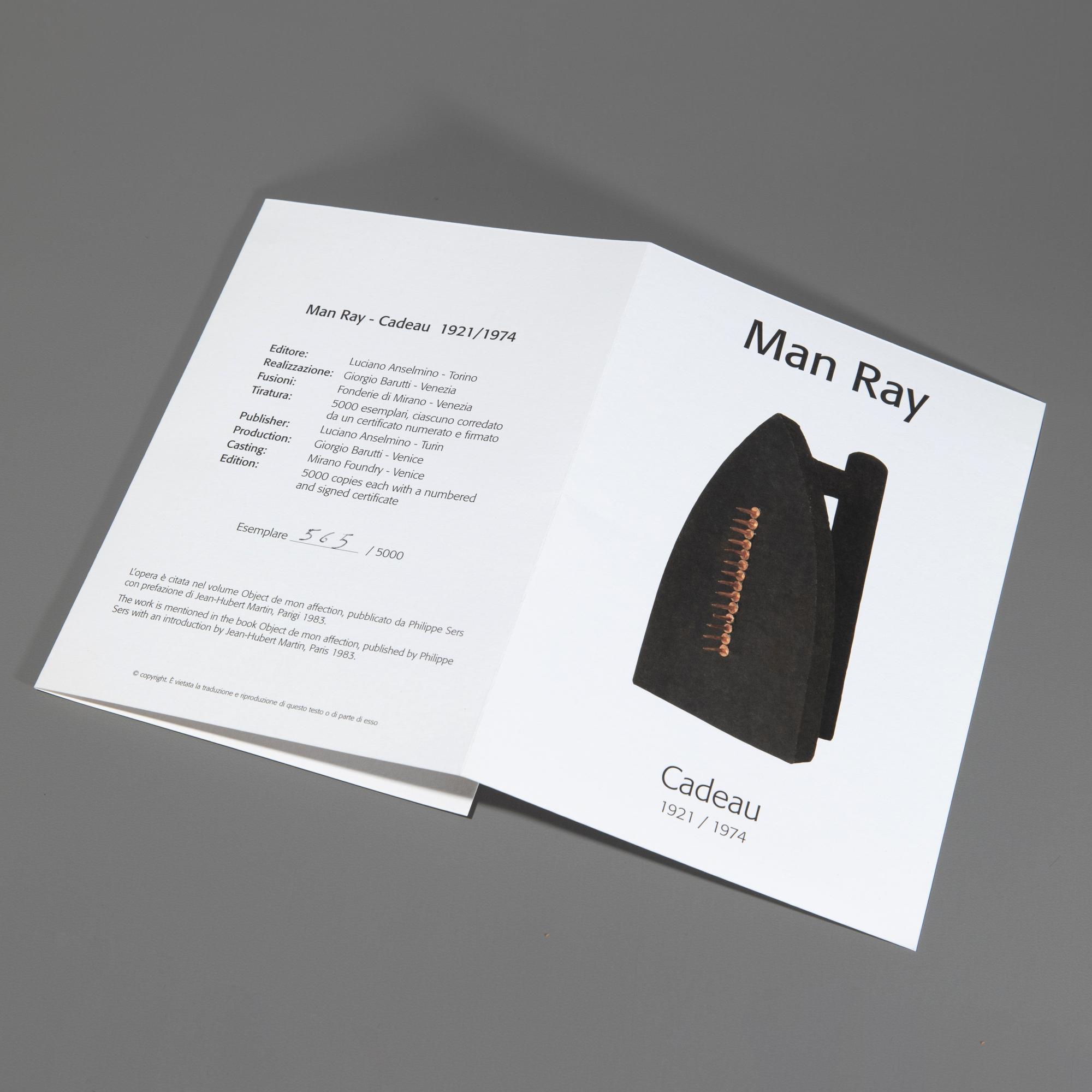 Eisenguss mit montierten Kupfernägeln. 16,5 x 10 x 8 cm. Auf dem Griff mit weißer Farbe bezeichnet, signiert und nummeriert: CADEAU Man Ray 565/5000. Ebenfalls auf beiliegender Editionskarte bezeichnet, mit Filzstift monogrammiert und nummeriert: Man Ray/ Cadeau 1921/ in 5000 Exemplaren herausgegeben von M.K.A./ MR 565/5000. Erschienen bei Luciano Anselmino, Turin. Gegossen bei Mirano Foundry, Venedig. Nummeriertes Begleitheft beiliegend.
