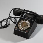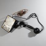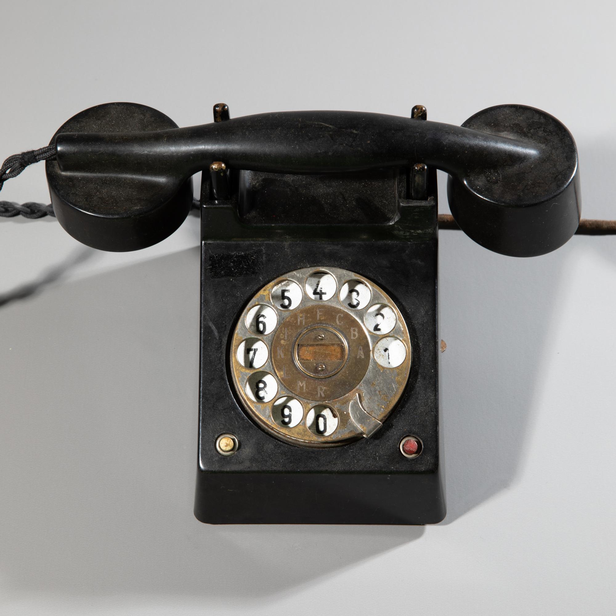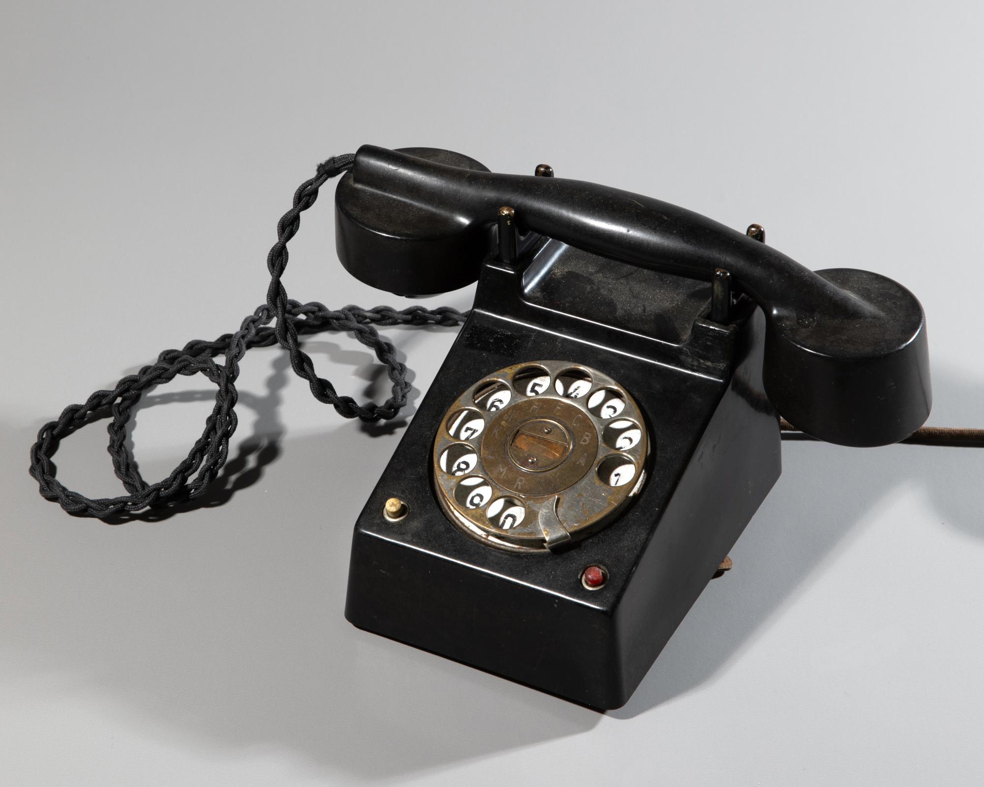 Entwurf 1927. Ausführung H. Fuld & Co. Schwarz lackiertes und vernickeltes Metall, Bakelit, Stoffkabel. 13 x 24 x 17 cm. 1926 bekam Harry Fuld den Auftrag für die Produktion eines Telefons mit dem Modellnamen Frankfurt für die Neue Siedlung Frankfurt. Für den Entwurf beauftragte er Marcel Breuer (Hörer) und Richard Schadewell (Gehäuse).