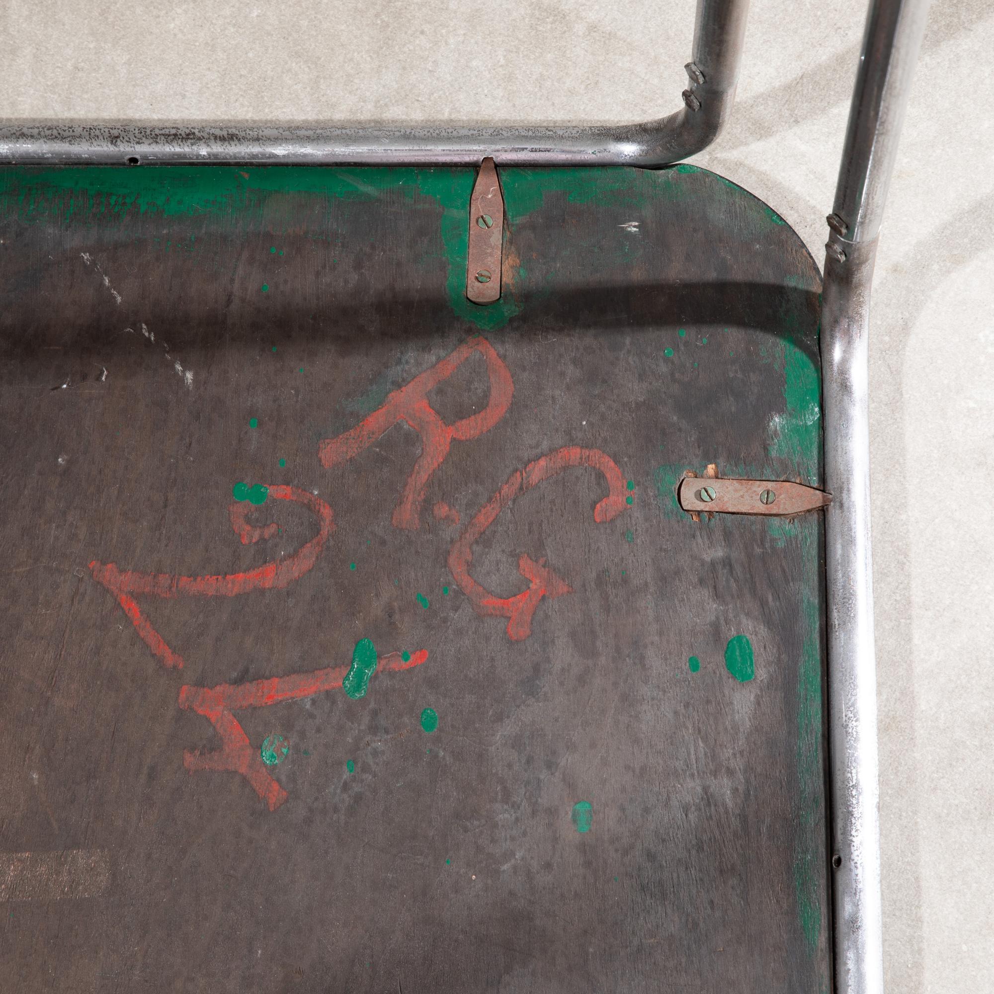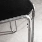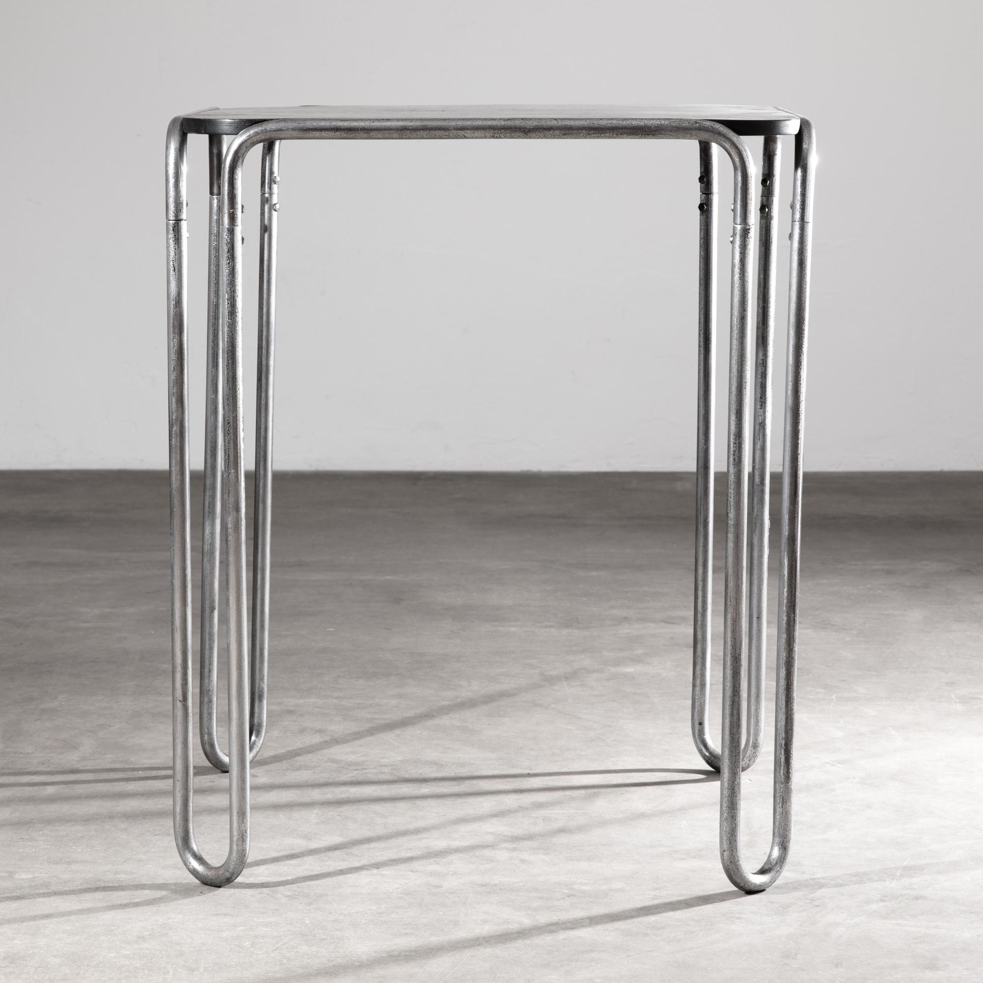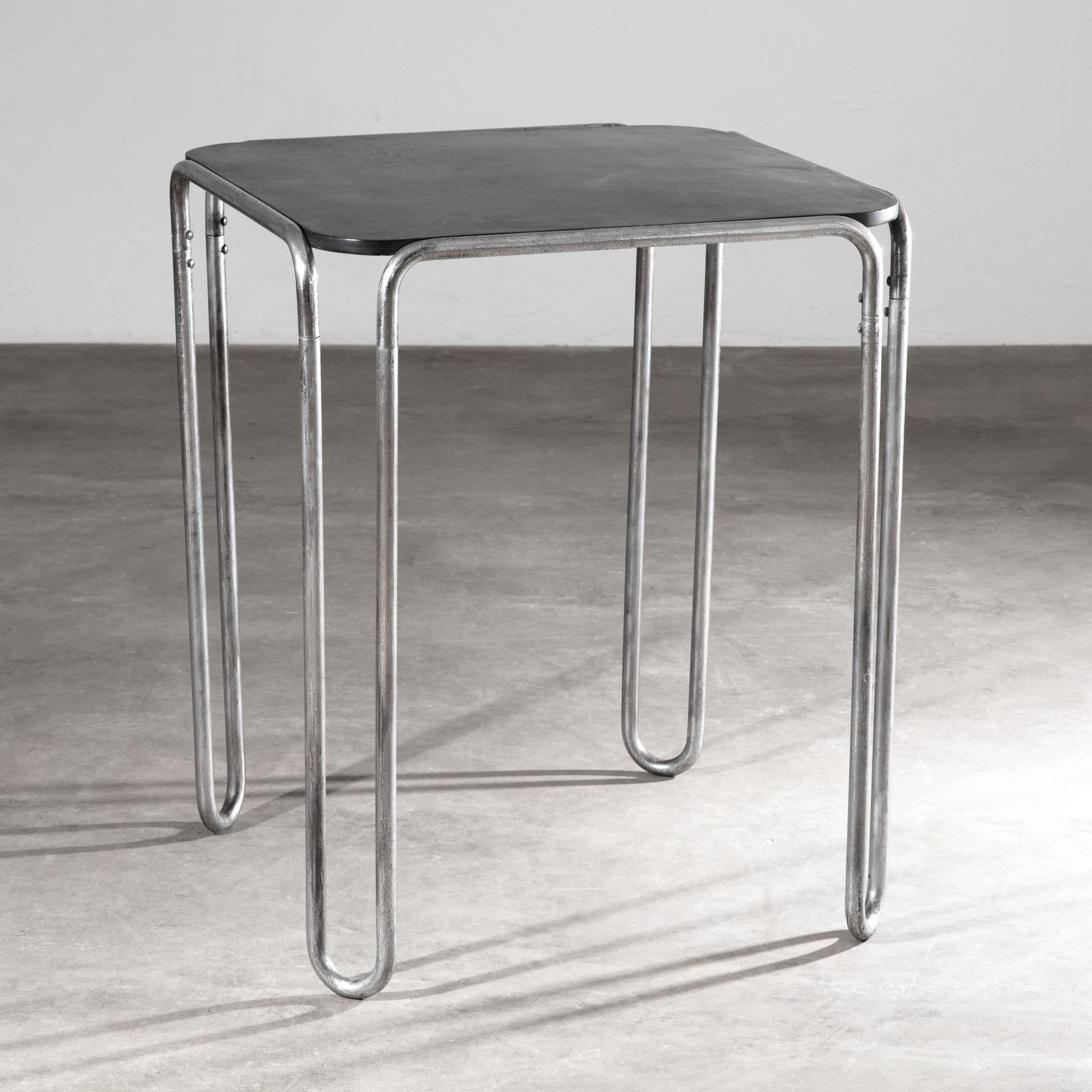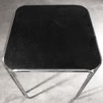 Entwurf 1927. Ausführung 1929/30 in der Zeit des Überganges von der Standard Möbel Produktion zu Thonet. Verchromtes Stahlrohr, schwarz laminierte Tischlerplatte. Die Beine sind im oberen Bereich mit Sechskantschrauben, doppelt verschraubt. Die Platte ist mit Spangen befestigt. Die Höhe weicht vom Standardmaß ab und hat mit 75 cm Esstischhöhe. H. 75 x 63 x 63 cm.