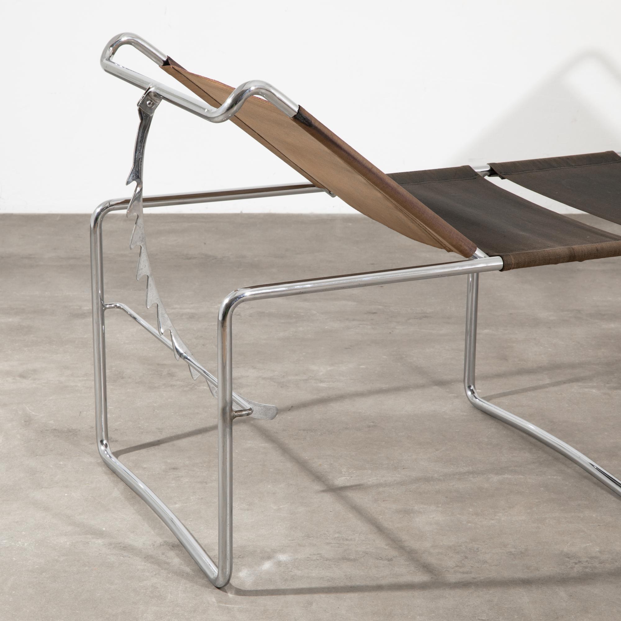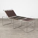 Entwurf 1930/31. Ausführung Thonet 1930er Jahre. Verchromtes Stahlrohr, Bespannung aus Eisengarnstoff. 52,5-90 x 181 x 70,5 cm. Ein Set neuerer Bezüge in Eisengarn liegt bei.