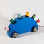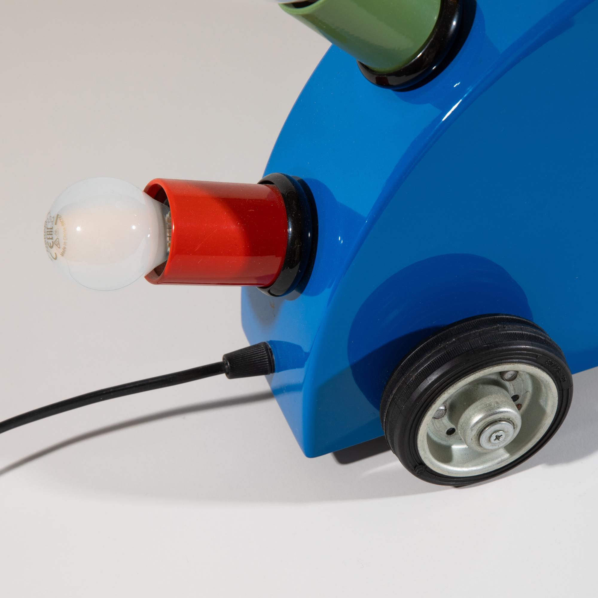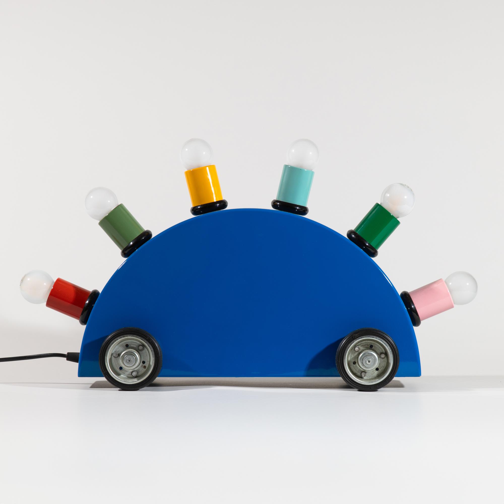 Entwurf 1981. Ausführung Memphis. Lackiertes Fiberglas und Metall, Räder. Unterseitig mit transparenter Acrylabdeckung. 32 x 60 x 18 cm.