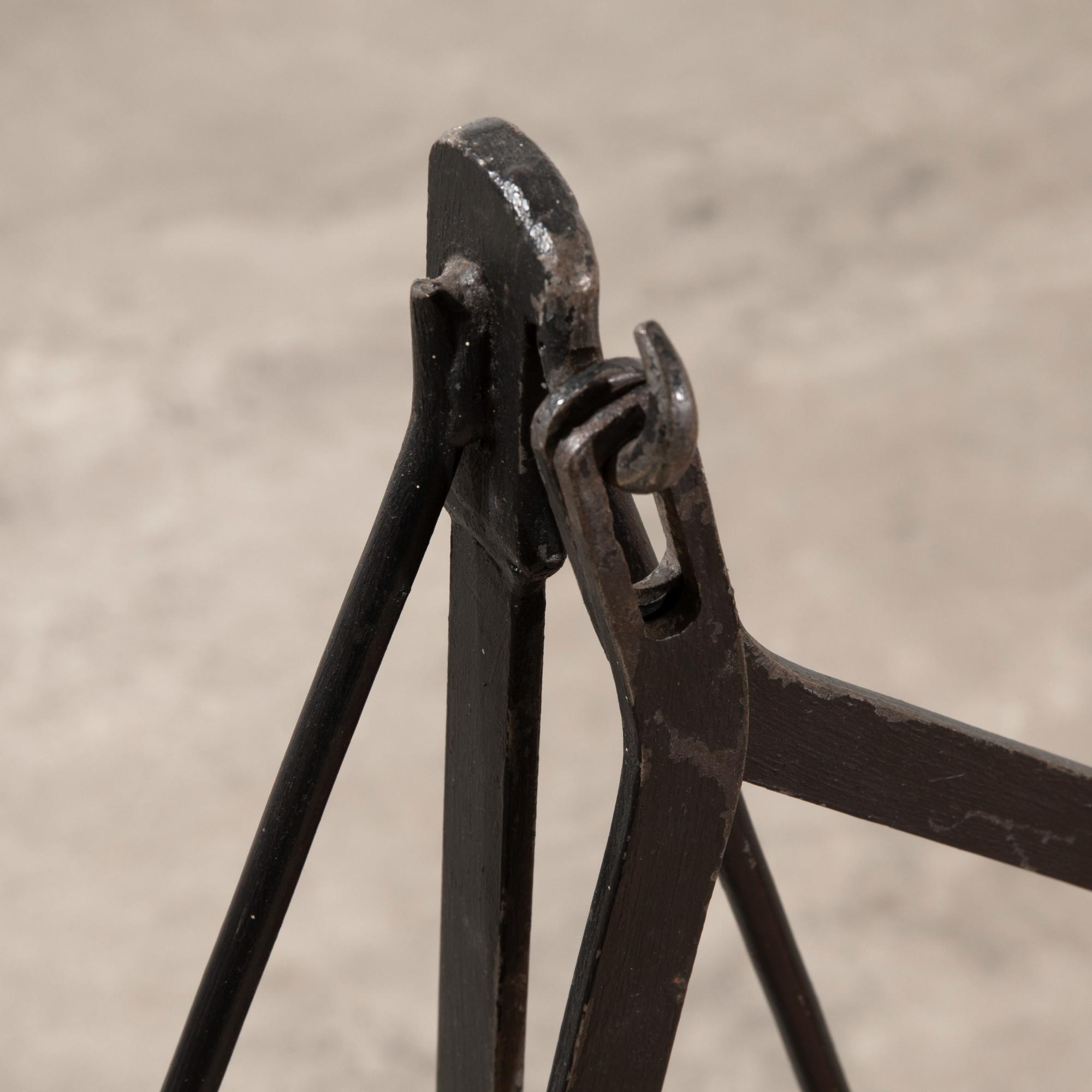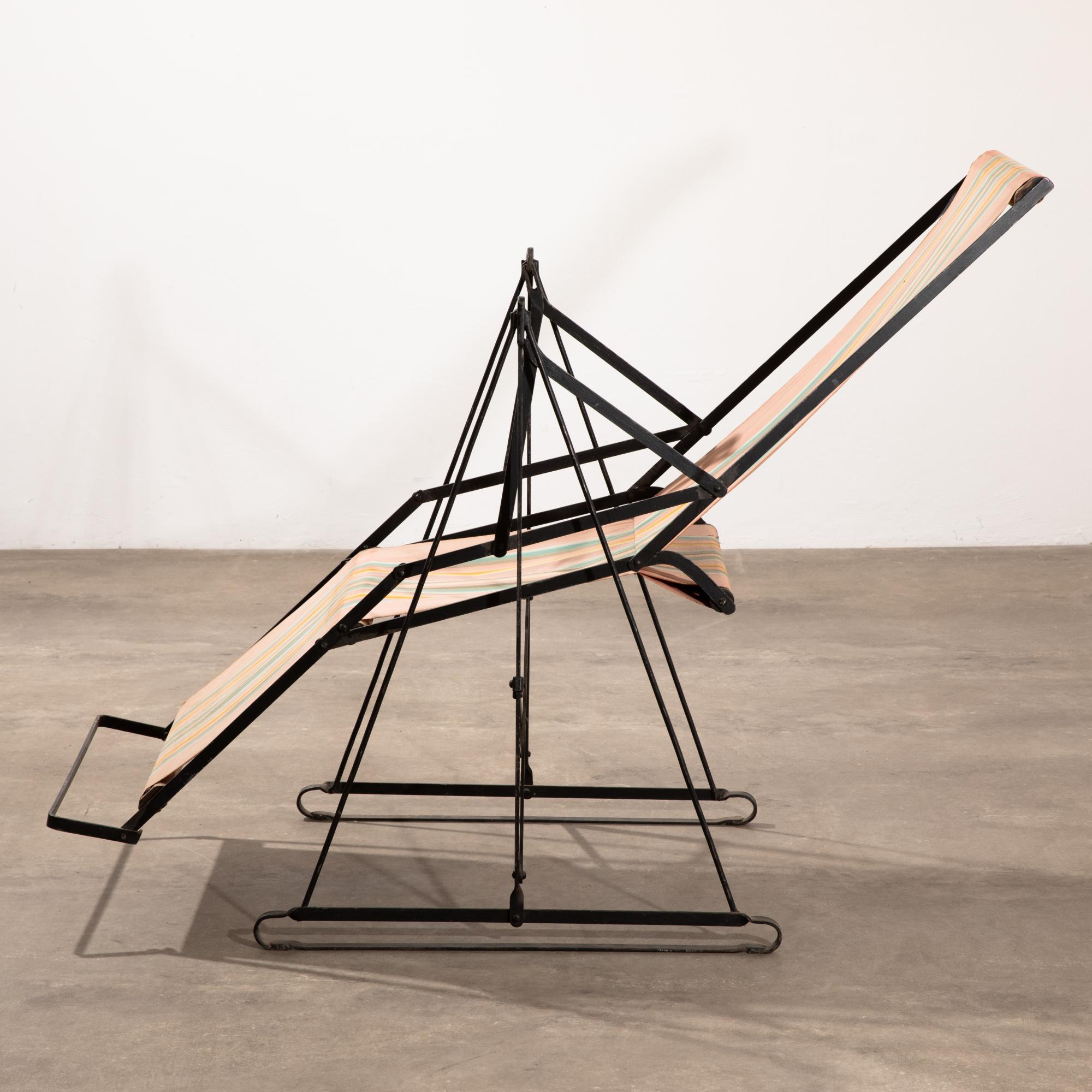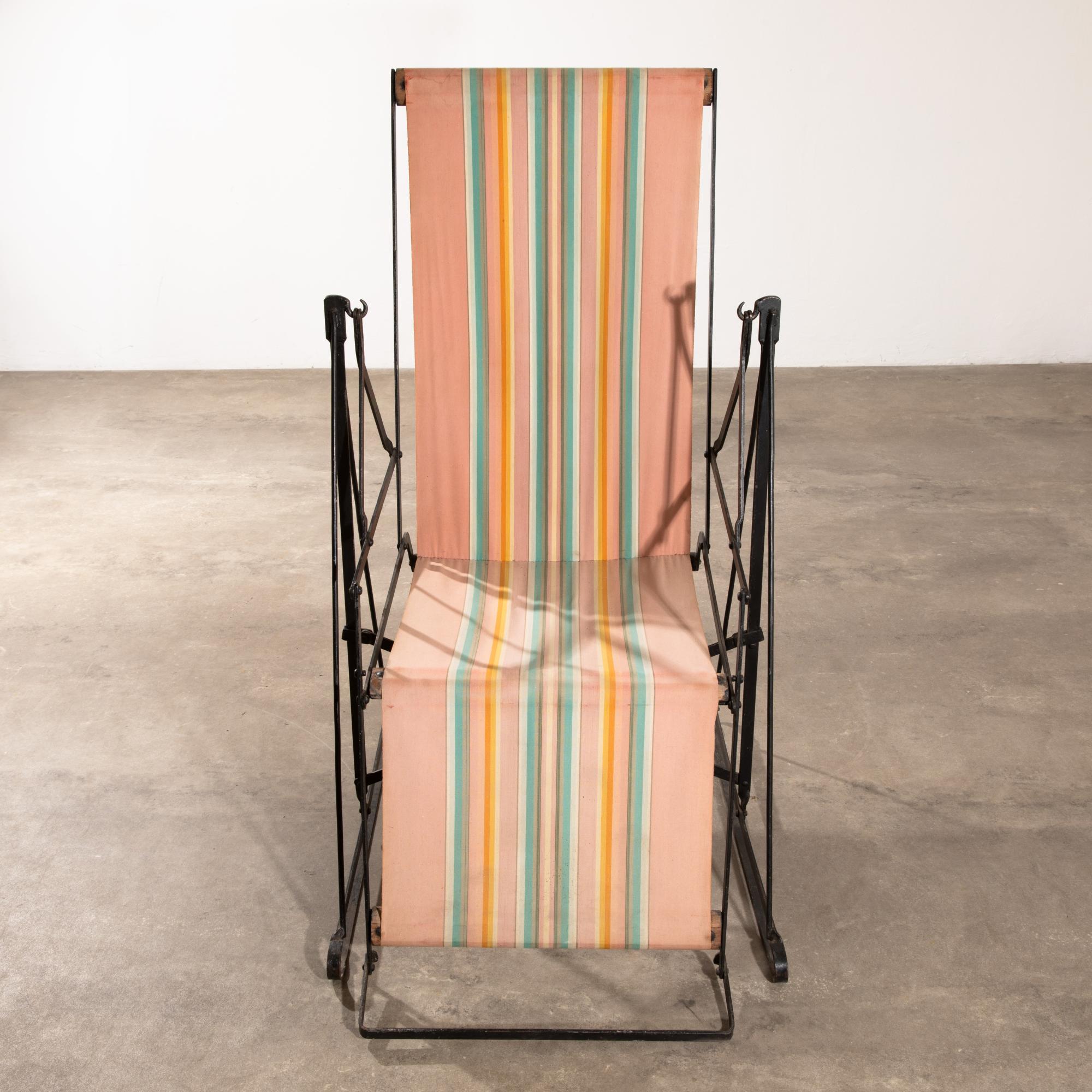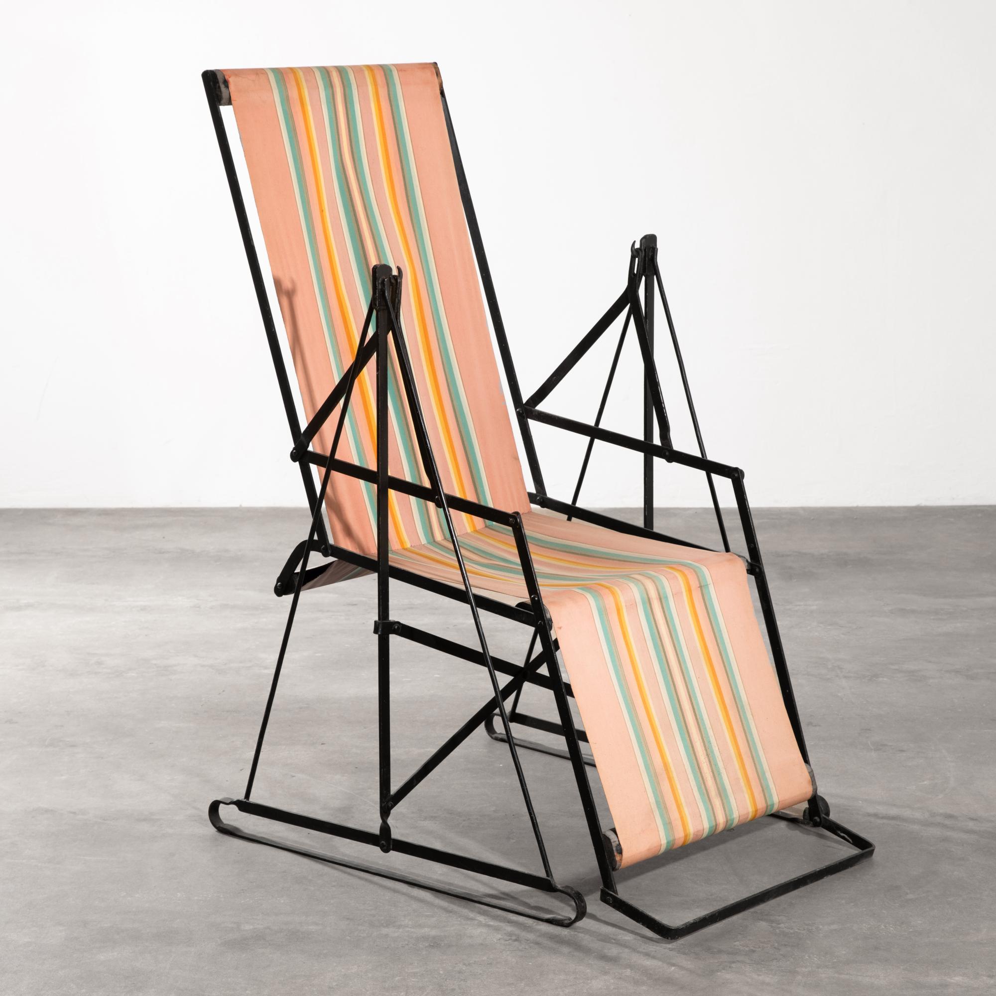 Entwurf und Ausführung Metz & Co. 1930er Jahre. Klappbare Konstruktion aus Metall mit Holz und Stoffbespannung. 120 x 66 x 110 cm.