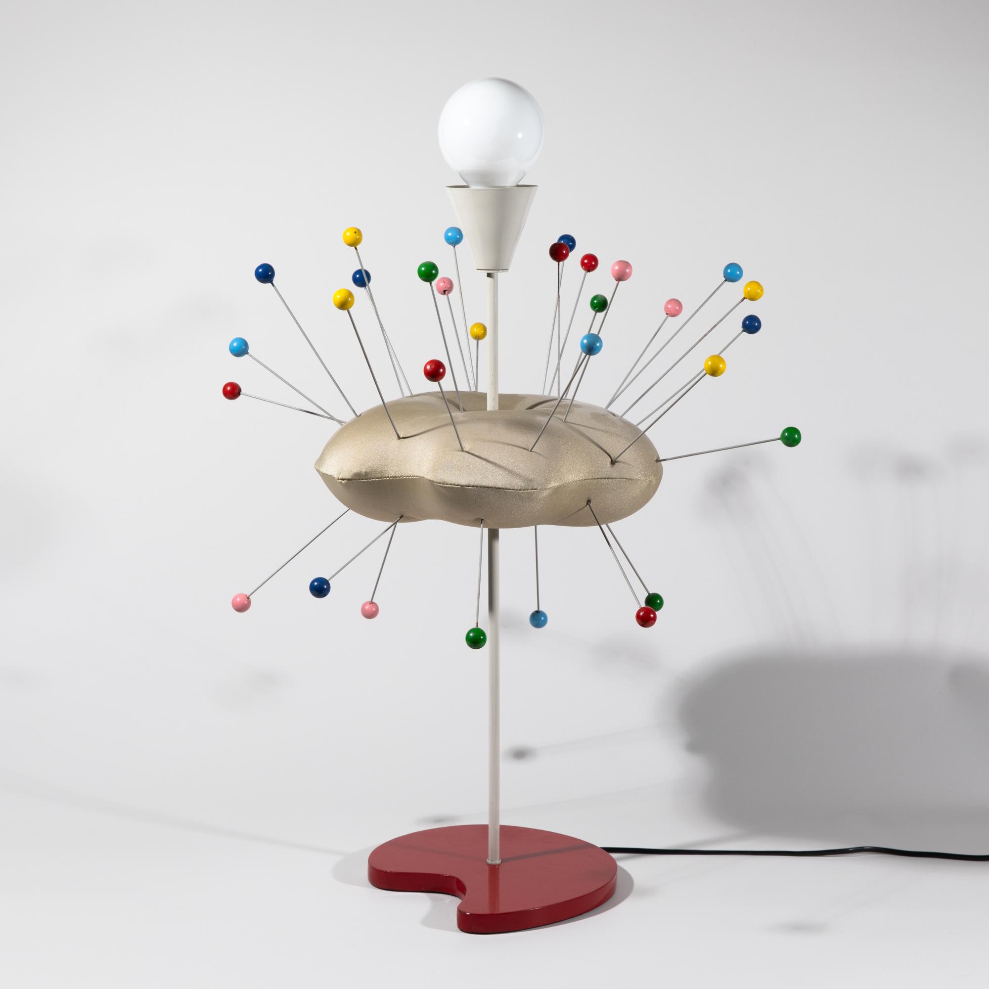 Entwurf 1979 als Teil der bau. haus I Collection. Ausführung Alchimia. Teilweise lackiertes Metall, Stoff, lackiertes Holz. Maße ohne Leuchtmittel: H. 64 cm, D. 55 cm.