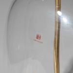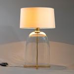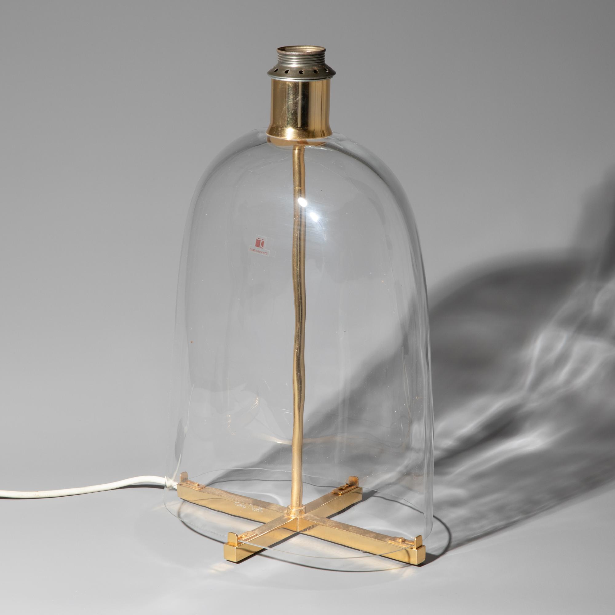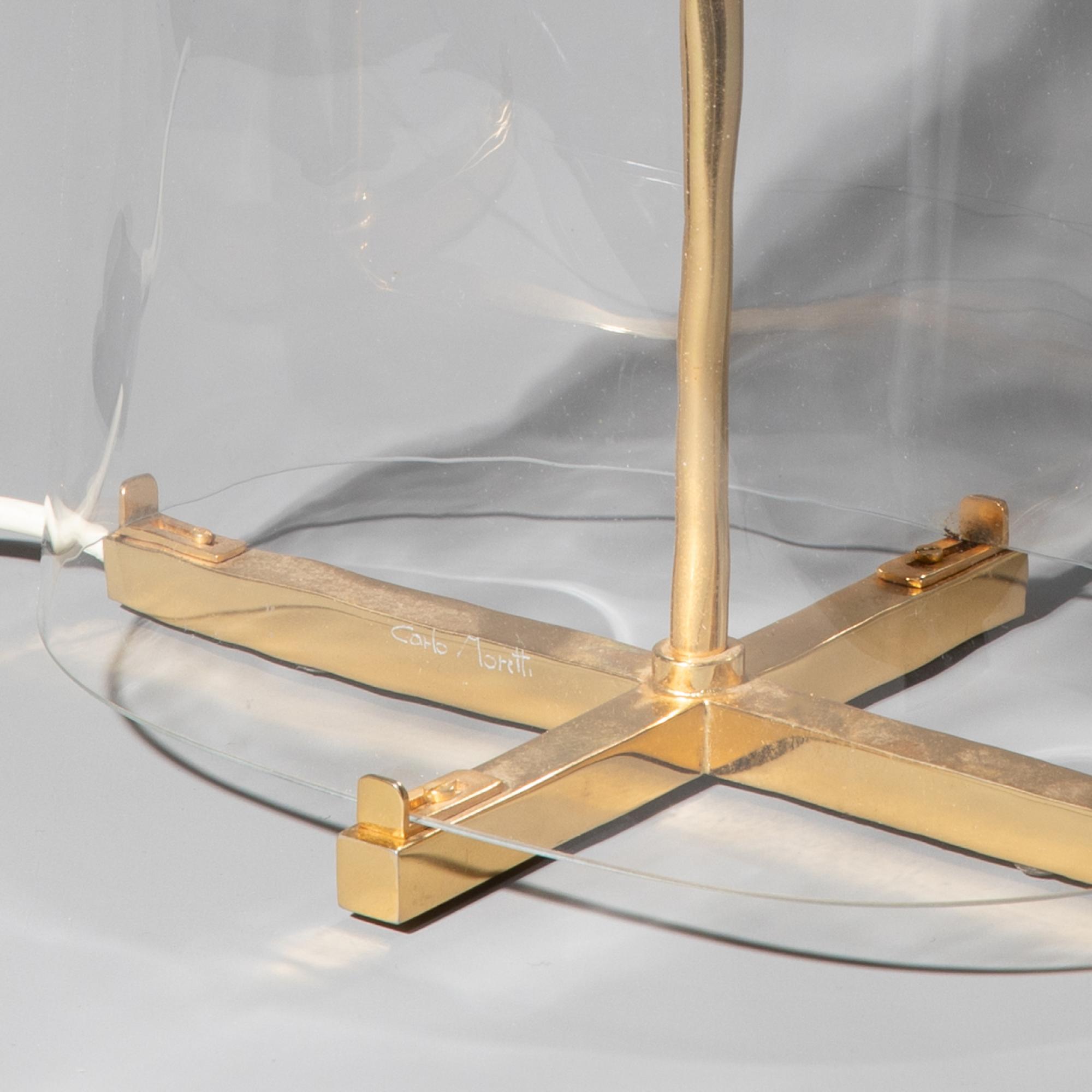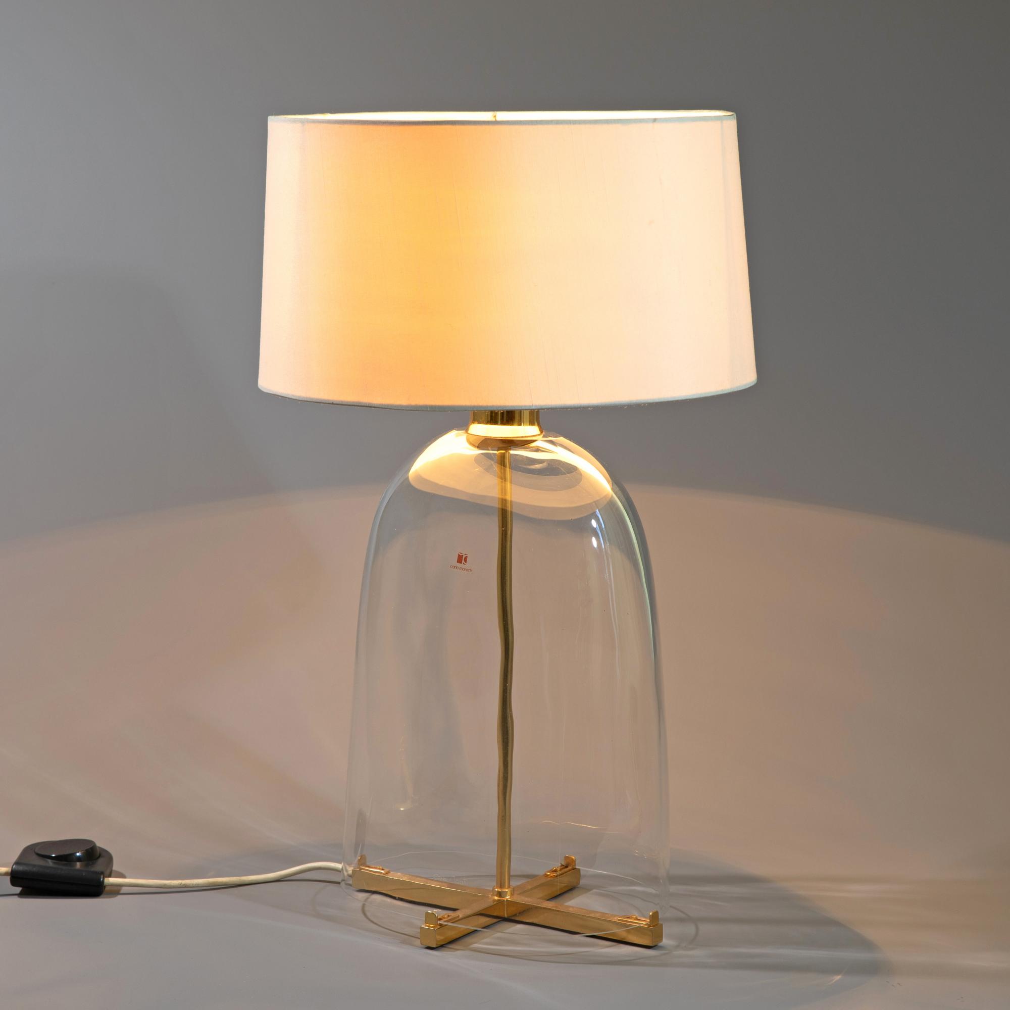 Entwurf 1970er Jahre. Ausführung Carlo Moretti. Messing und klares Glas, Stoffschirm. H. 60 cm, D. 35 cm. Mit Aufkleber bezeichnet.