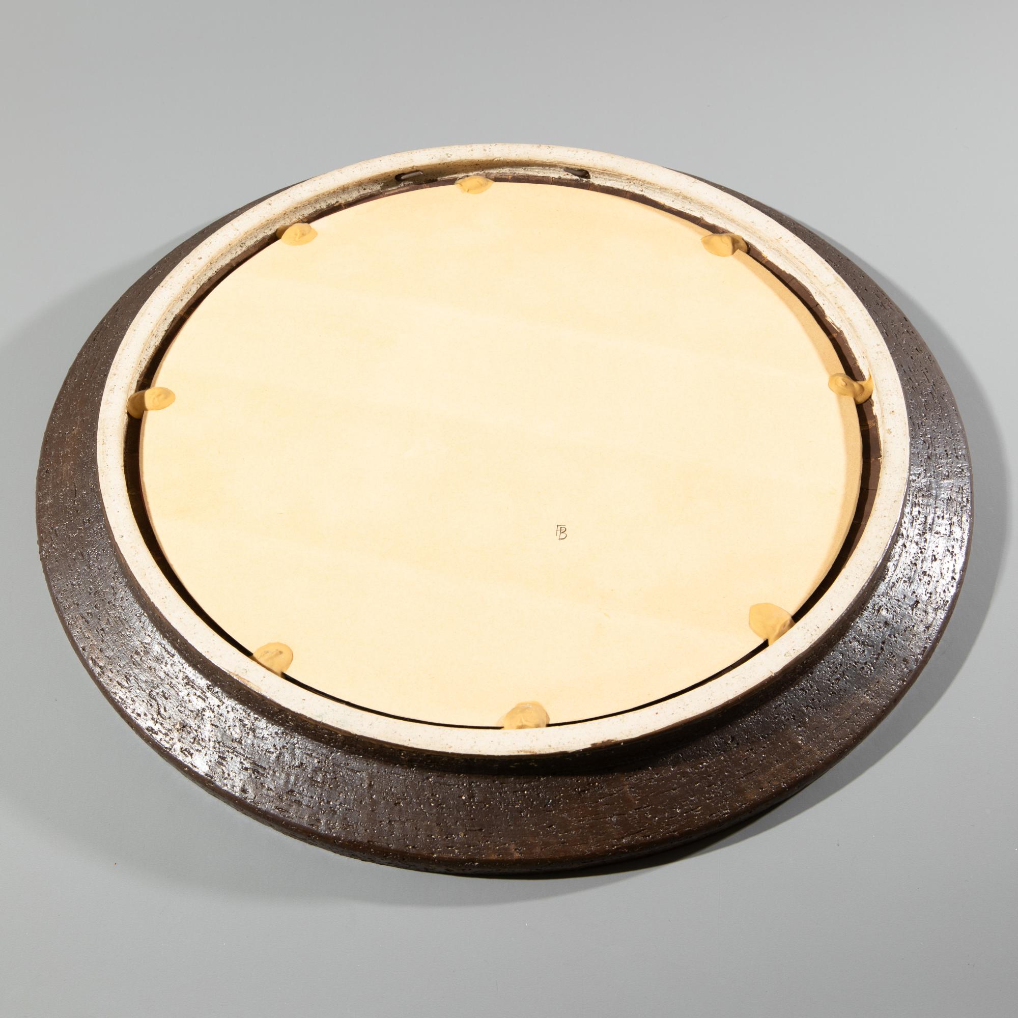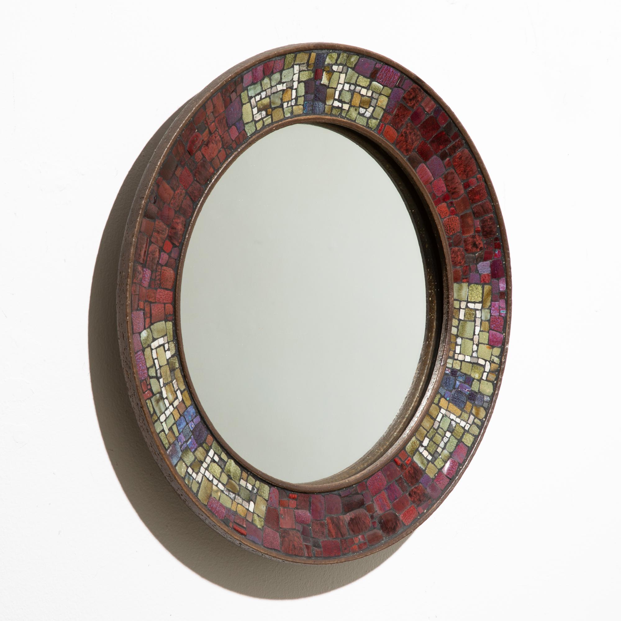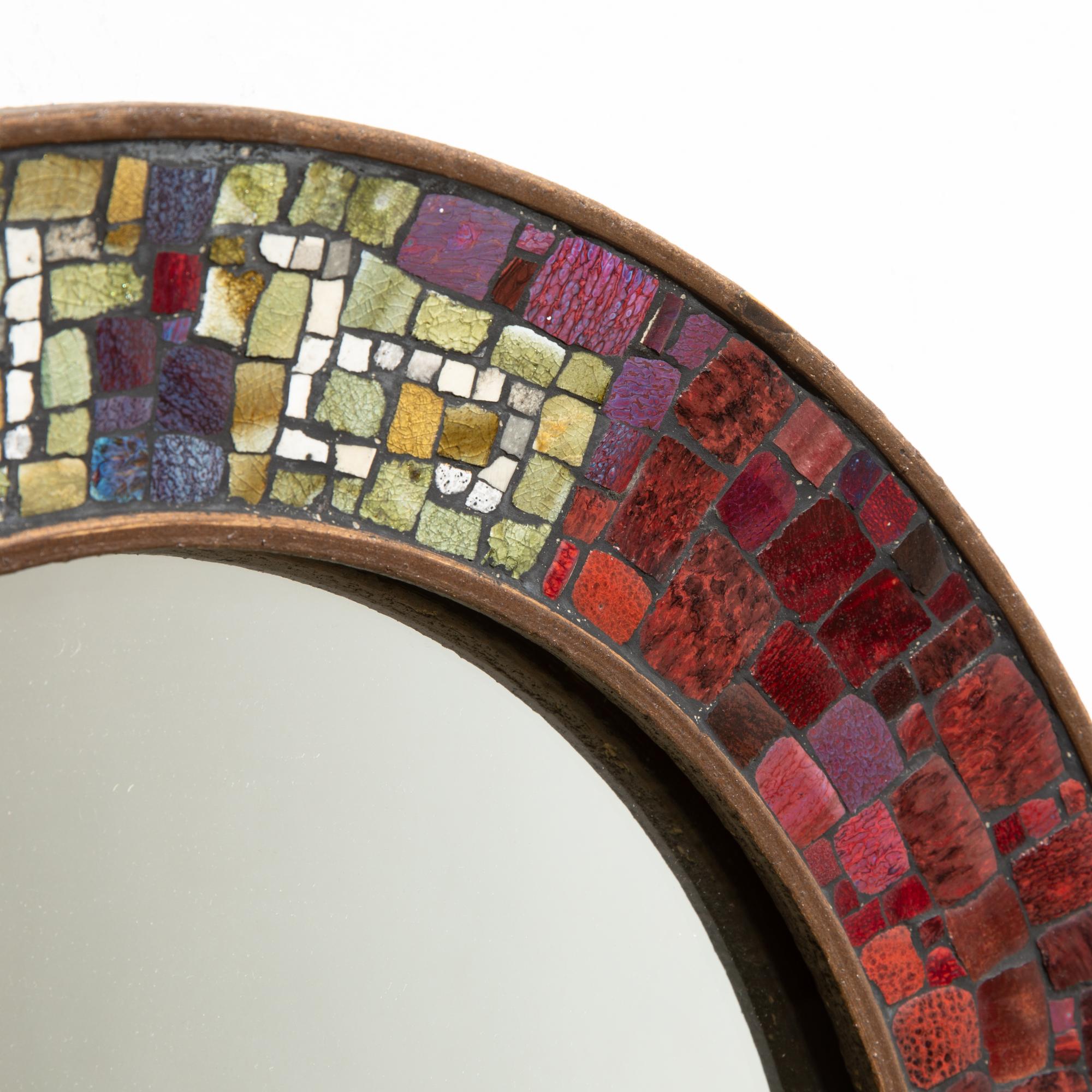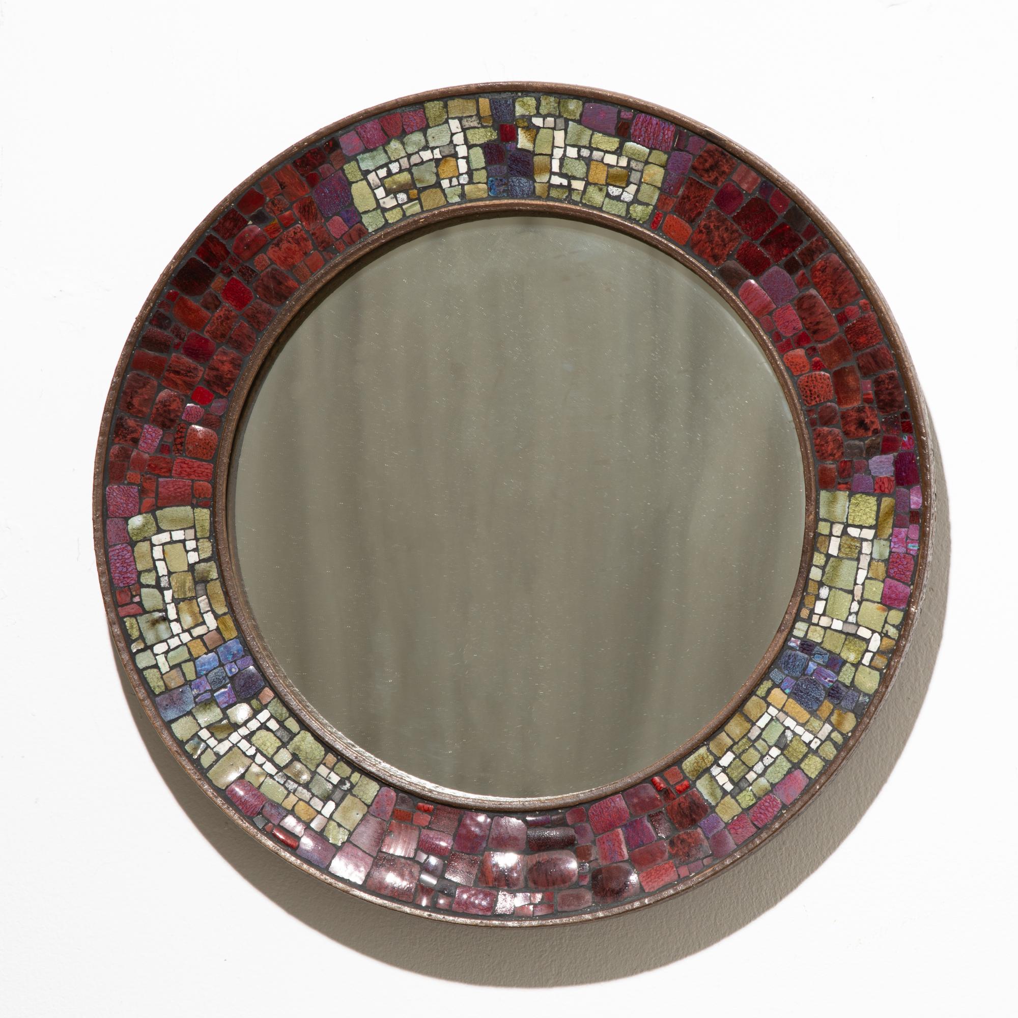 Entwurf und Ausführung um 1960. Keramik, Keramik Mosaik, Spiegelglas. D. 49 cm, T. 5 cm.