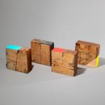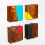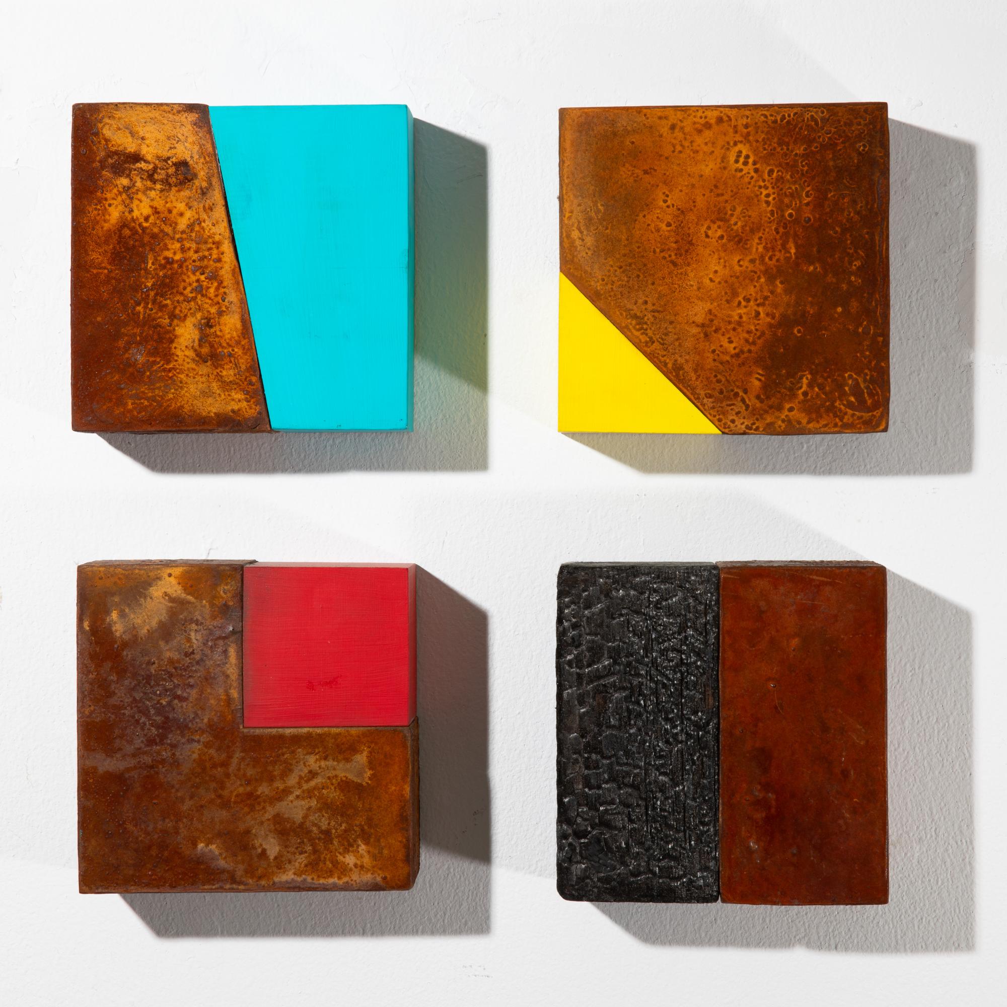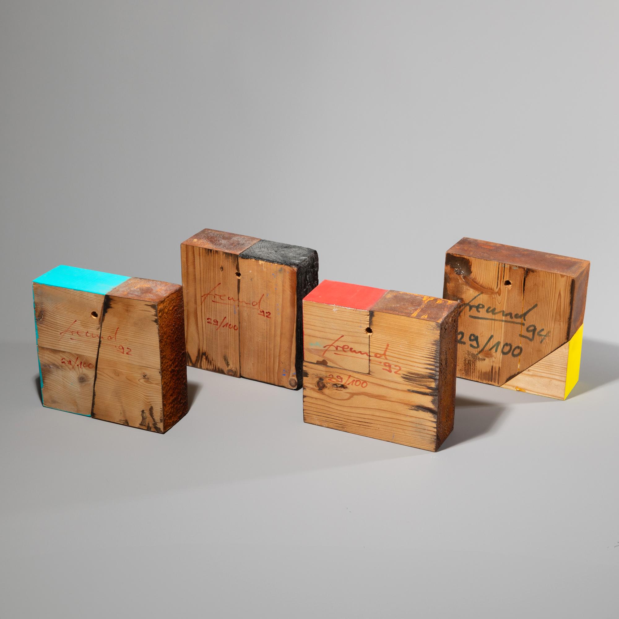 Holzskulptur. Mischtechnik. Jeweils 15 x 15 x 5,5 cm. Verso jeweils signiert und datiert: Freund 92/94. Und jeweils nummeriert: 29/100.