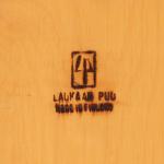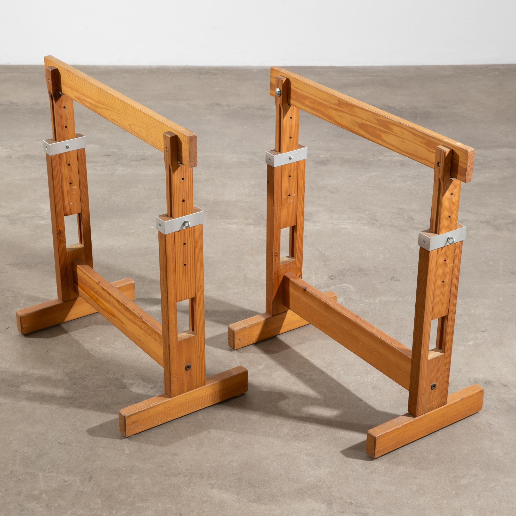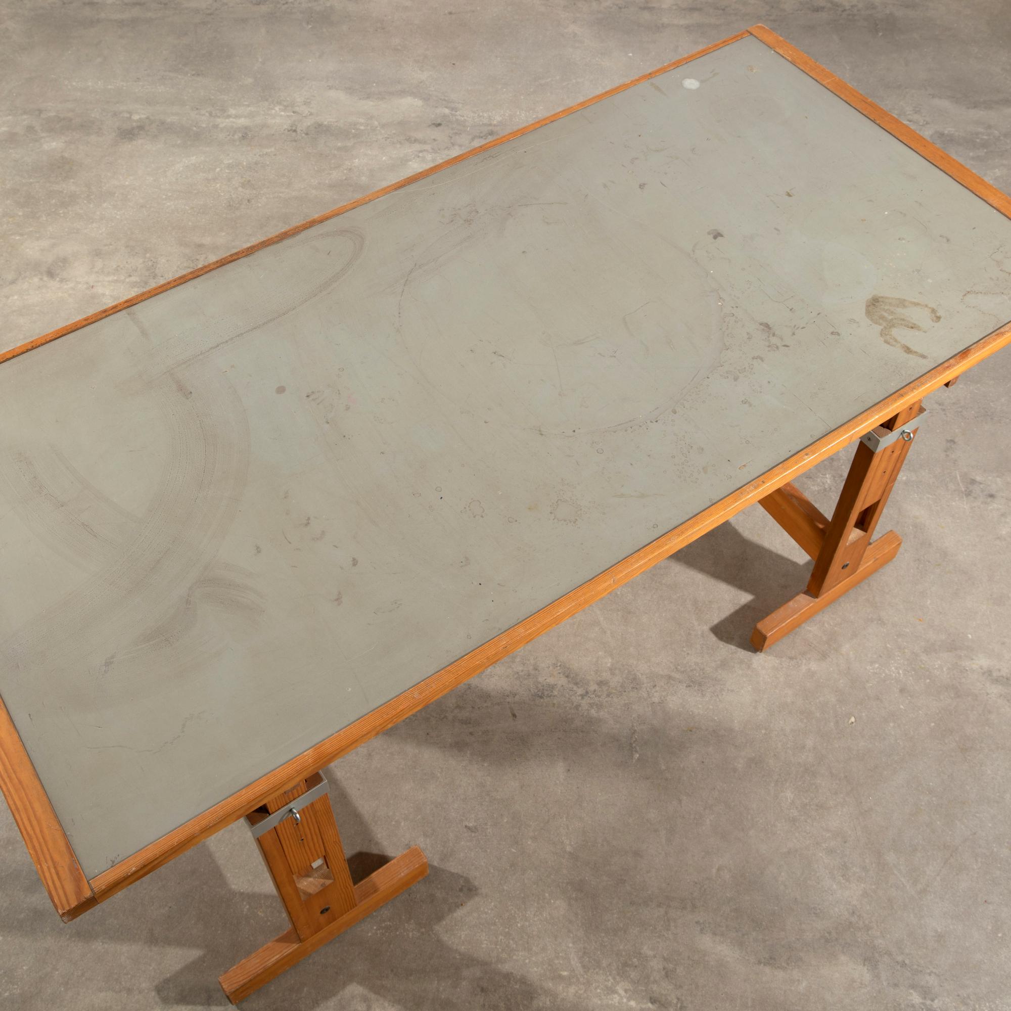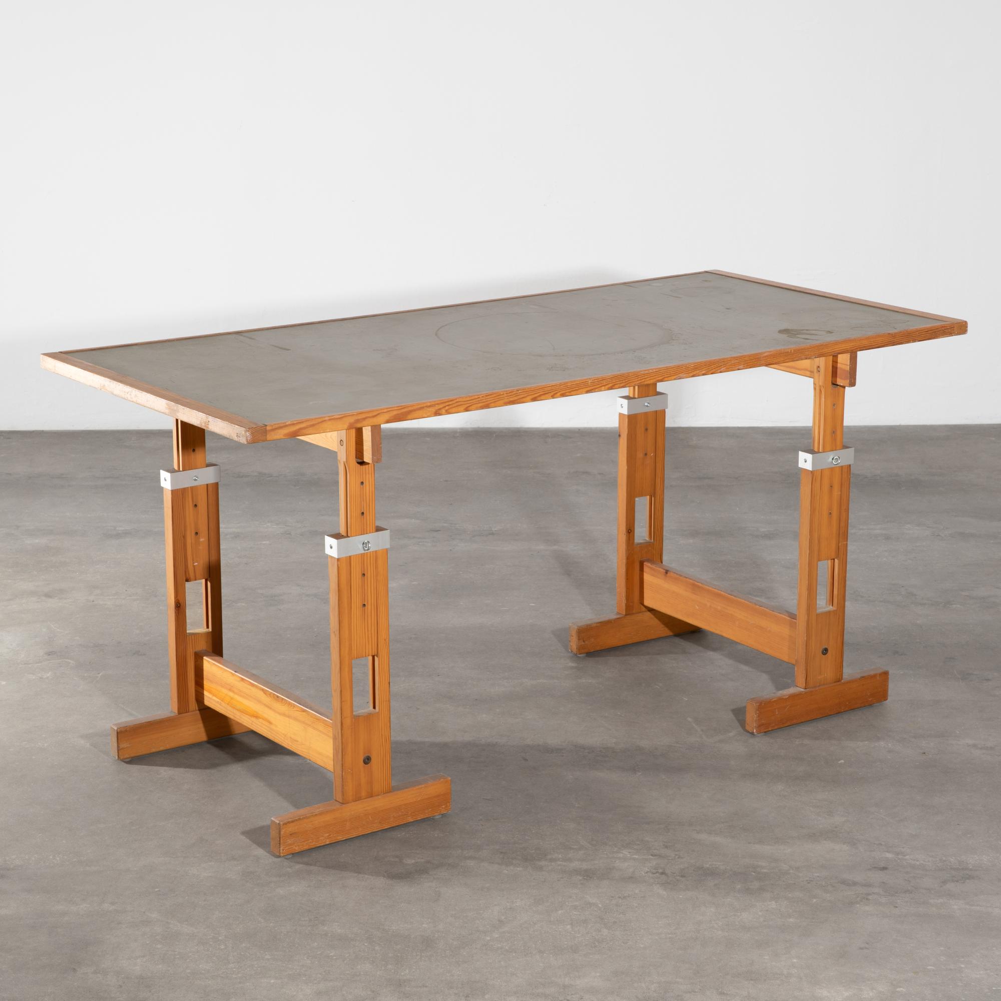 Entwurf 1970er Jahre. Ausführung Laukaan Puu. Holz, Aluminium, Linoleum. Höhe in fünf Stufen verstellbar 62-82 cm, B. 150, T. 70 cm. Unter der Platte mit Brandstempel bezeichnet.