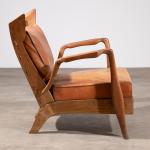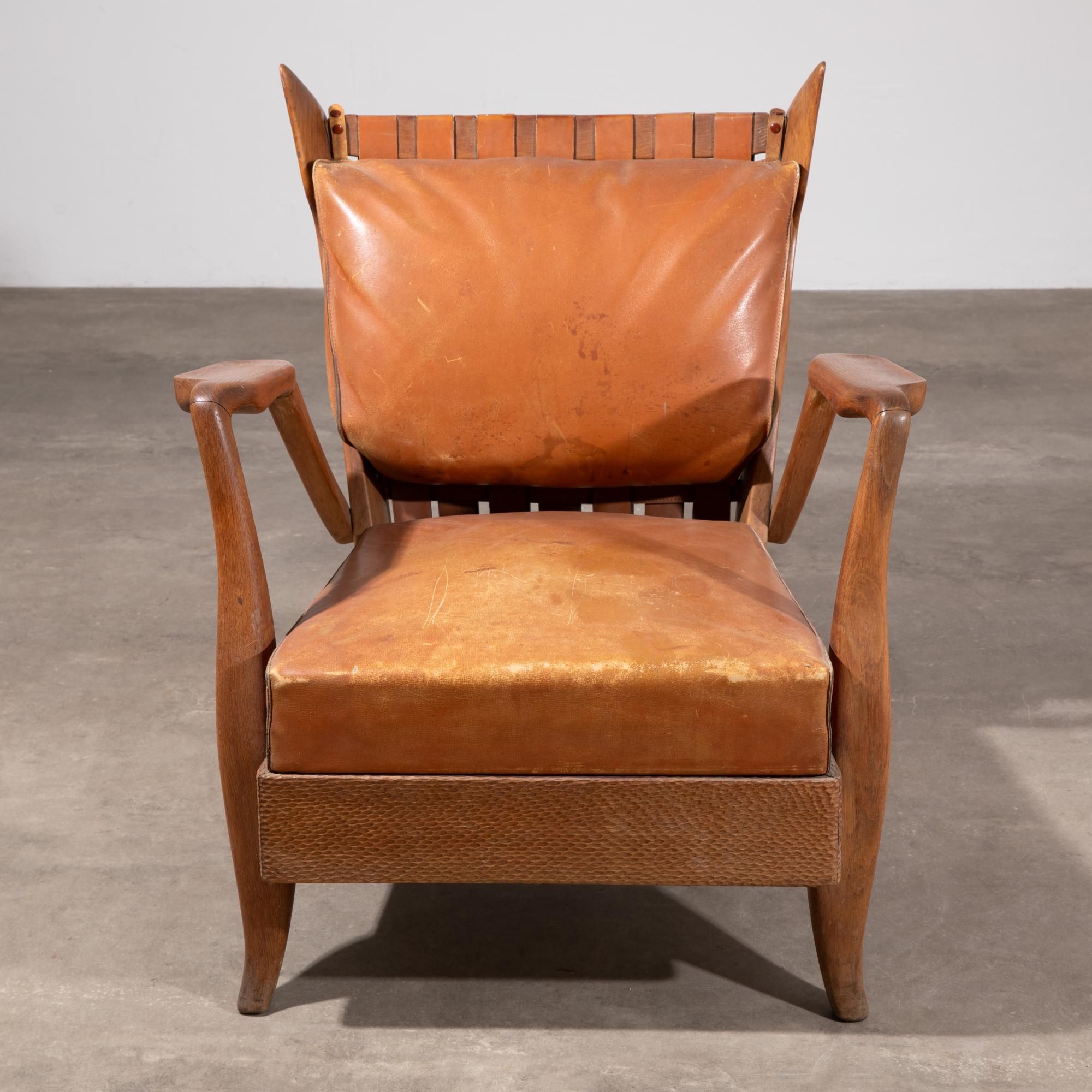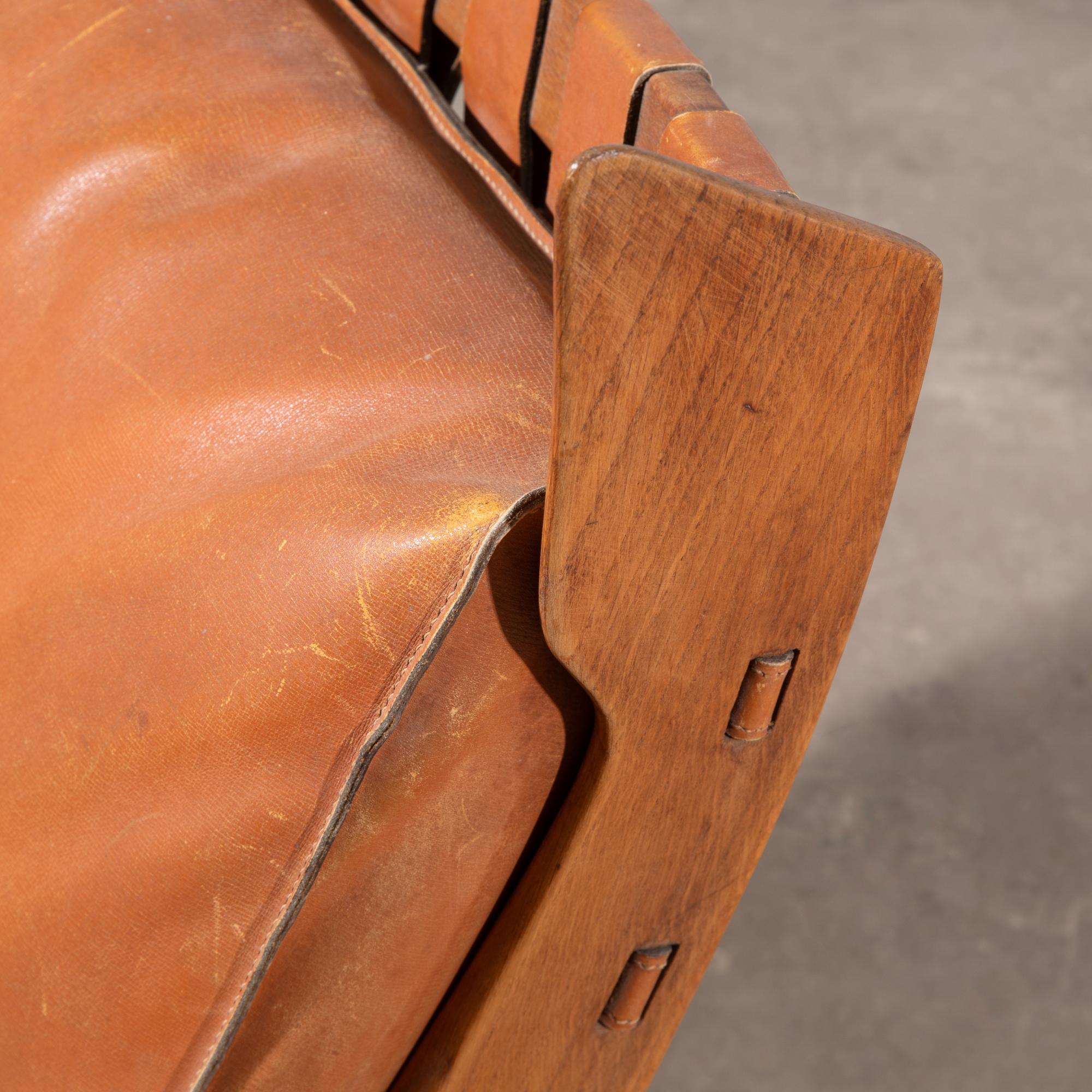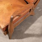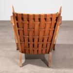 Entwurf und Ausführung 1940/50er Jahren. Teilweise organisch ausgearbeitetes Gestell aus massivem Holz, Ledergurte, Leder. 89 x 80 x 88 cm.