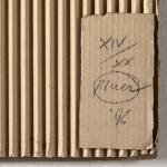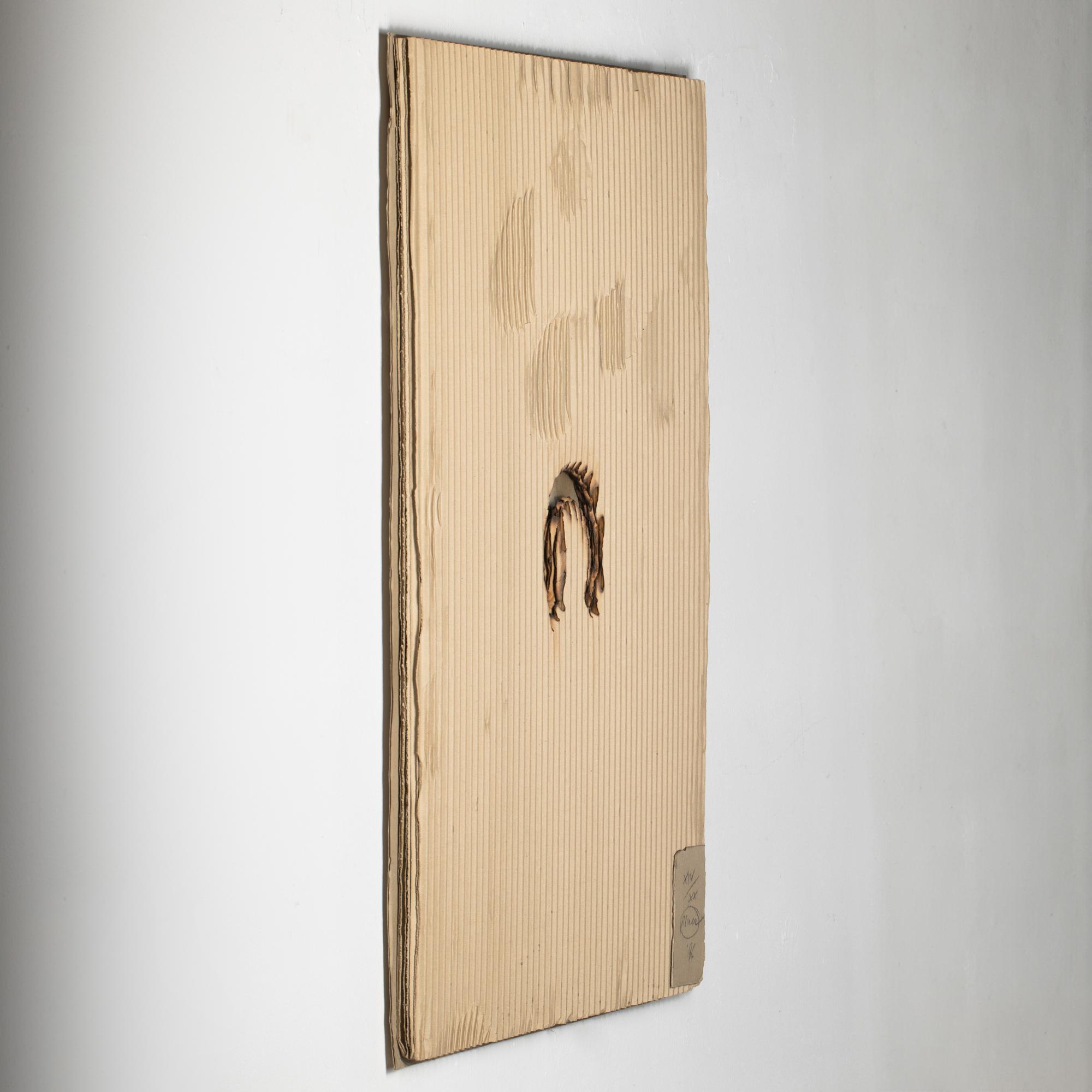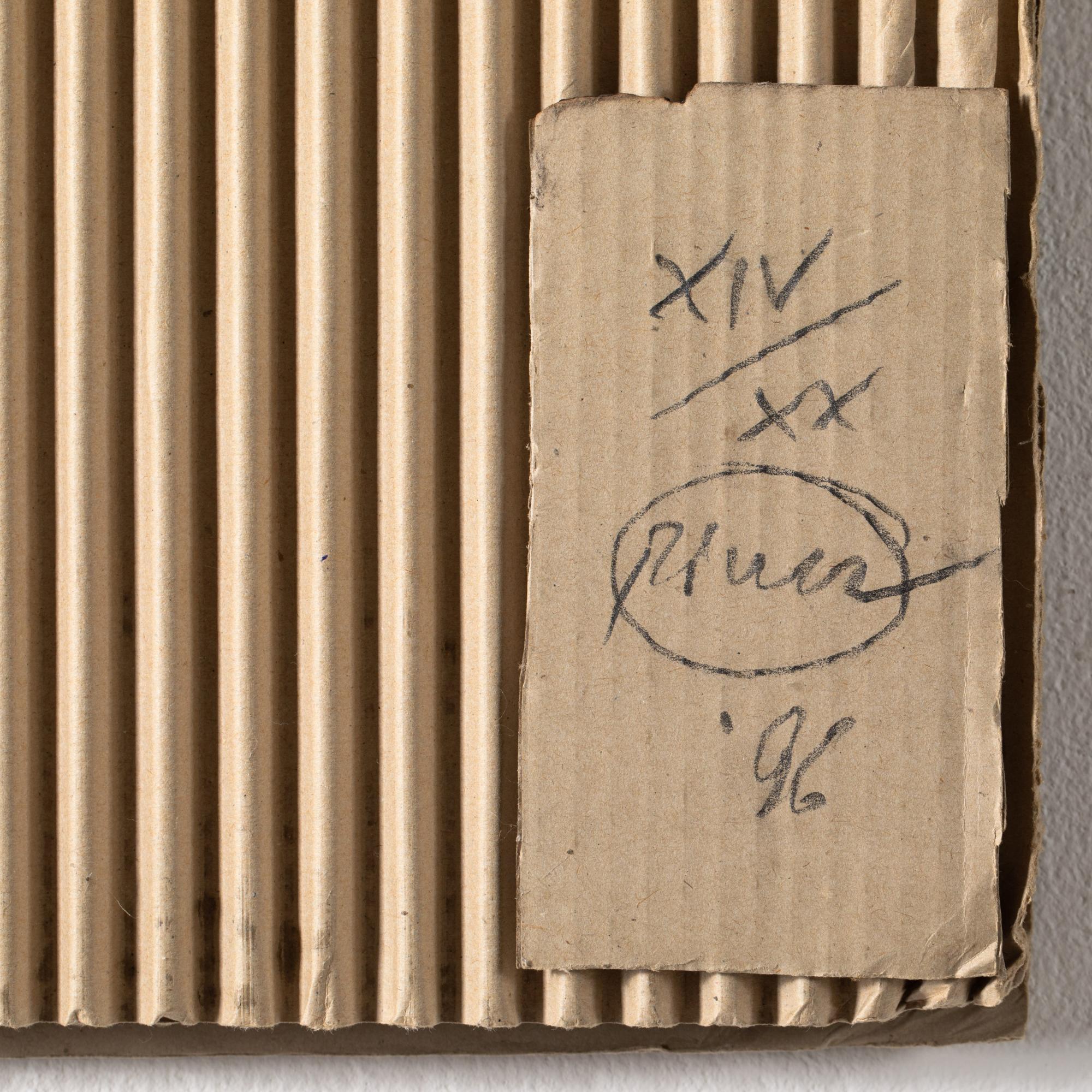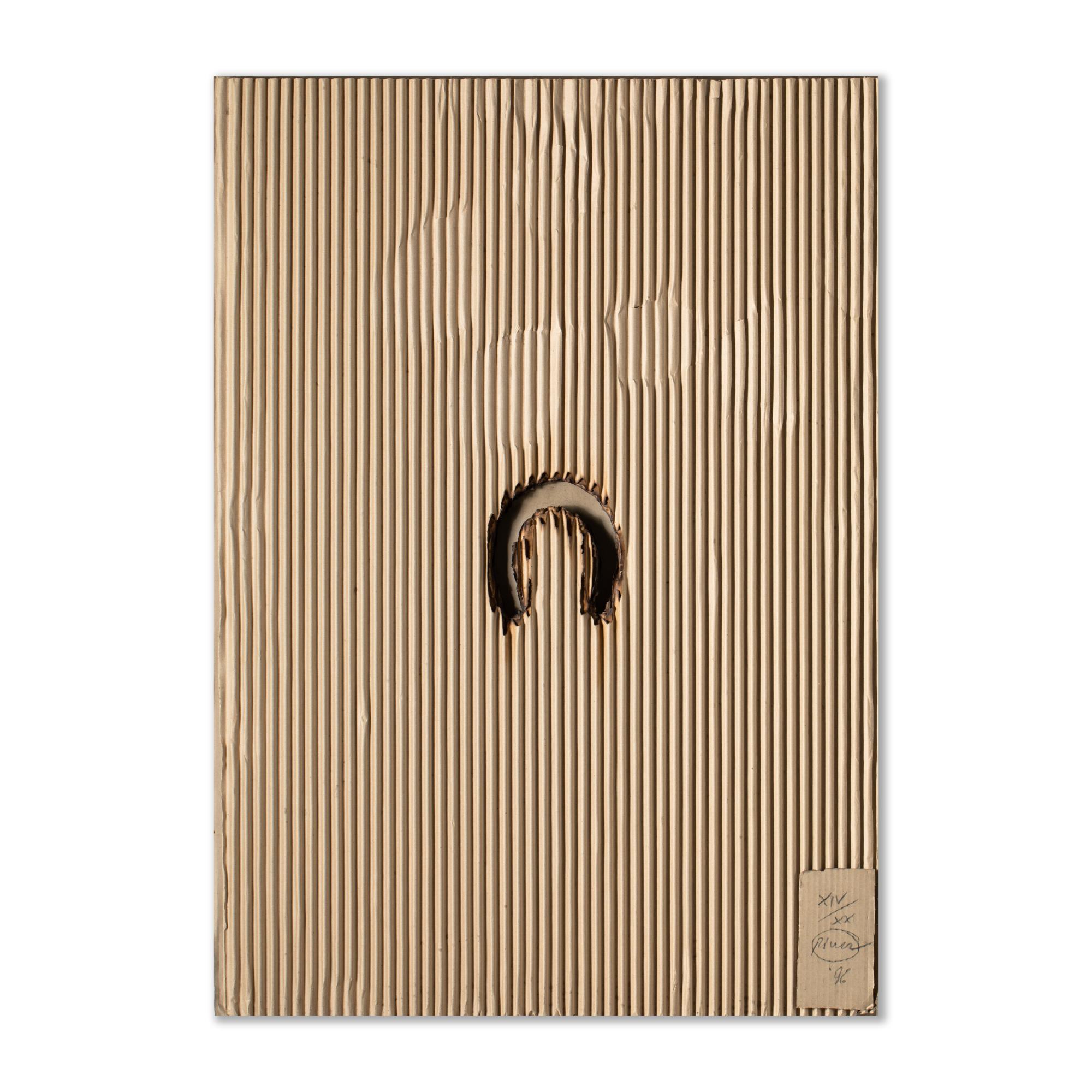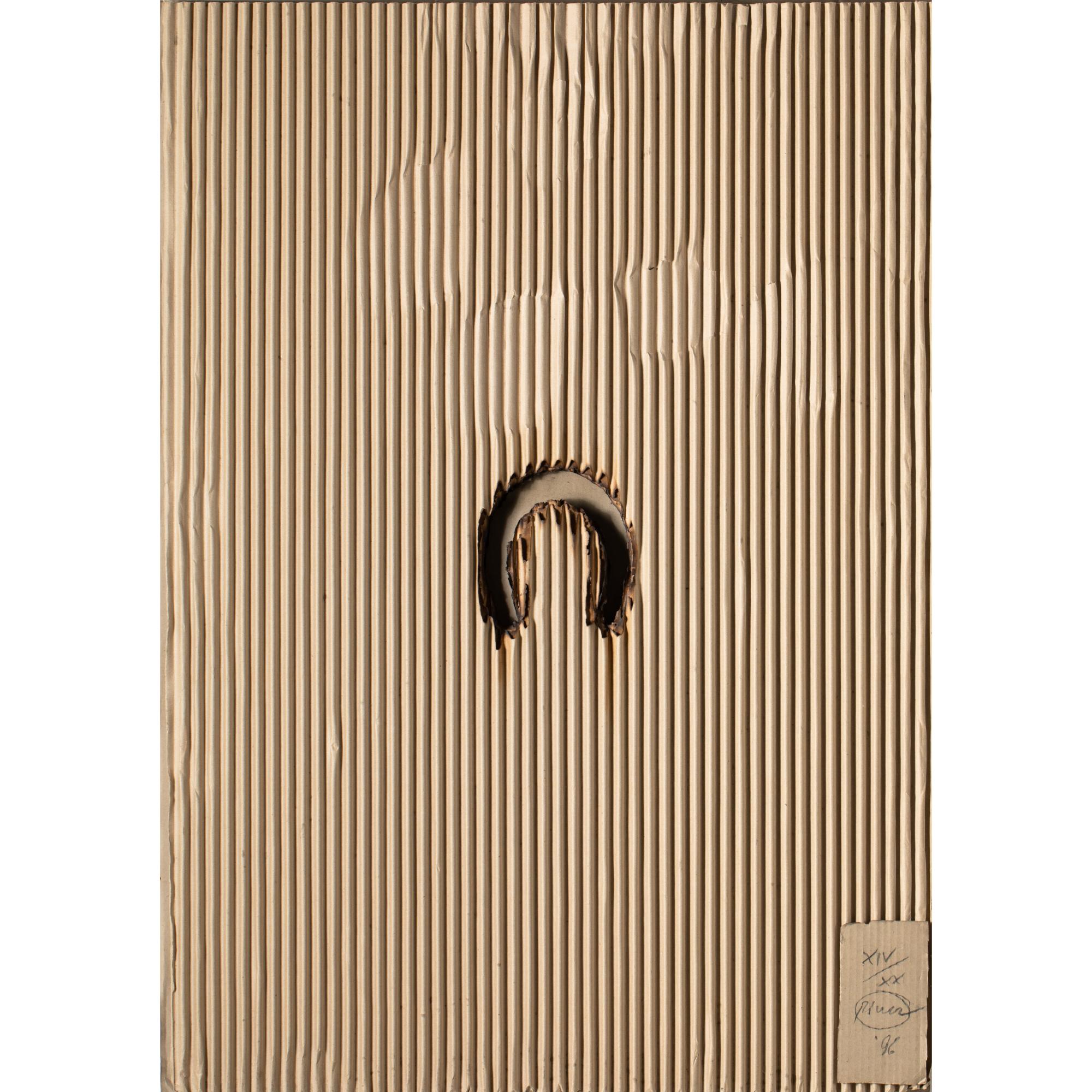 Feuer und Wellpappen, auf Karton und Hartfaserplatte montiert. 101 x 71 x 3 cm. Unten rechts auf einem montierten Kartonteil nummeriert, signiert und datiert: XIV/XX, Piene (19)96 (Bleistift). Exemplar 14 von 20 Exemplaren.