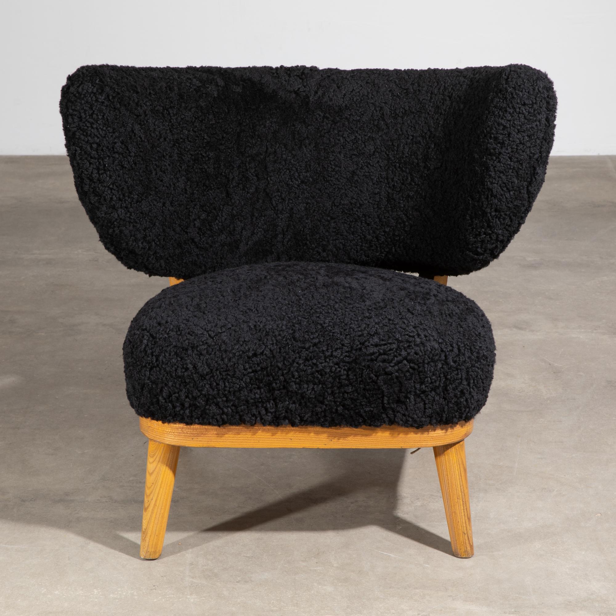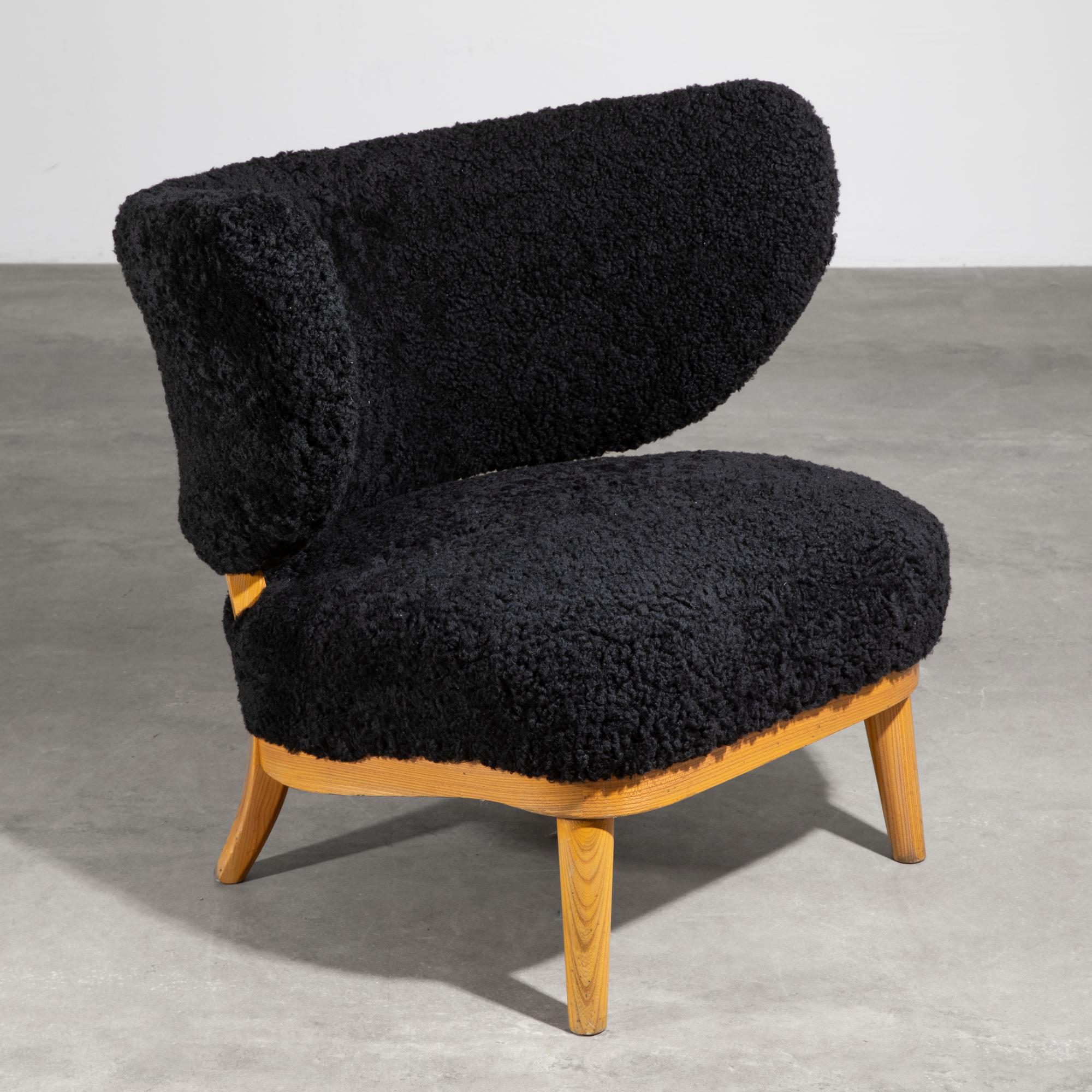 Entwurf 1940er Jahre. Holz mit dunklem Lammfell. 77 x 84 x 76 cm.