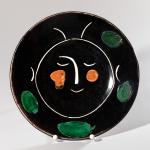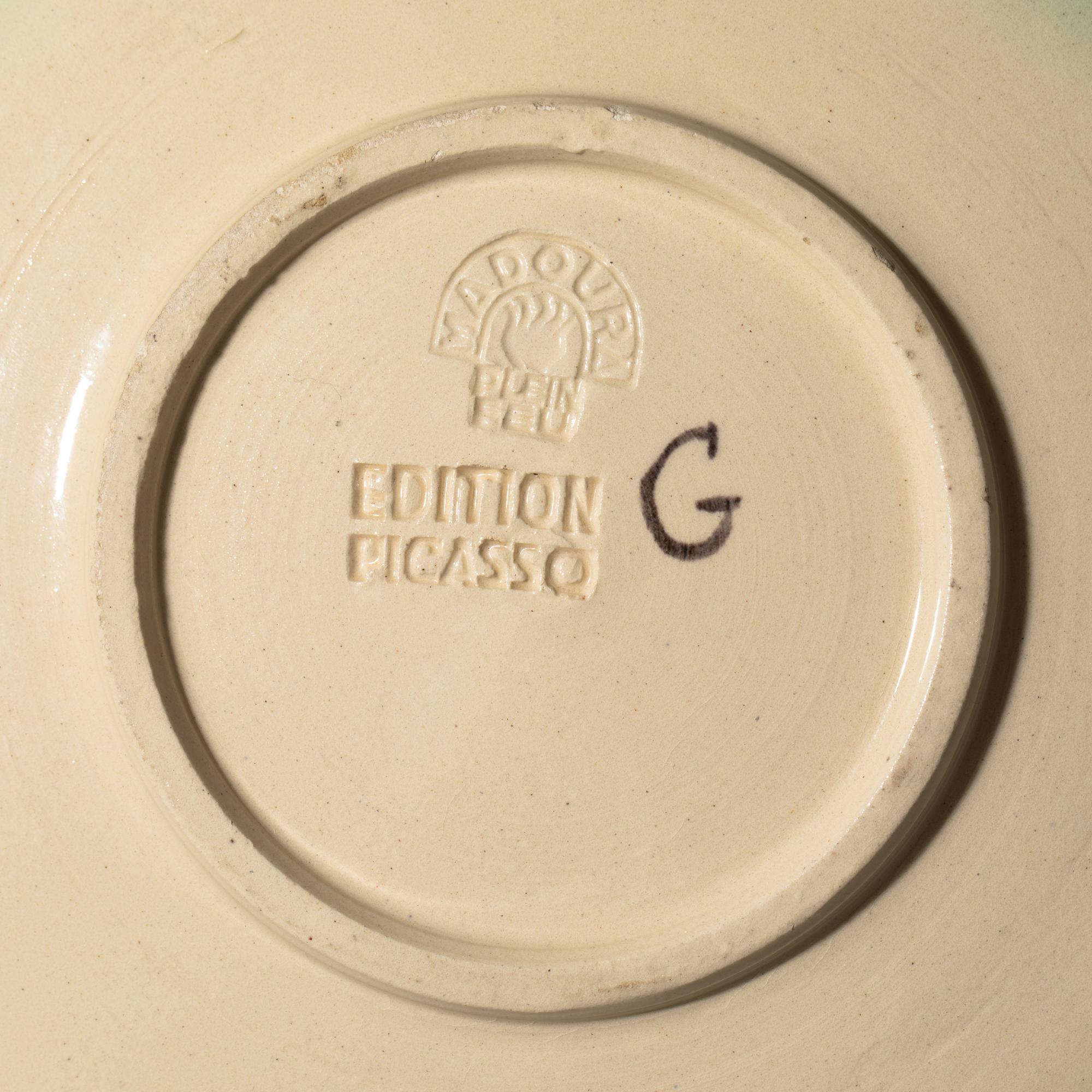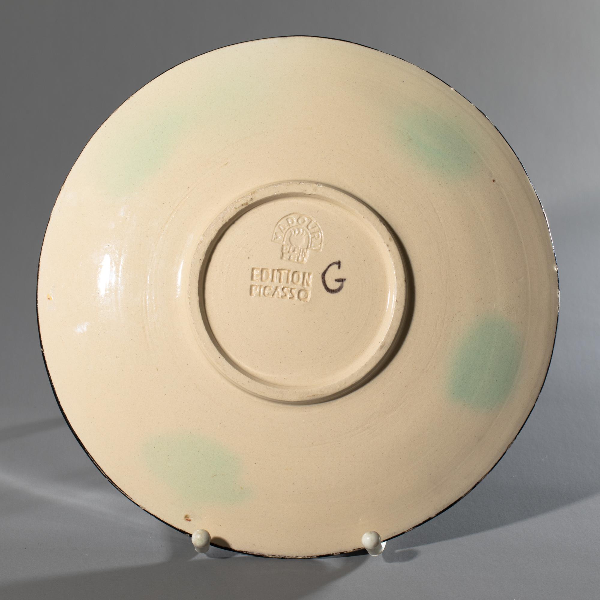 Weißer Steingutscherben, teilweise graviert, mit farbiger Engobe und Glasur. D. 24 cm. Auf der Unterseite bezeichnet: G (gemalt) und zwei Editionsstempel: MADOURA PLEIN FEU / EDITION PICASSO. Eines von 100 Exemplaren.