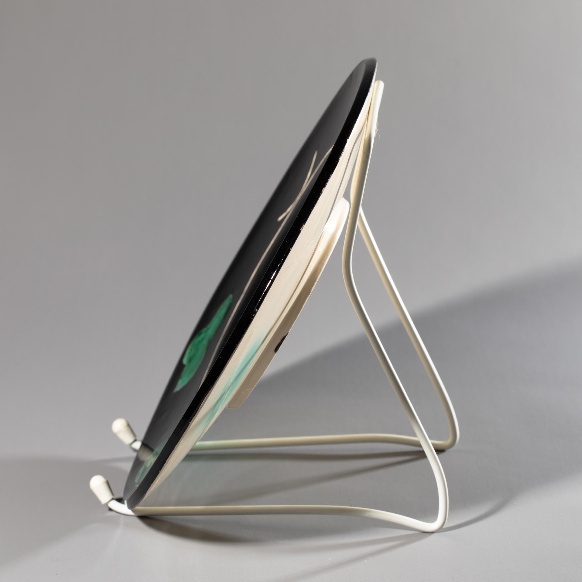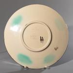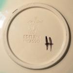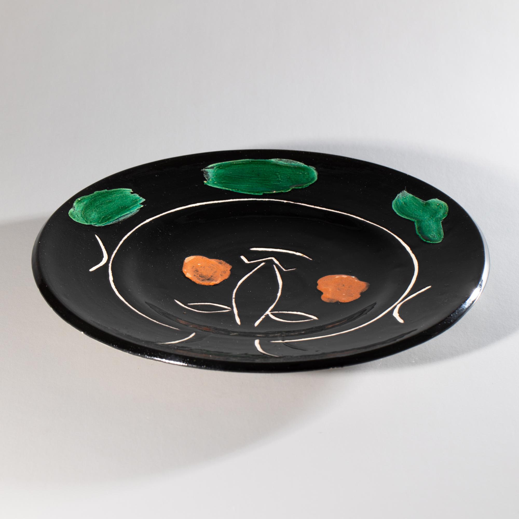 Weißer Steingutscherben, teilweise graviert, mit farbiger Engobe und Glasur. D. 24 cm. Auf der Unterseite bezeichnet: H (gemalt) und zwei Editionsstempel: MADOURA PLEIN FEU / EDITION PICASSO. Eines von 100 Exemplaren.