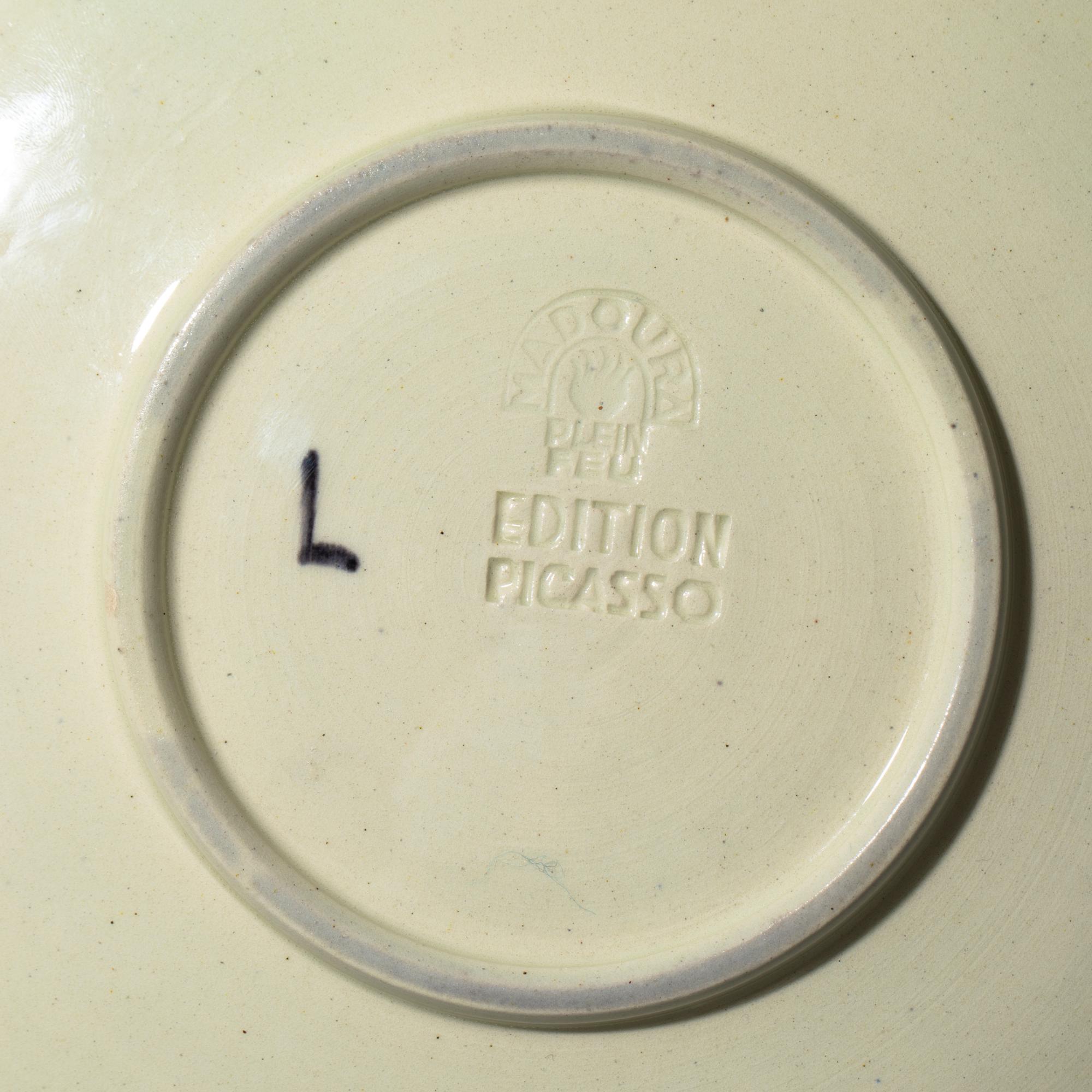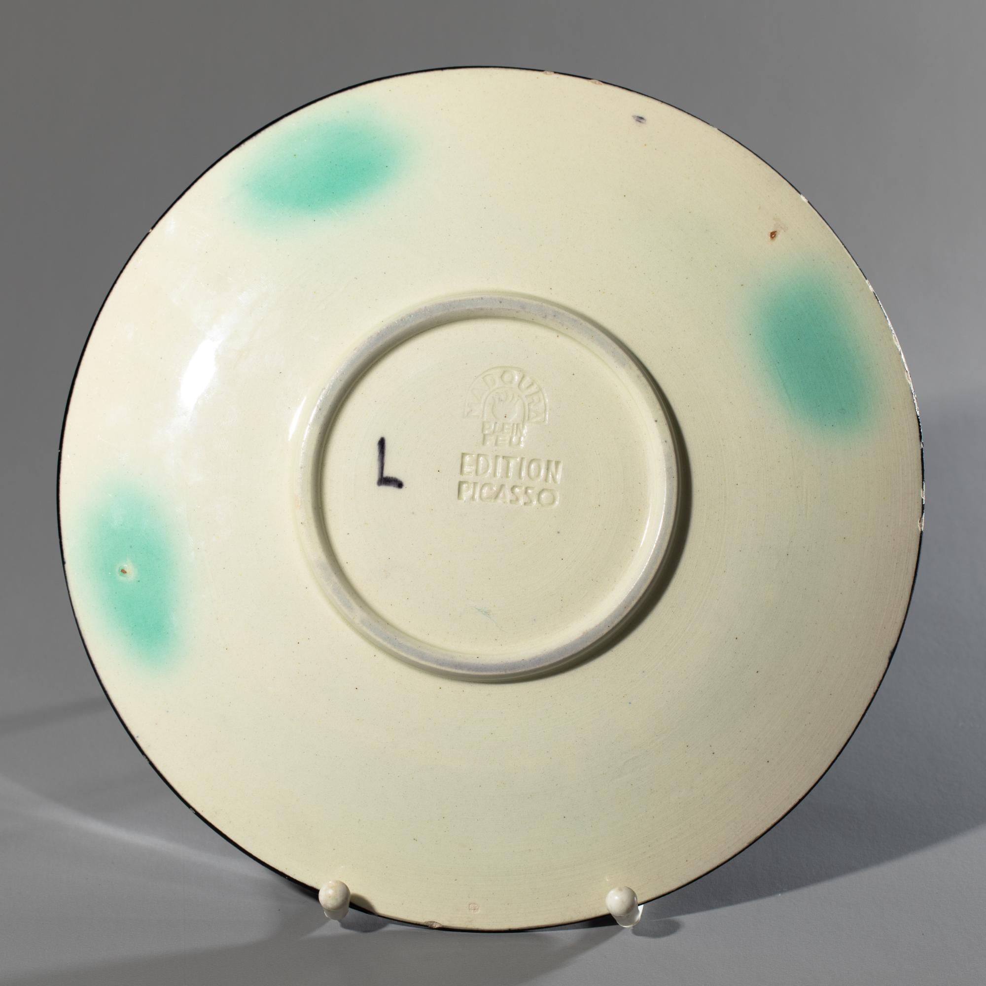 Weißer Steingutscherben, teilweise graviert, mit farbiger Engobe und Glasur. D. 24,2 cm. Auf der Unterseite bezeichnet: L (gemalt) und zwei Editionsstempel: MADOURA PLEIN FEU / EDITION PICASSO. Eines von 100 Exemplaren.