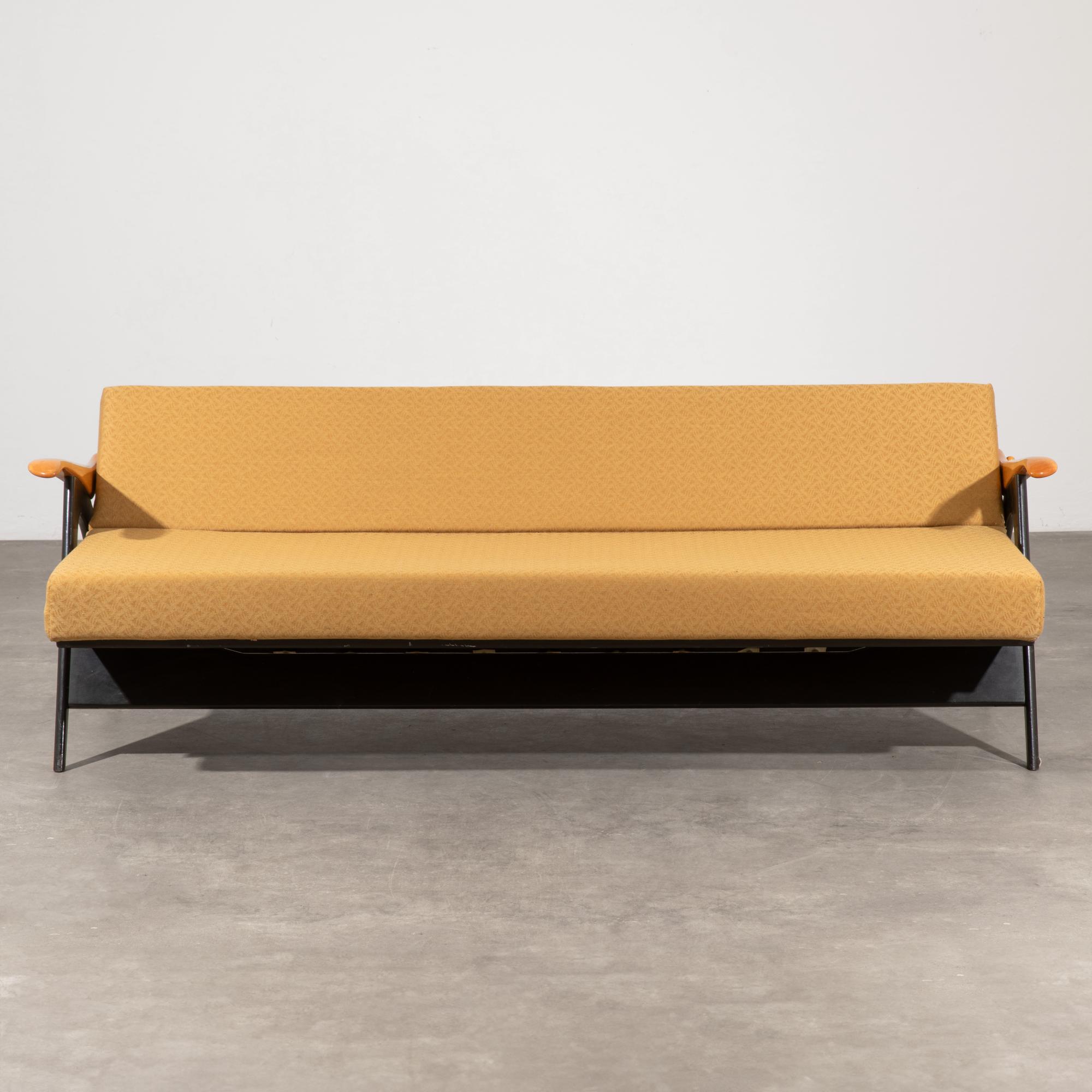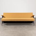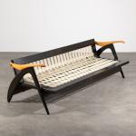 Entwurf aus den 1950er Jahren. Organisch ausgearbeitete Seitenteile aus teilweise lackiertem Holz, Kunststoffgurte, Schaumstoff mit Stoffbezug. 75 x 204 x 86 cm.