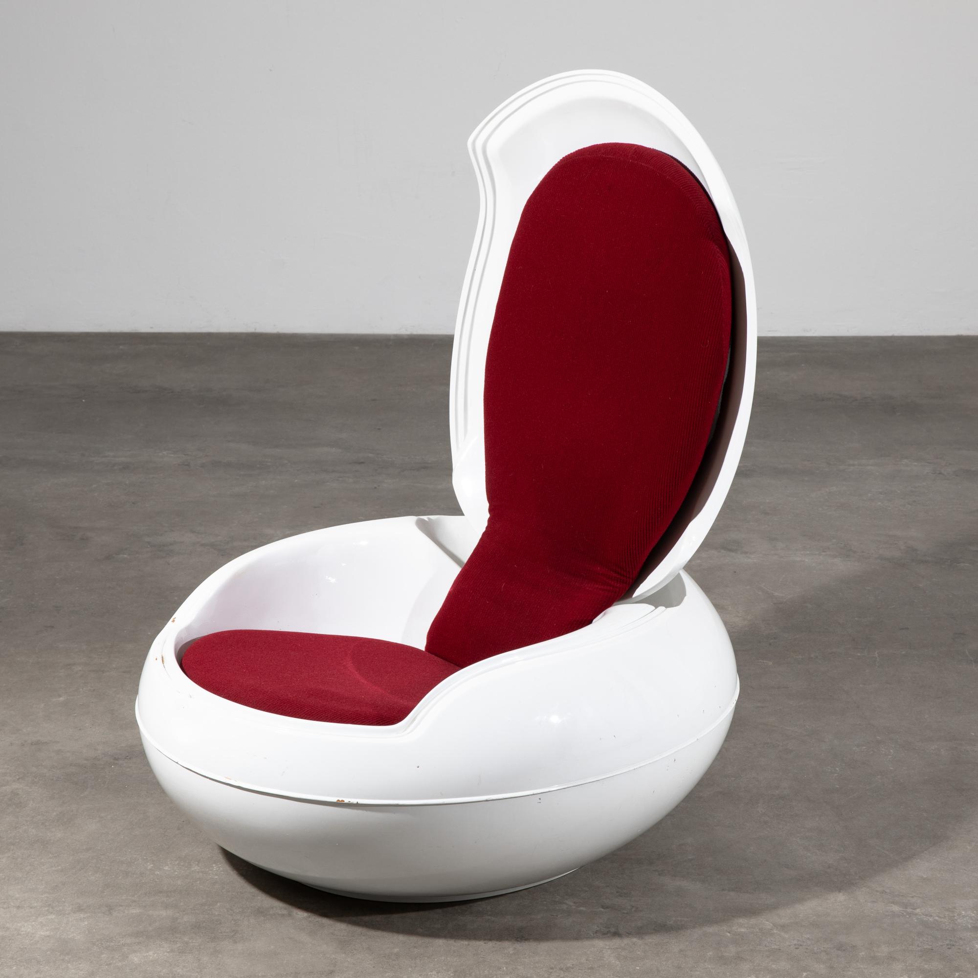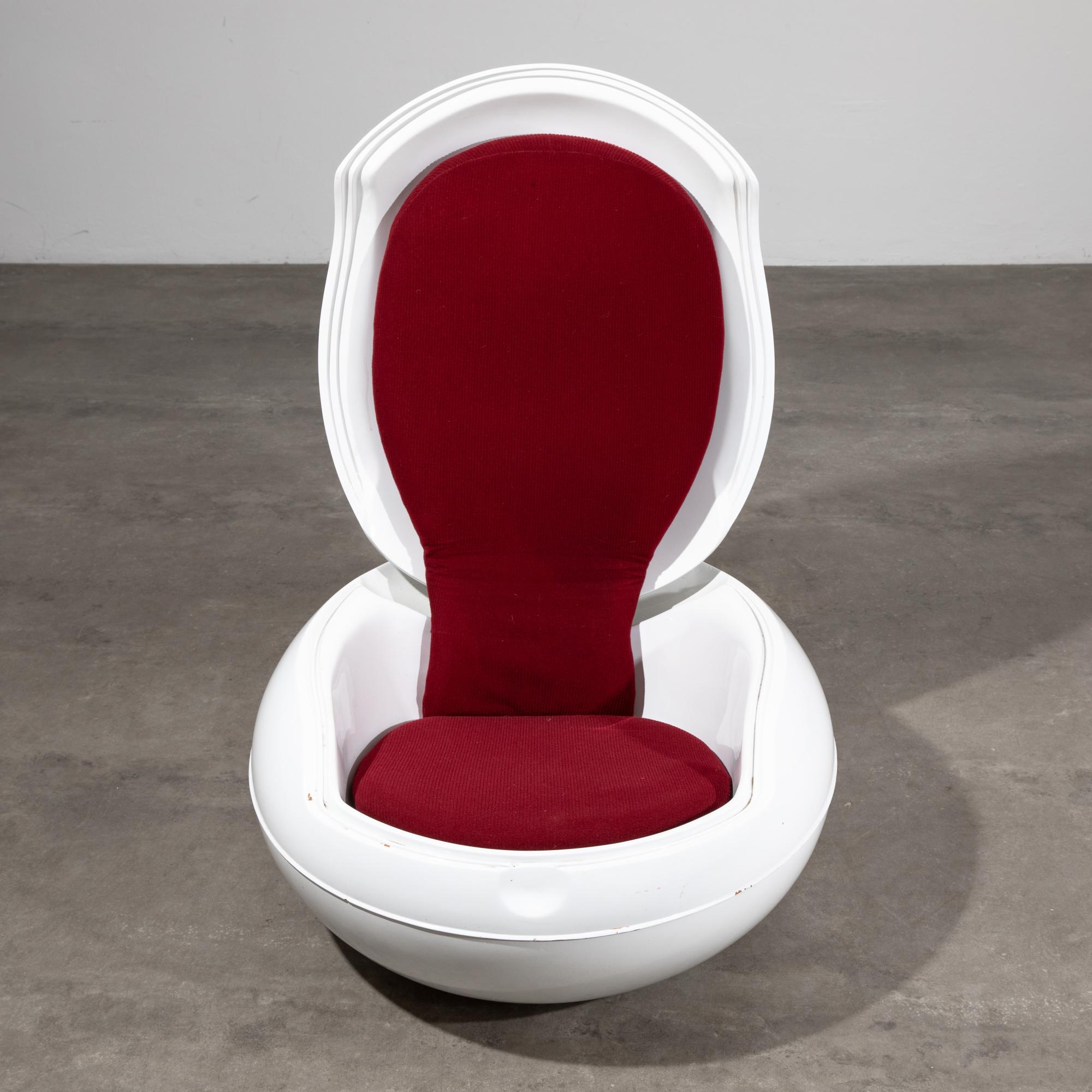 Entwurf 1968. Ausführung Reuter. Klappbare Konstruktion aus weiß lackiertem Kunststoff, Sitzbezug aus rotem Stoff. 43/100 x 75 x 88 cm.