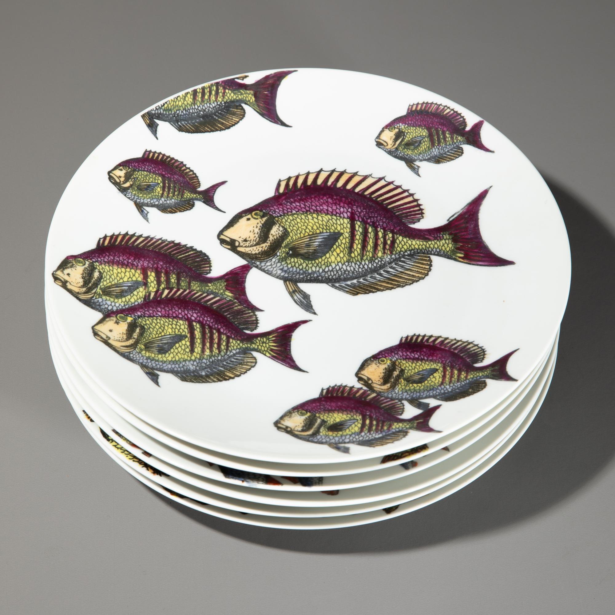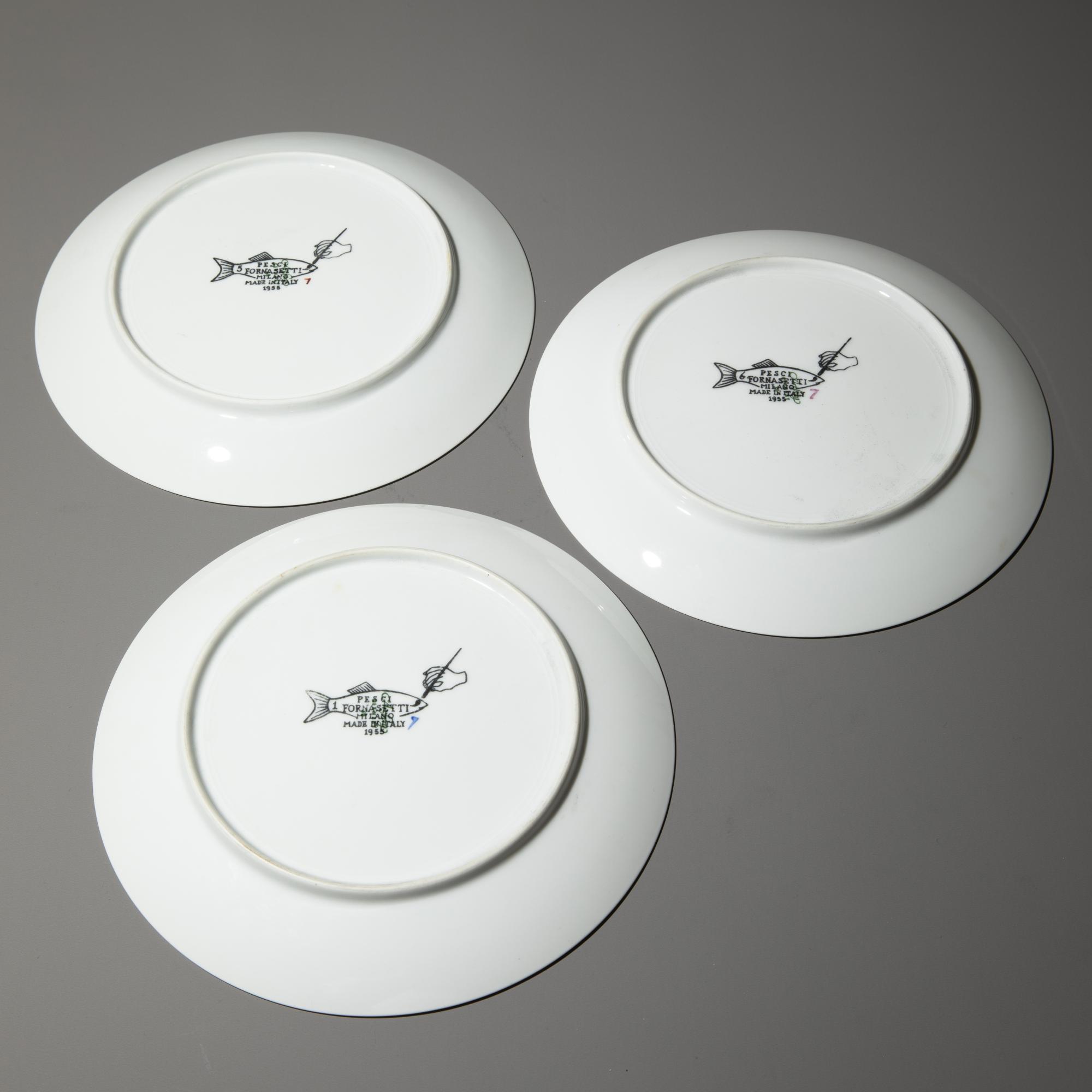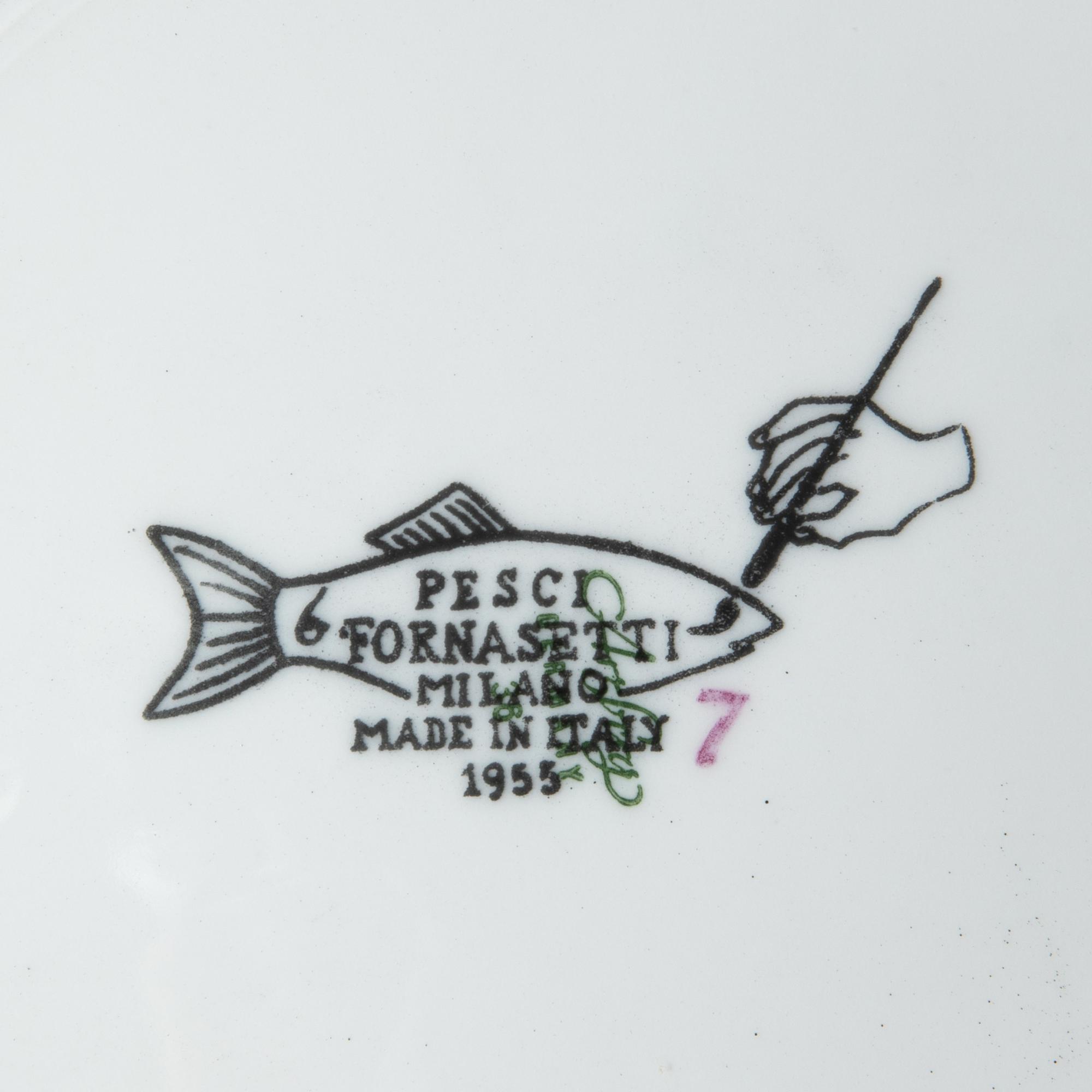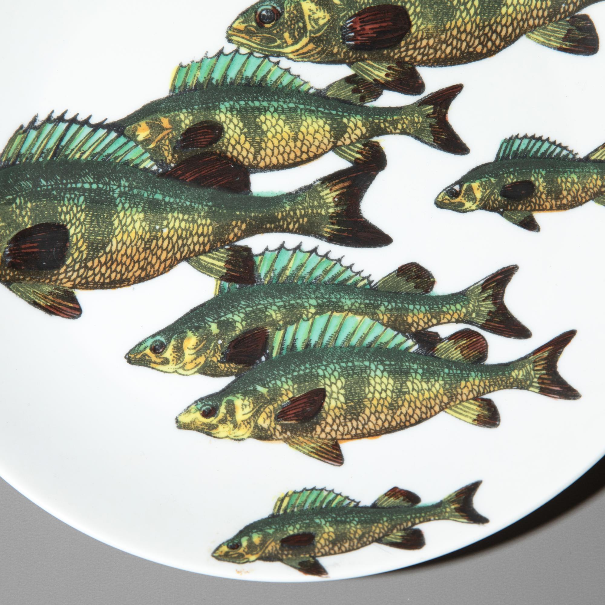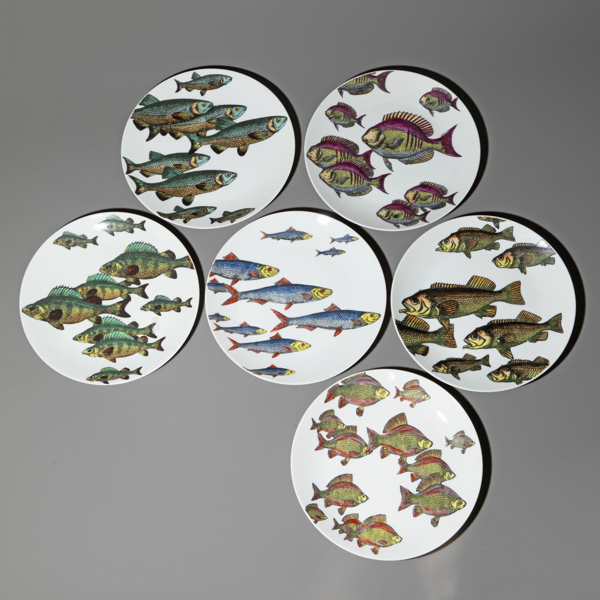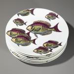 Entwurf 1955. Ausführung Fornasetti. Porzellan mit sechs verschiedenen Fischmotiven. H. 2,5 cm, D. 24 cm. Unterseitig bezeichnet.