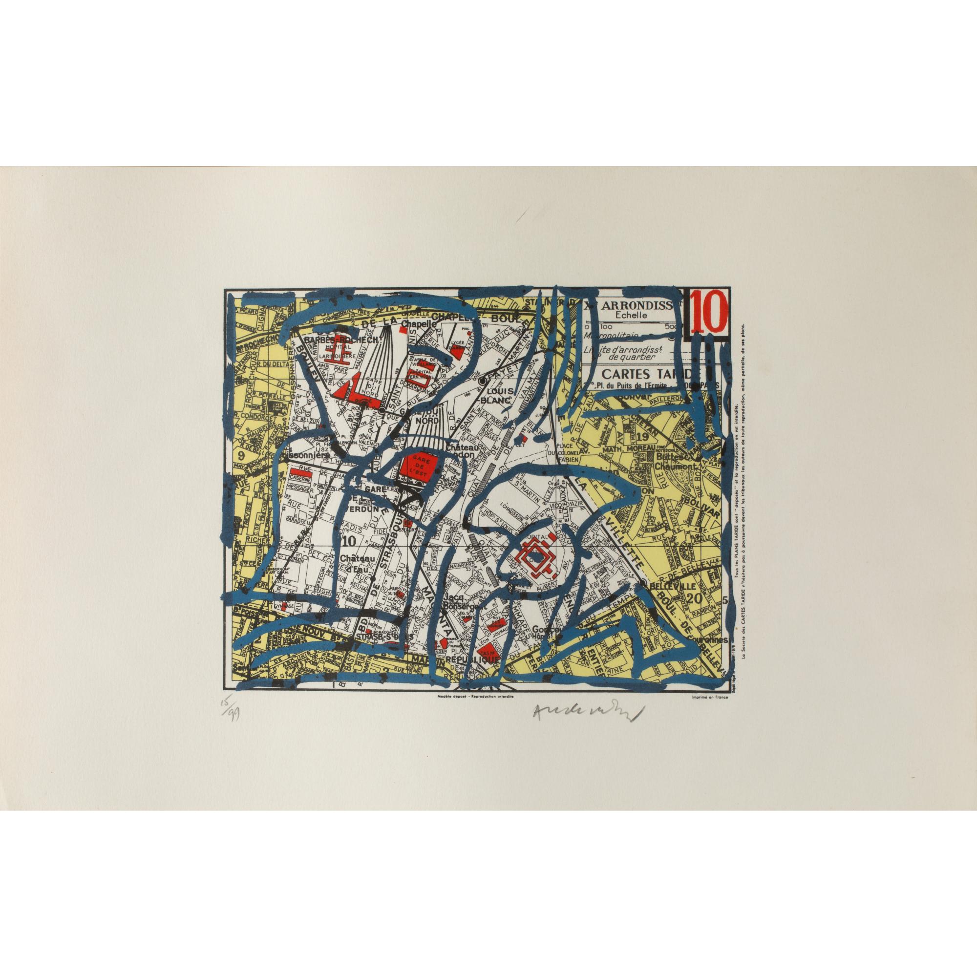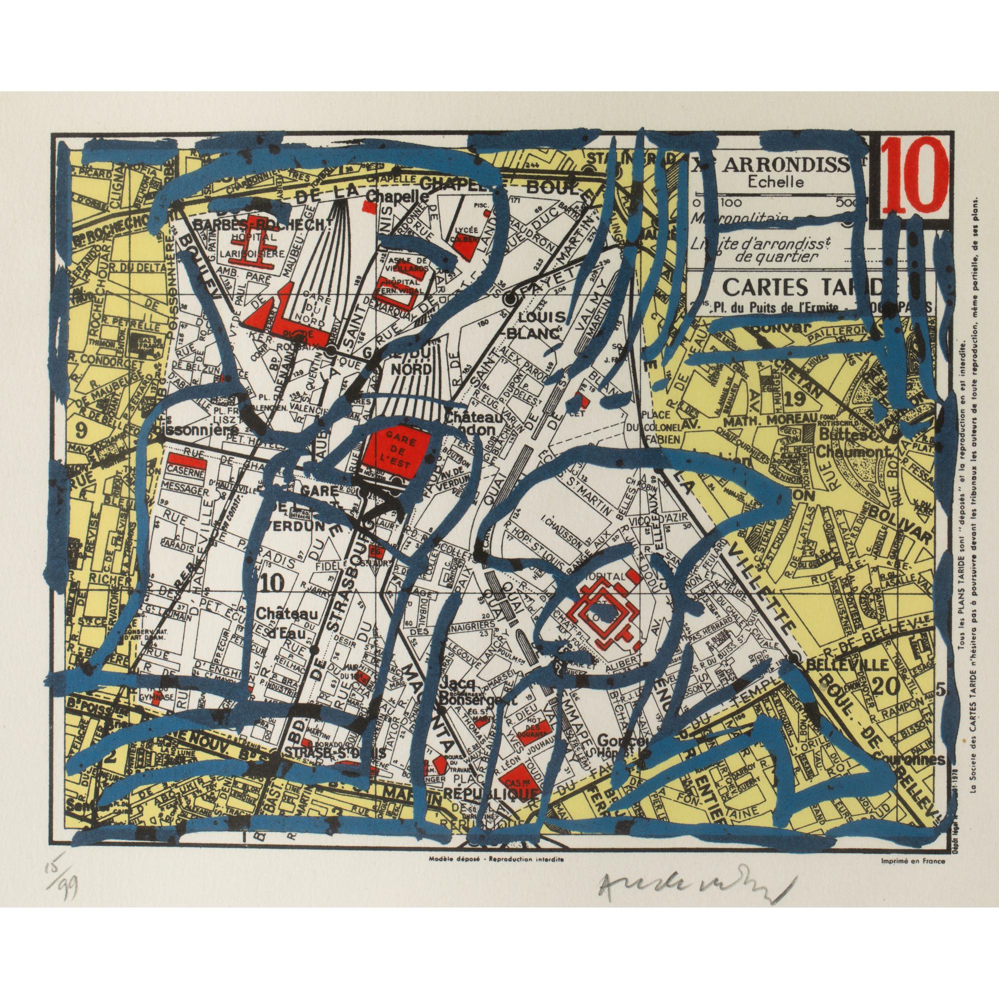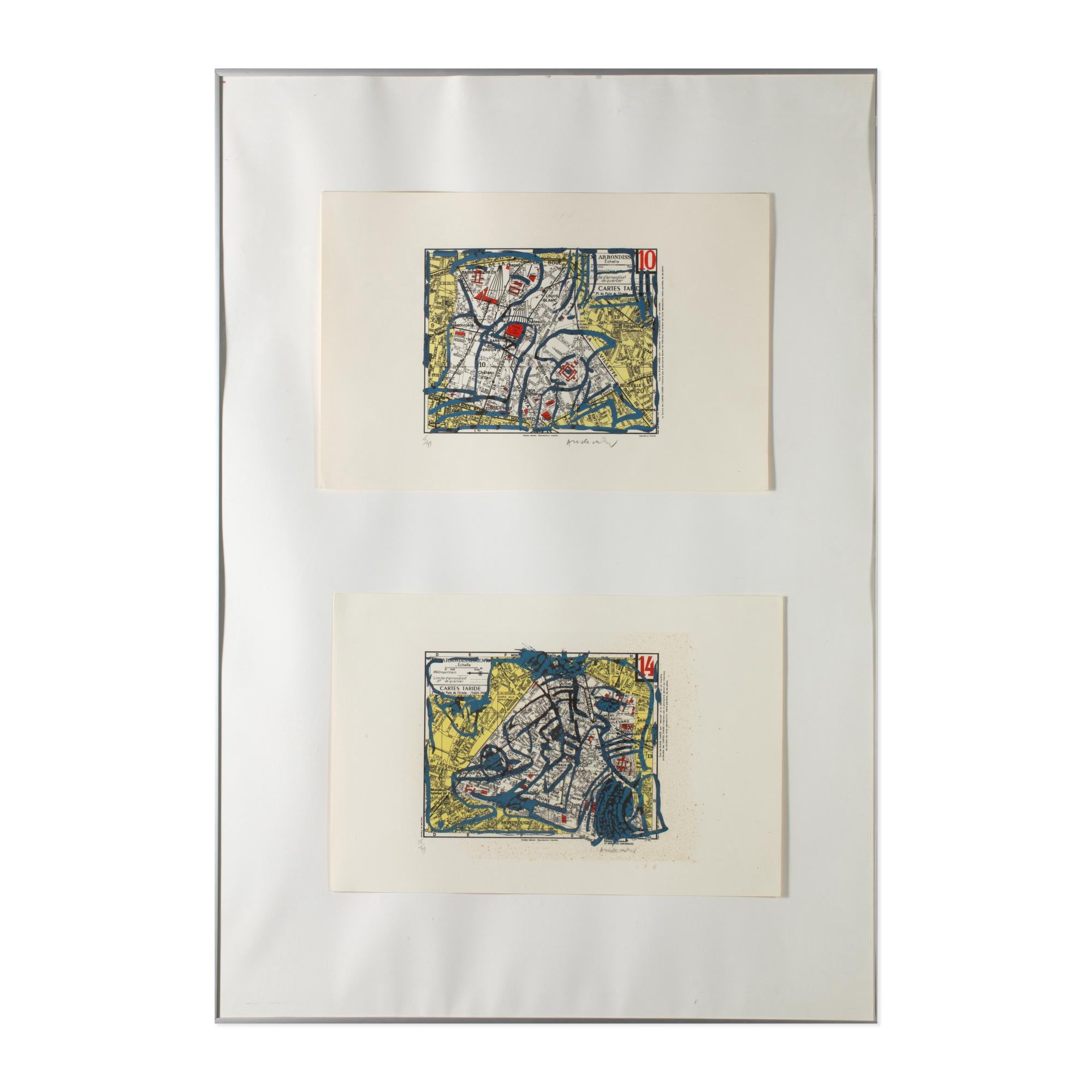 2 Bll. Farblithographie auf Papier. Je 32 x 47 cm. Je unten links nummeriert: 15/99 und unten rechts signiert: Alechinsky (Bleistift). Je Exemplar 15 von 99 Exemplaren aus der Mappe 'Arrondissements' mit 21 Bll. Zusammen unter Glas gerahmt und so beschrieben.