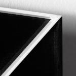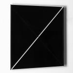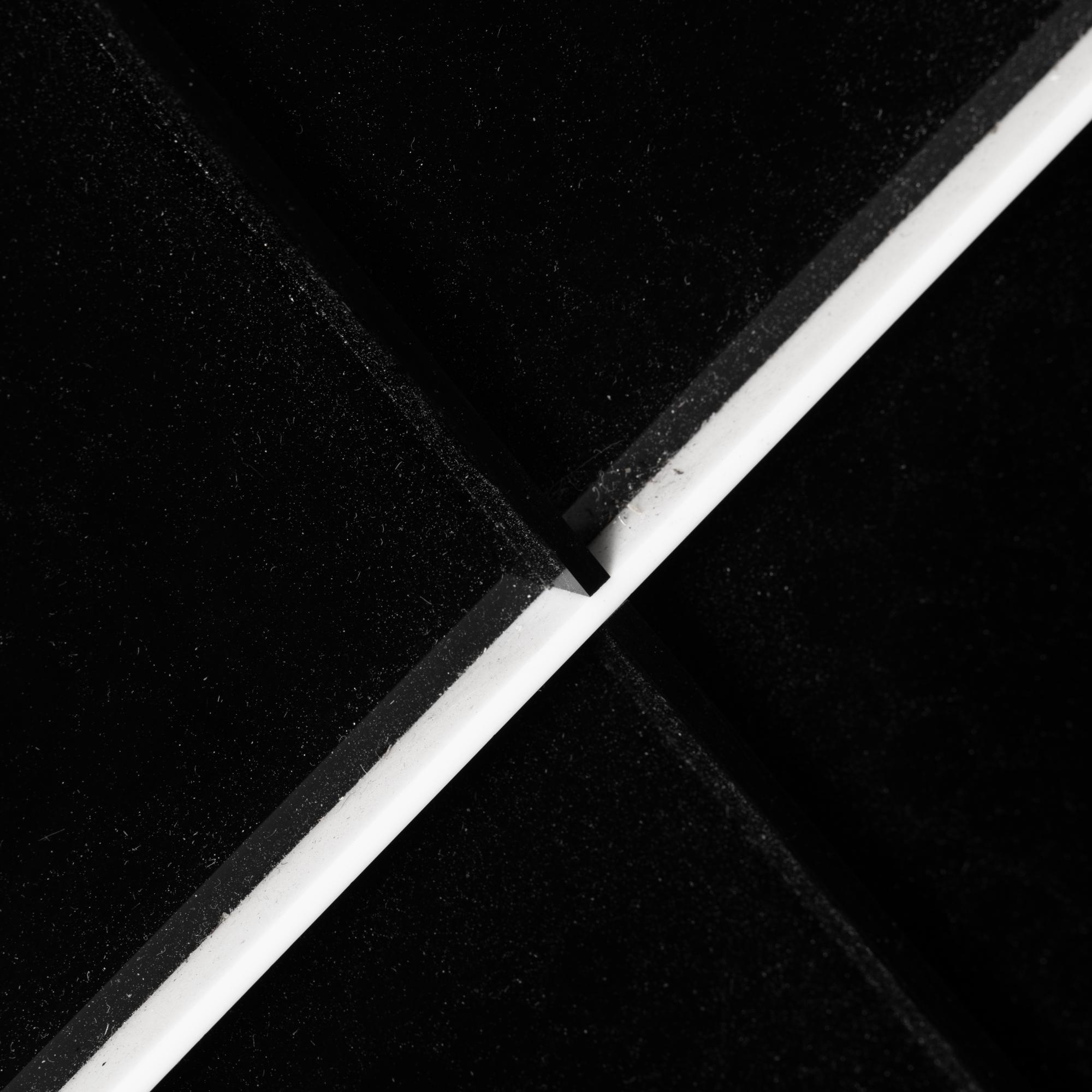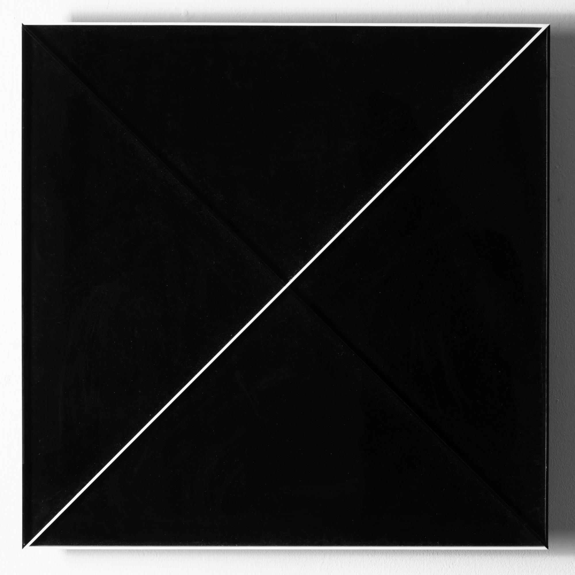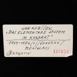 Kunststoff, schwarz und weiß, Plexiglas. 60 x 60 x 6 cm. Verso auf einem Klebeetikett u.a. signiert, betitelt, datiert und bezeichnet: Jan Kubíček "DAS ELEMENTARE SYSTEM IM KVADRAT" 1969 - 1974 B NEGATIV (schwarzer Fineliner).