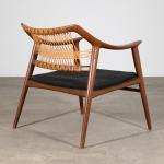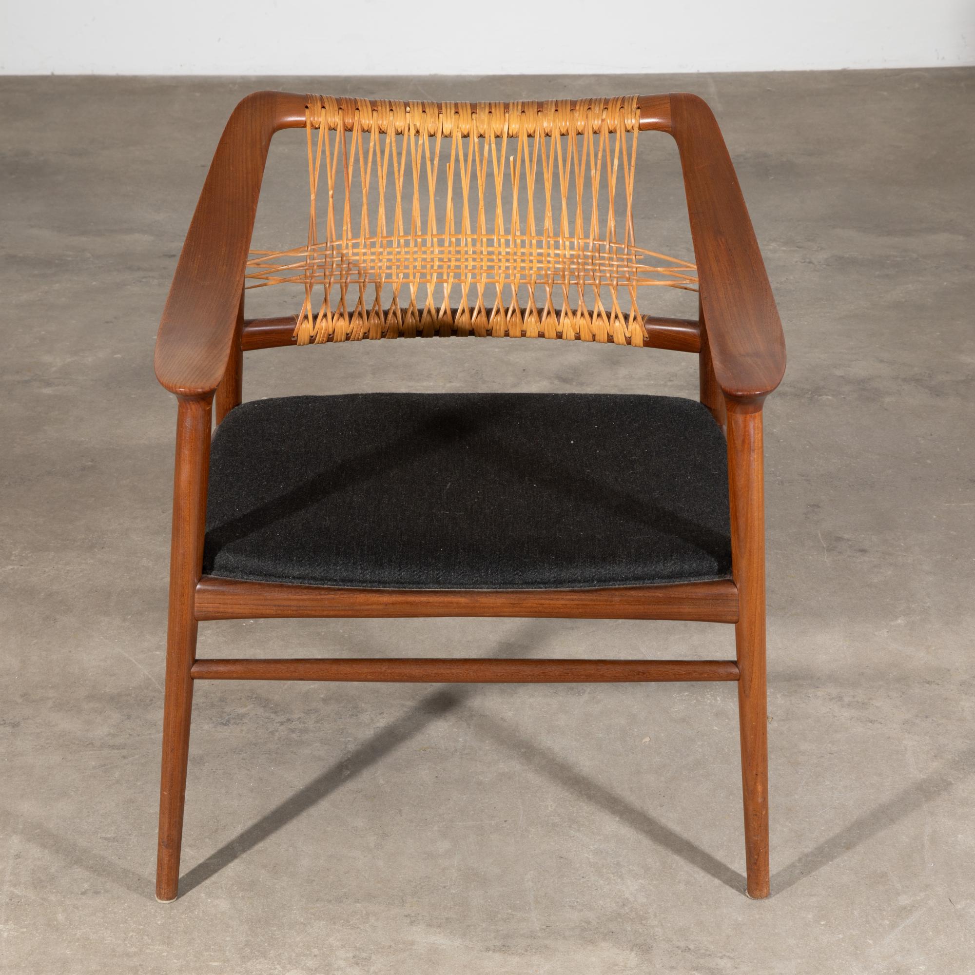 Entwurf um 1955. Ausführung Gustav Bahus. Teakholz, Rohrgeflecht, Stoff. 70 x 65 x 66 cm.
