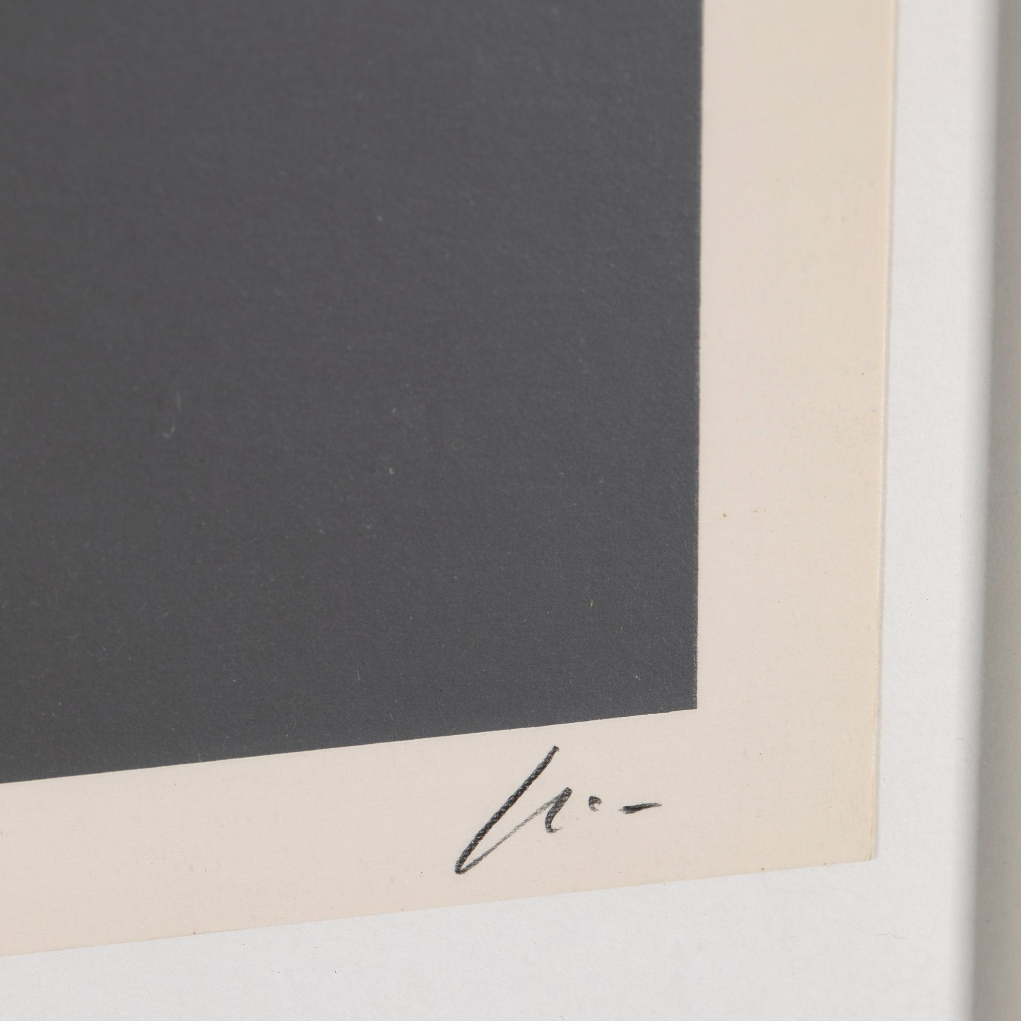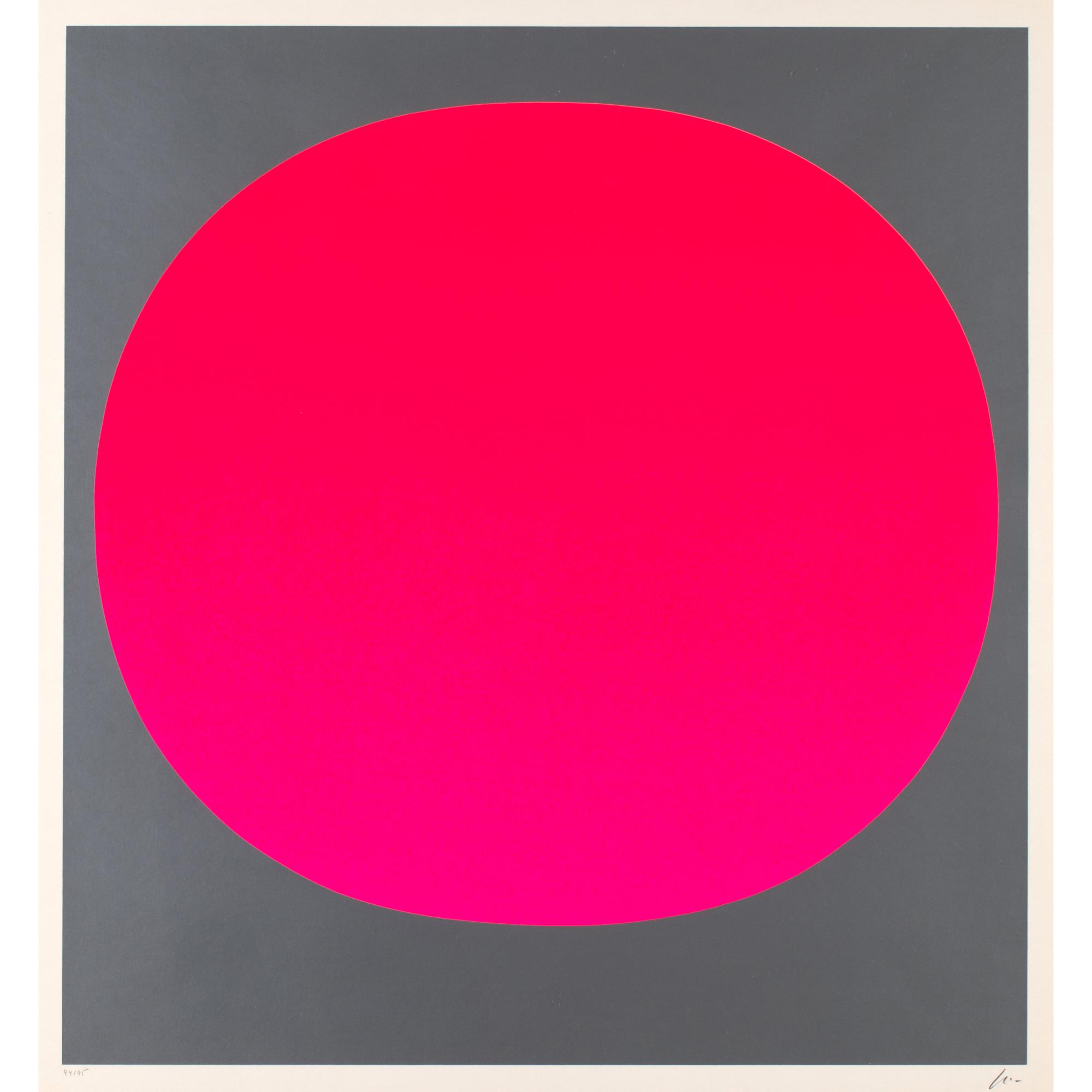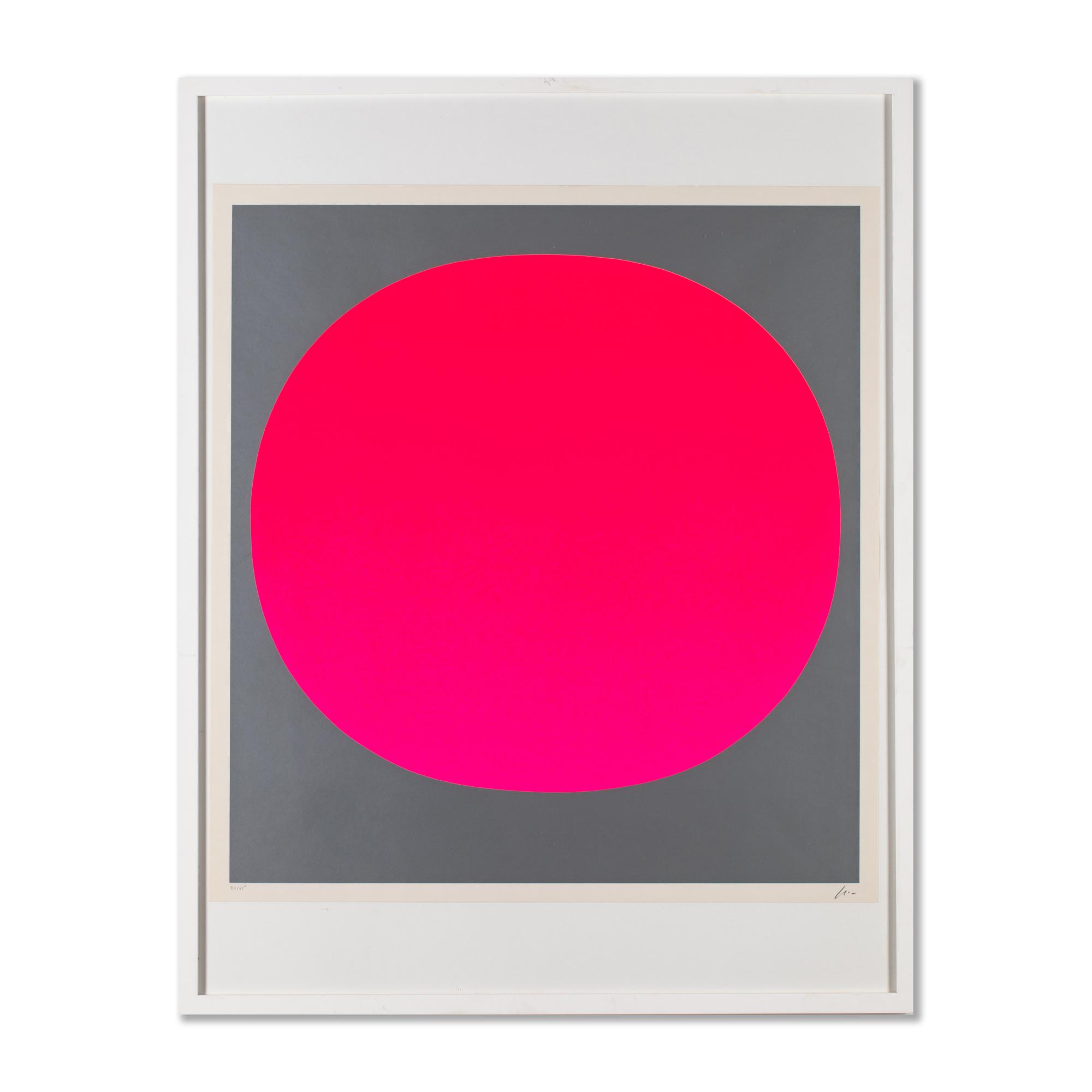 Farbseriegraphie auf Karton. 71 x 66 cm. Unten links nummeriert und rechts signiert: 44/95. Erschienen im Verlag der Galerie Der Spiegel in Köln als Blatt 6 der Folge 'Colour in the Round'. Druck: Hans Peter Haas, Echterdingen bei Stuttgart. Hinter Glas gerahmt und so beschrieben.