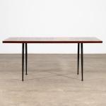 Entwurf um 1958. Ausführung ASKO. Beine aus schwarz lackiertem Metall, Platte in Padoukfurnier mit Einlage aus Birkenschichtholz. 53 x 124 x 62 cm. Unterseitig mit Brandstempel bezeichnet.