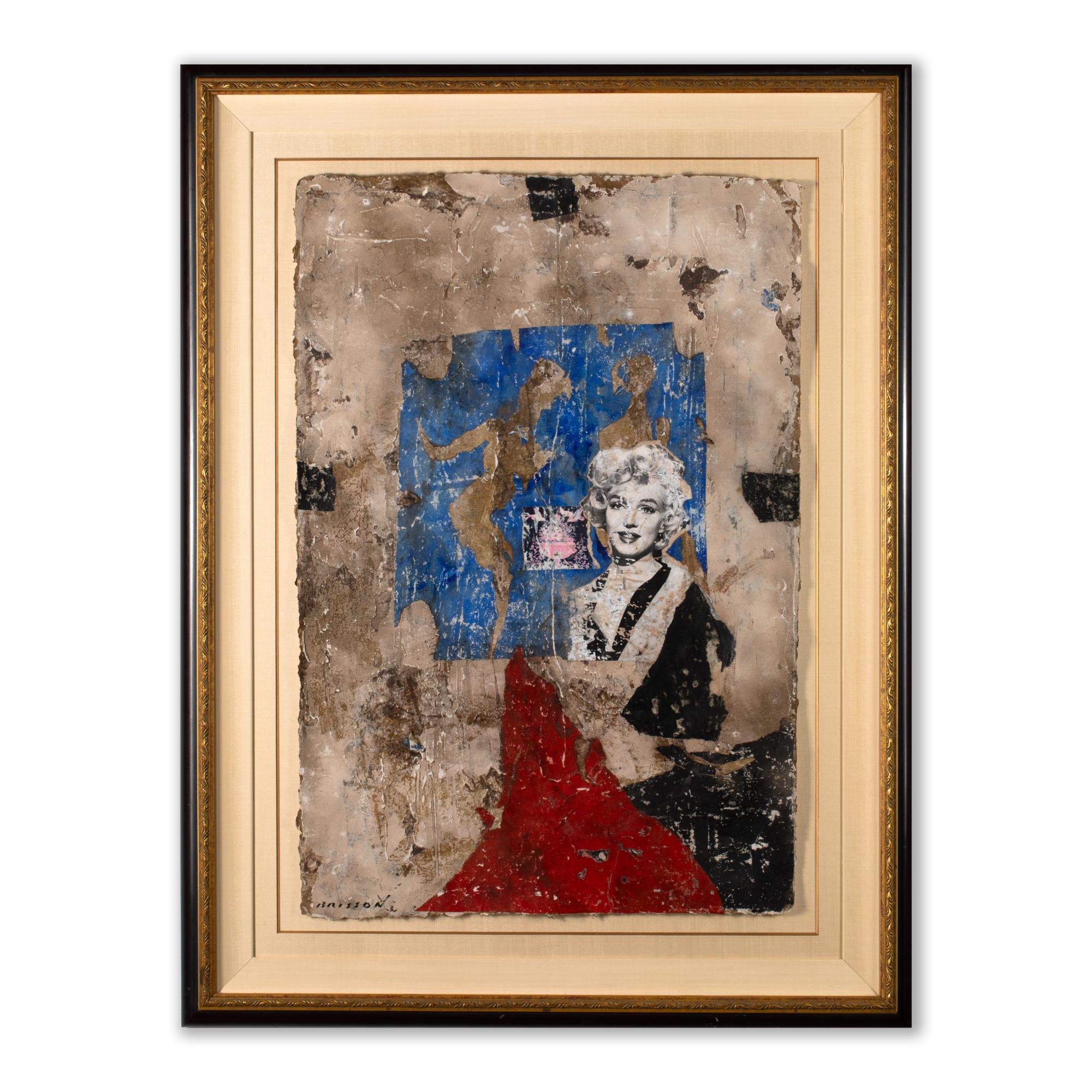 Collage, Mischtechnik auf Bütten. 92,5 x 62,5 cm. Unten links signiert: BRISSON (schwarzer Faserstift), verso auf einem Klebeetikett u.a. betitelt: Tendre Marilyn (schwarzer Faserstift) sowie Widmung auf der Rückwand: Brisson Pour Andrea et Fritz A Marilyn (scharzer Faserstift). Unter Glas im Passepartout gerahmt und so beschrieben.