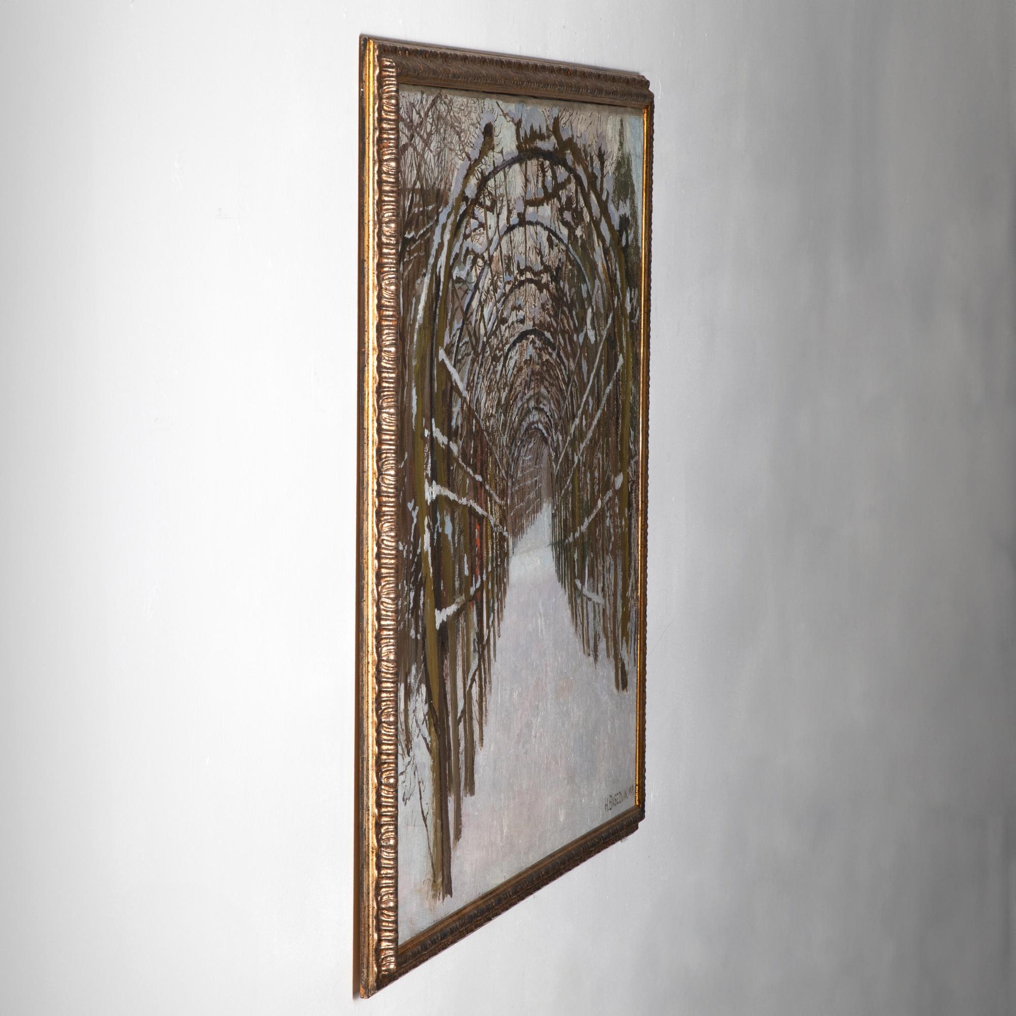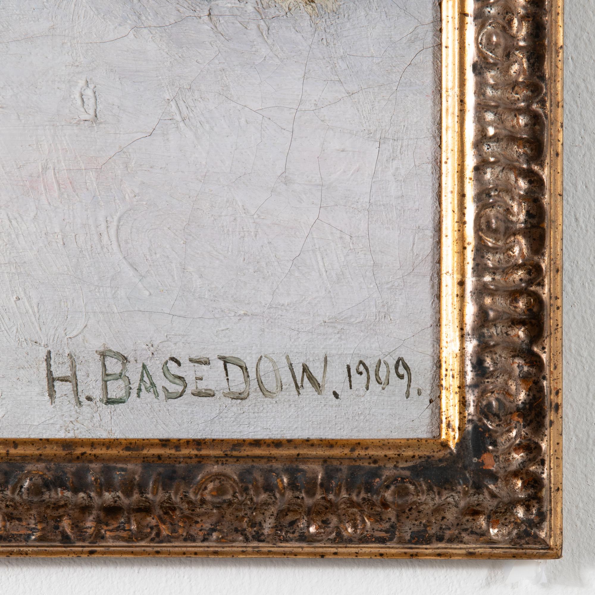 Öl auf Leinwand. 94,5 x 99,5 cm. Recto unten rechts mit Pinsel signiert und datiert: H.BASEDOW.1909. Verso auf Klebeetikett bezeichnet: Verschneiter Laubengang im Park von Schloß Sanssouci / Öl auf Leinwand / Rückseitig mit Nachlaßstempel versehen / 94,5 cm x 99,5 cm / Ausst.: Große Berliner Kunstausstellung 1910, Nr. 295.