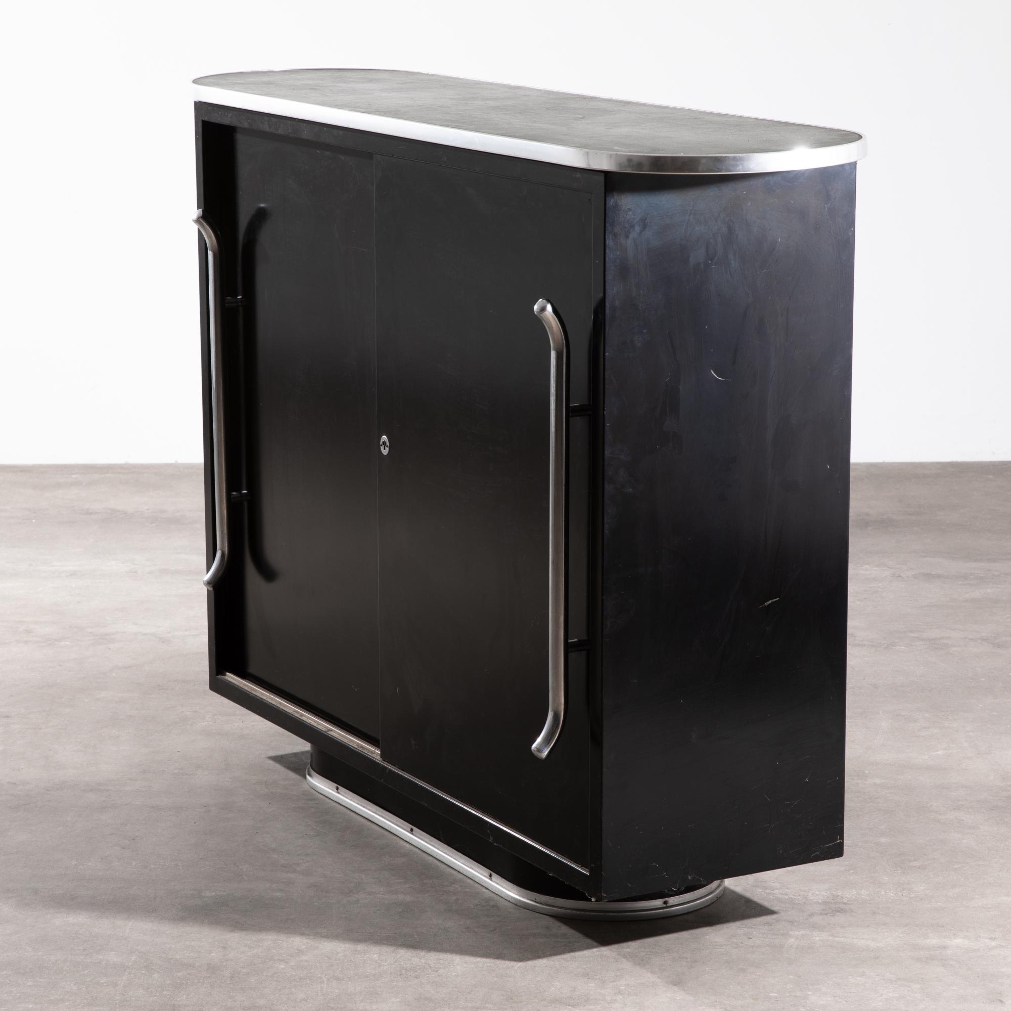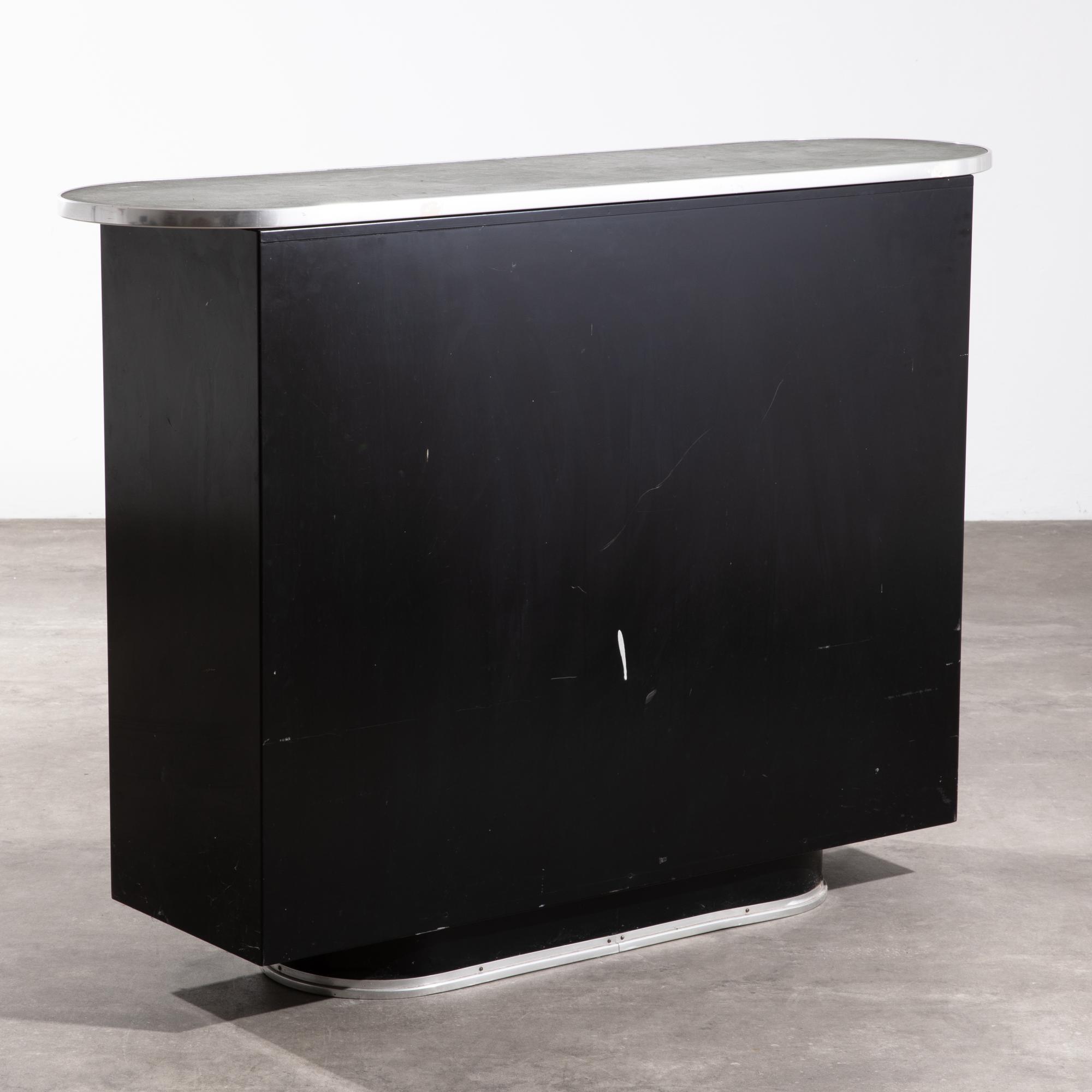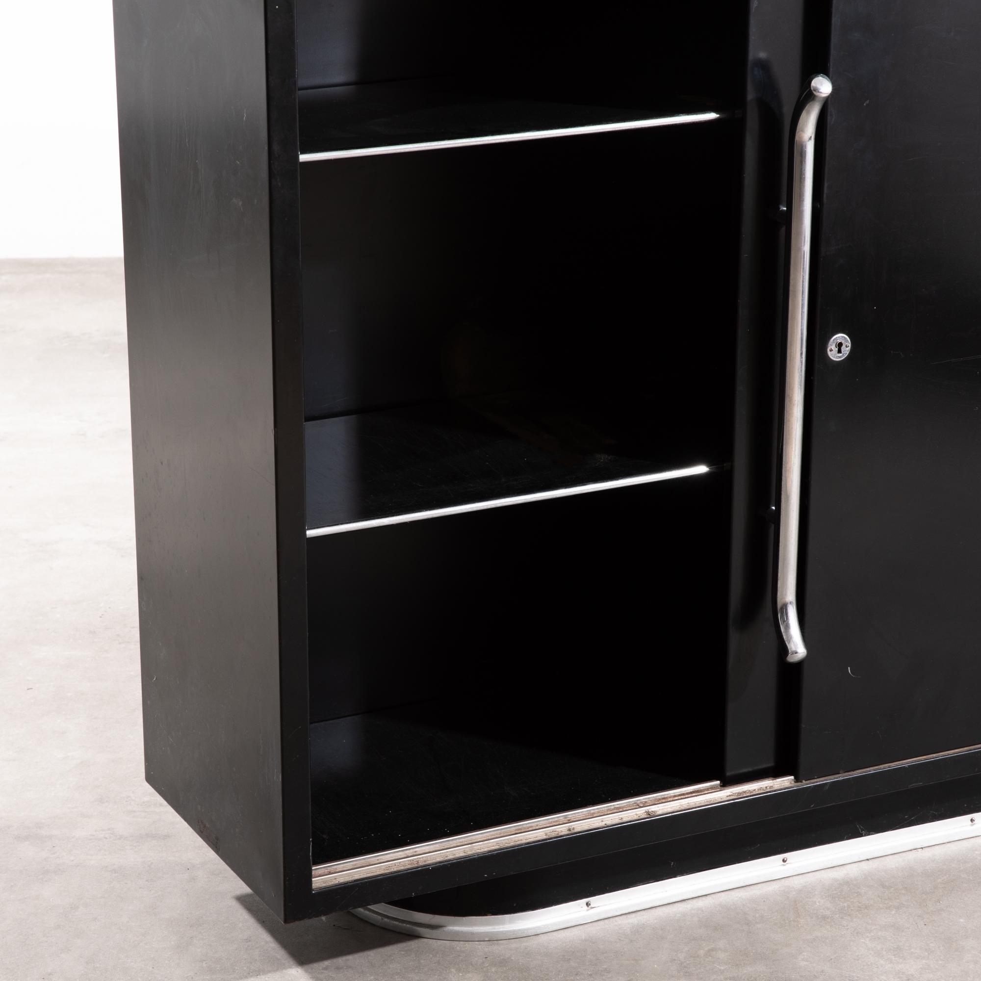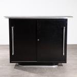 Entwurf 1954. Ausführung Mauser Werke. Schwarz lackiertes Stahlblech, grünes Linoleum, Alukante, verchromtes Stahlrohr. 107 x 147 x 41 cm.