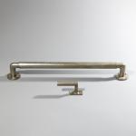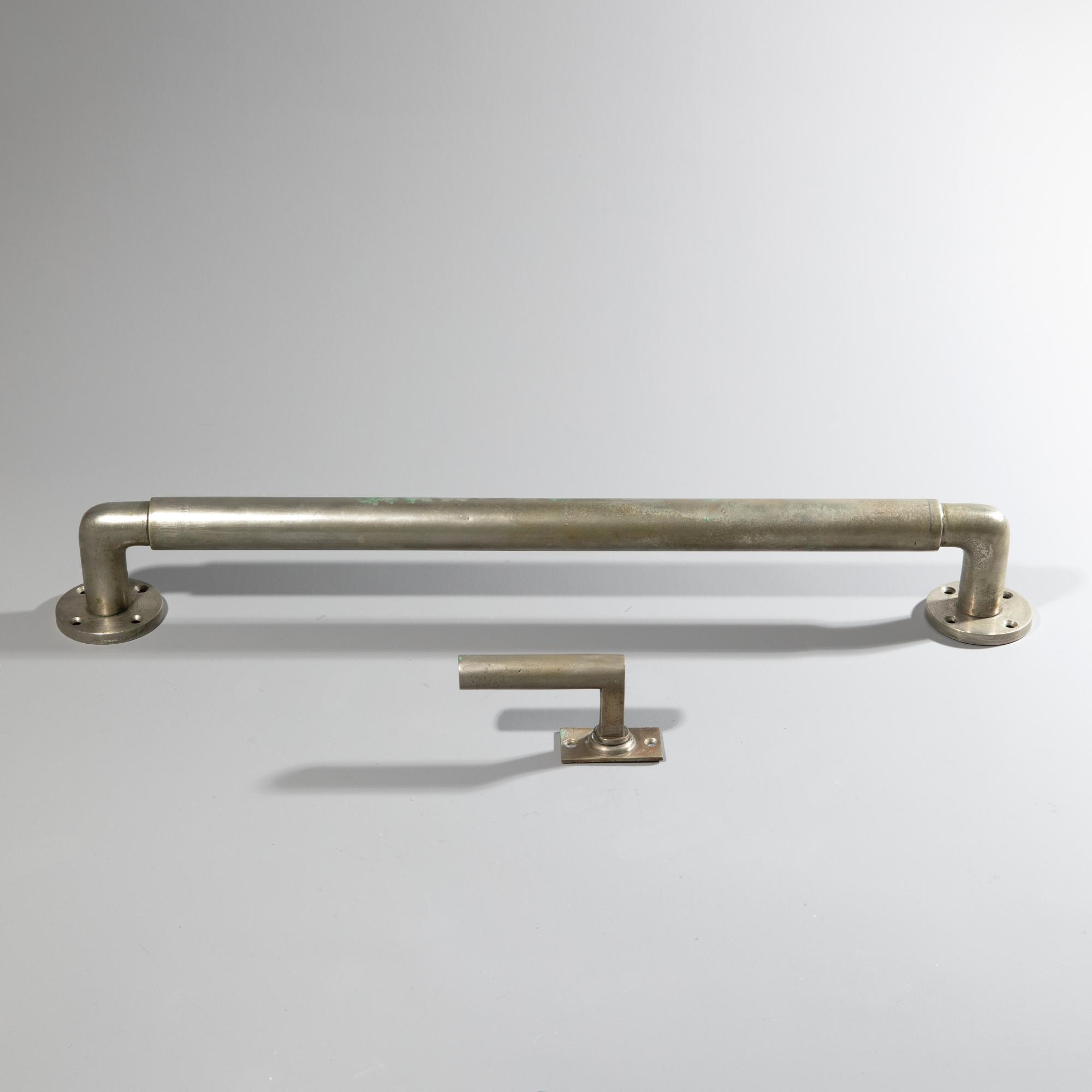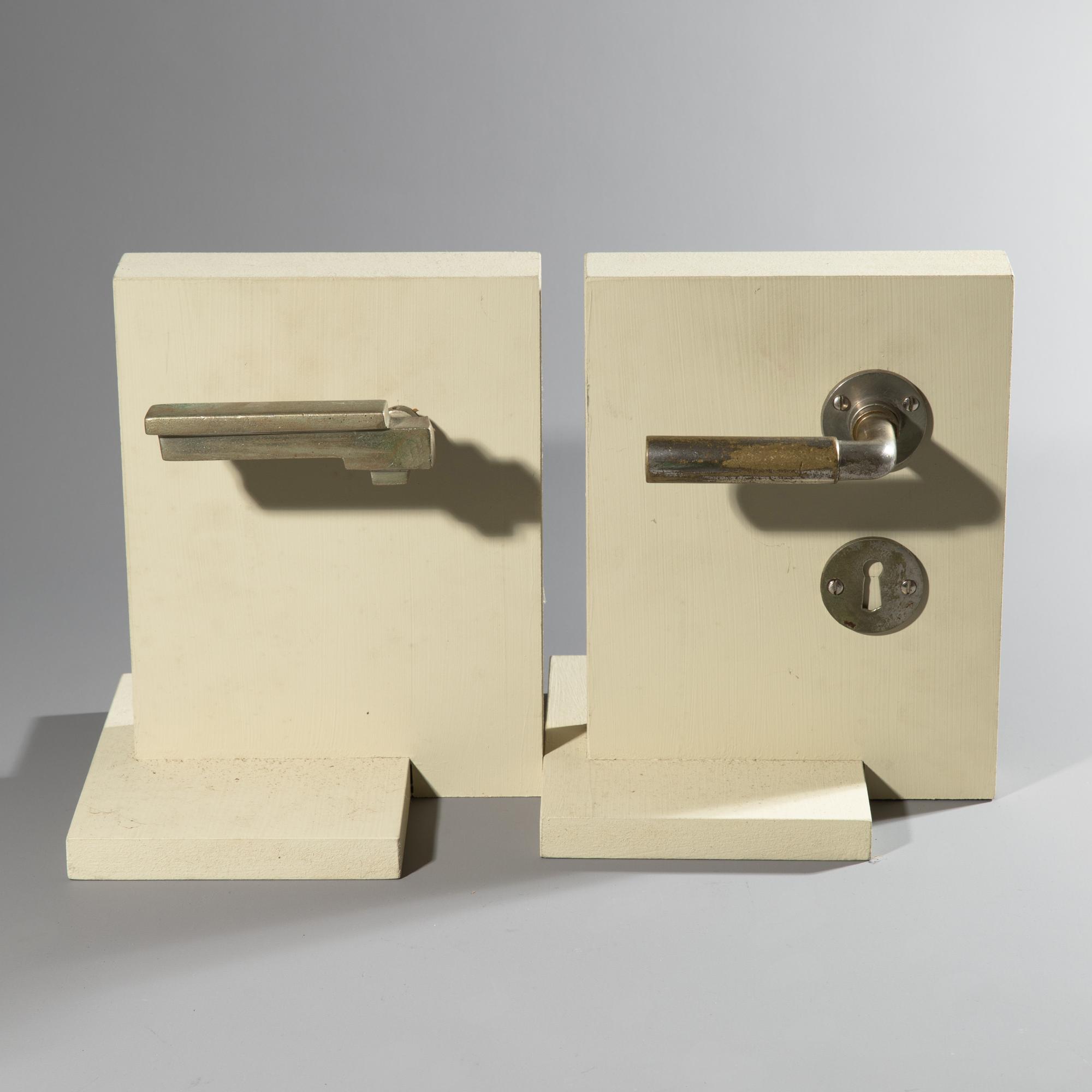 Gropius Türdrücker mit Langschild. Entwurf 1922. Vernickeltes Metall. Frankfurter Normendrücker Modell 963 und 983. Entwurf von Ferdinand Kramer um 1925. Vernickeltes Metall. WEHA Türdrücker Garnitur Modell 988. Entwurf 1928 aus Nicksil.Fensterriegel aus vernickeltem Metall. Trürdrückerstange aus vernickeltem Metall. L. 56 cm, B. 6 cm.