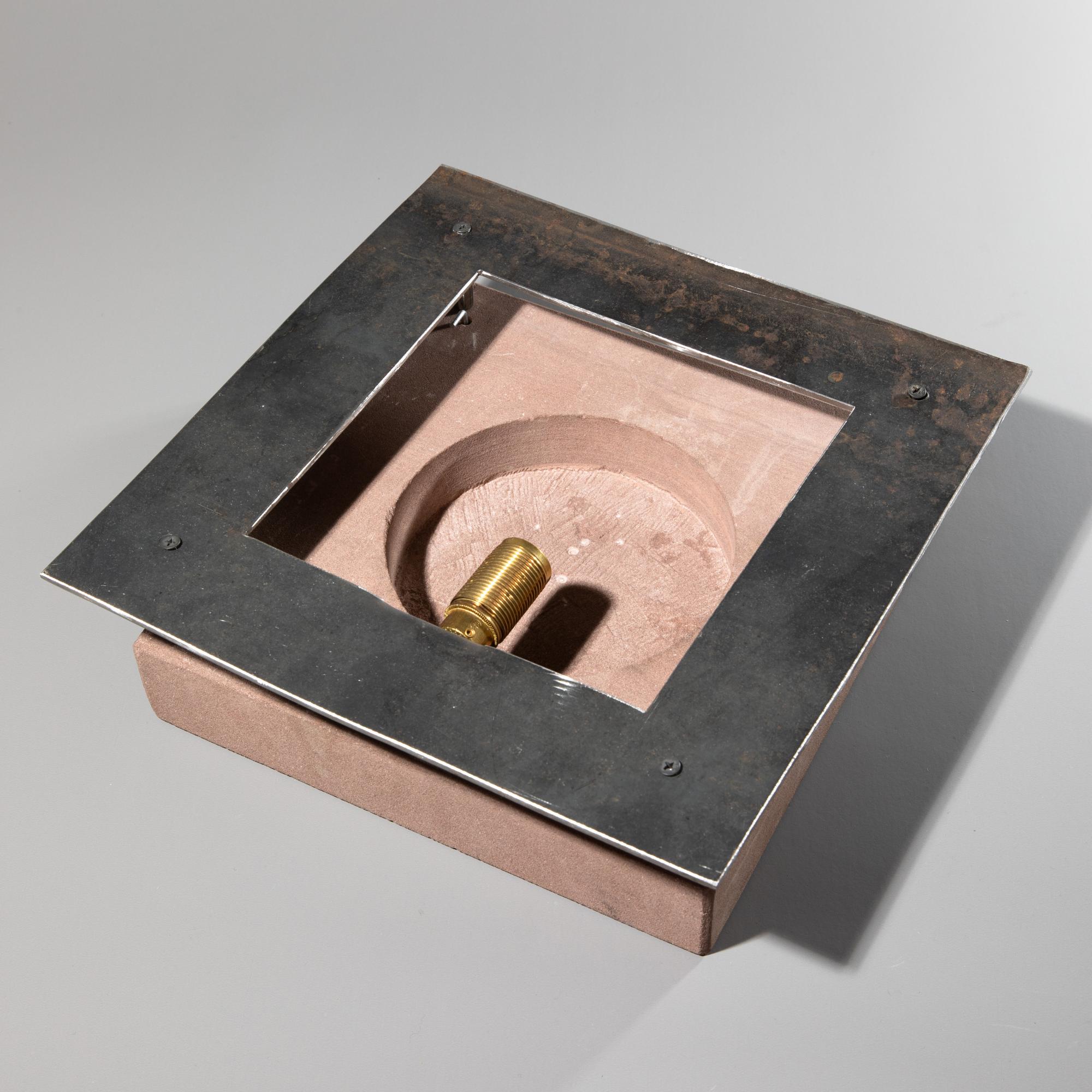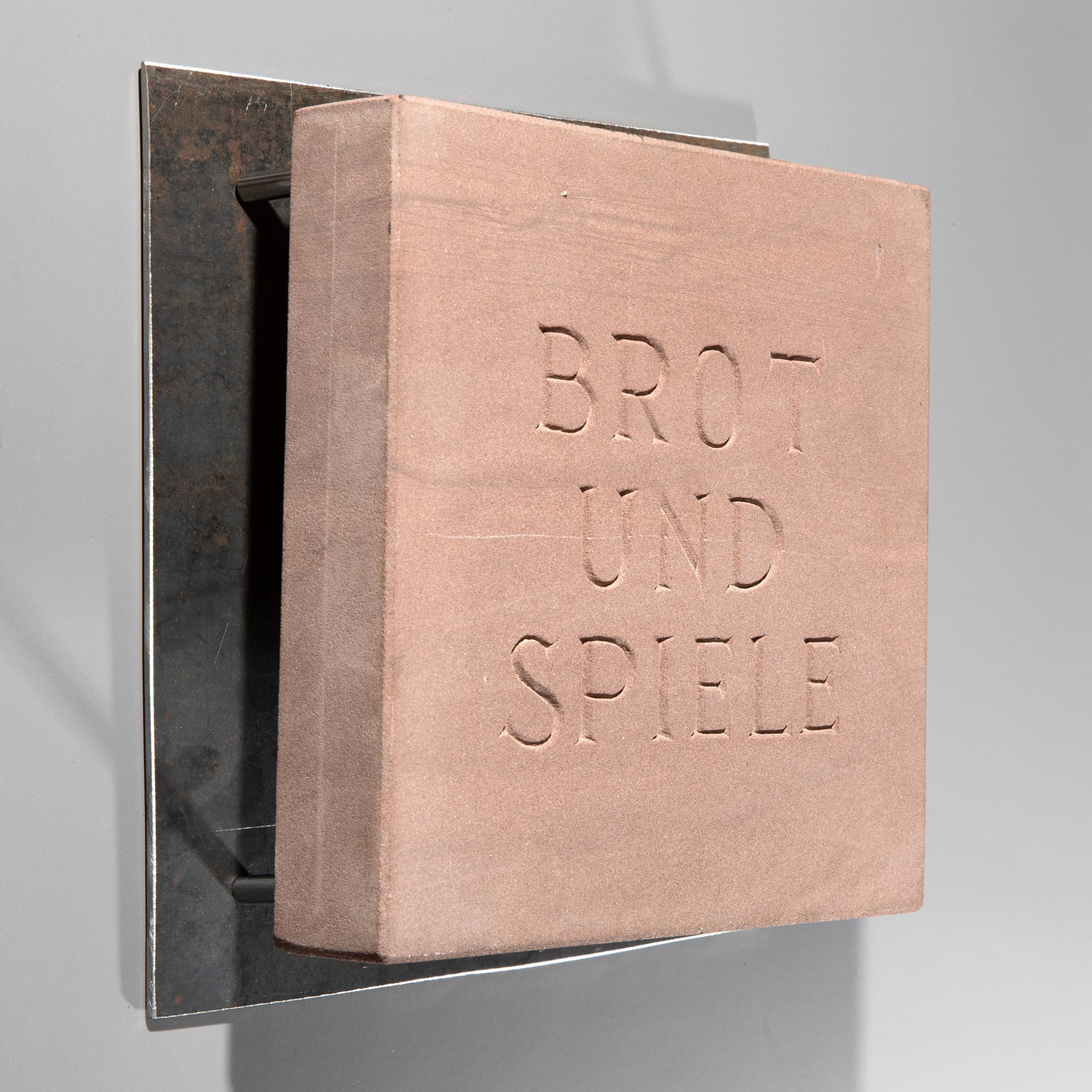 Entwurf um 1990. Ausführung Wolfgang Laubersheimer. Stahl, Steinplatte mit Inschrift. 30,5 x 31 x10 cm.