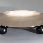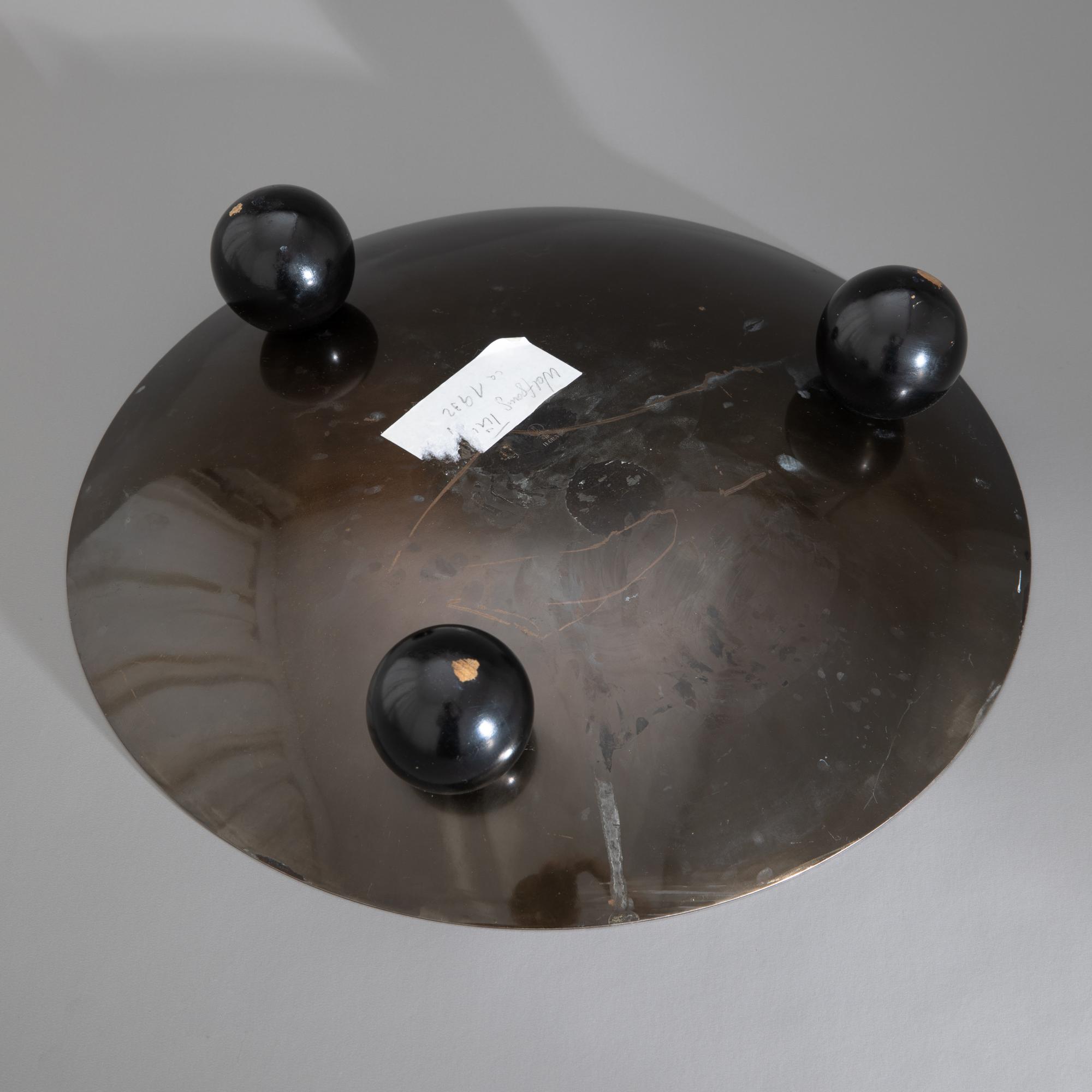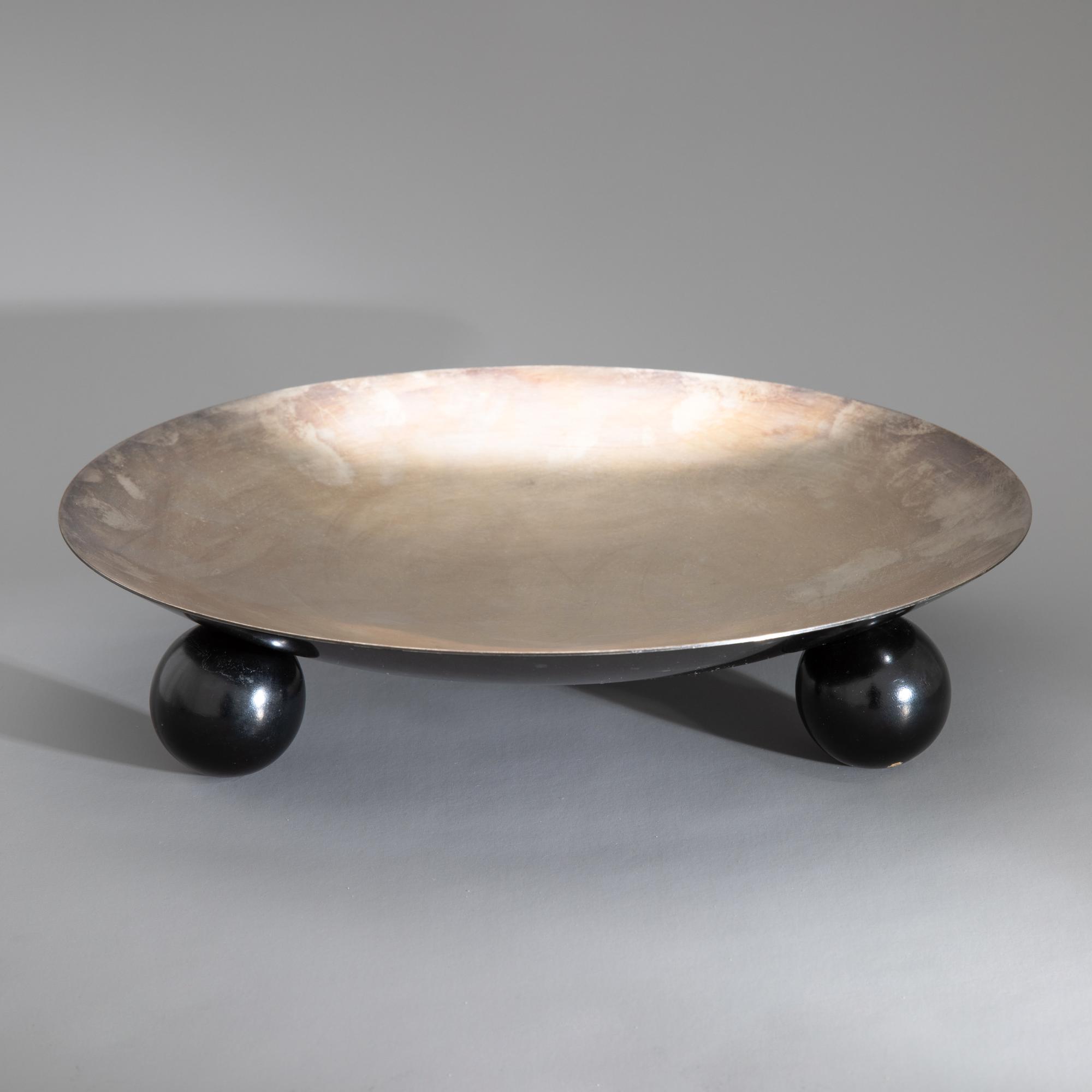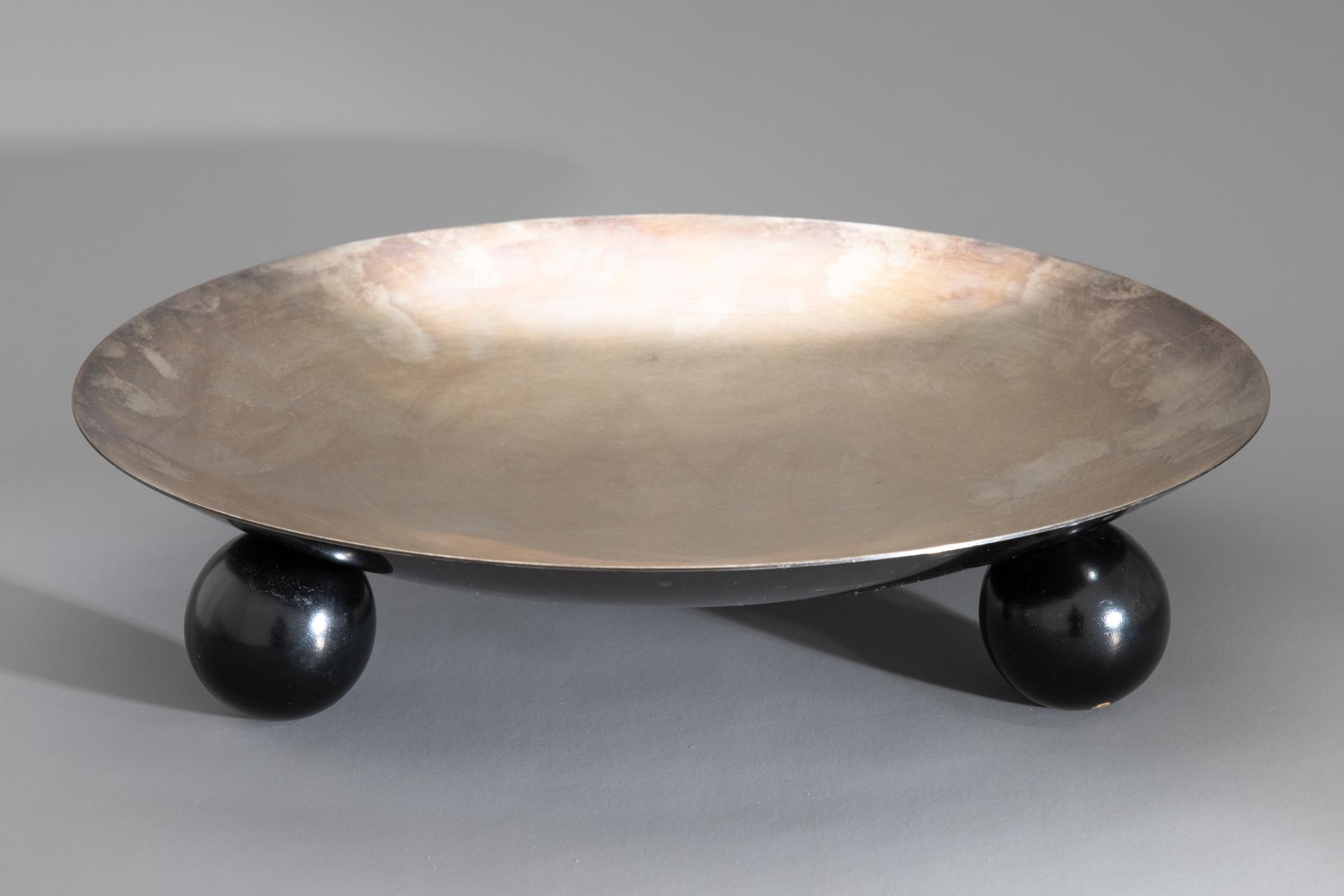 Entwurf um 1928. Ausführung Würtembergische Metallwarenfabrik. Ikora-Metall, unterseitig brüniert, lackierte Holzkugeln. H. 8 cm, D. 35,5 cm. Unterseitig punziert mit Firmenmarke und Ikora WMF.
