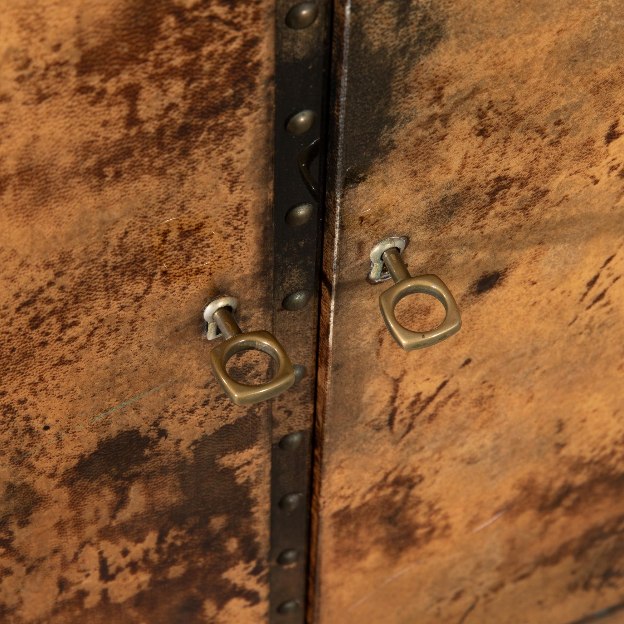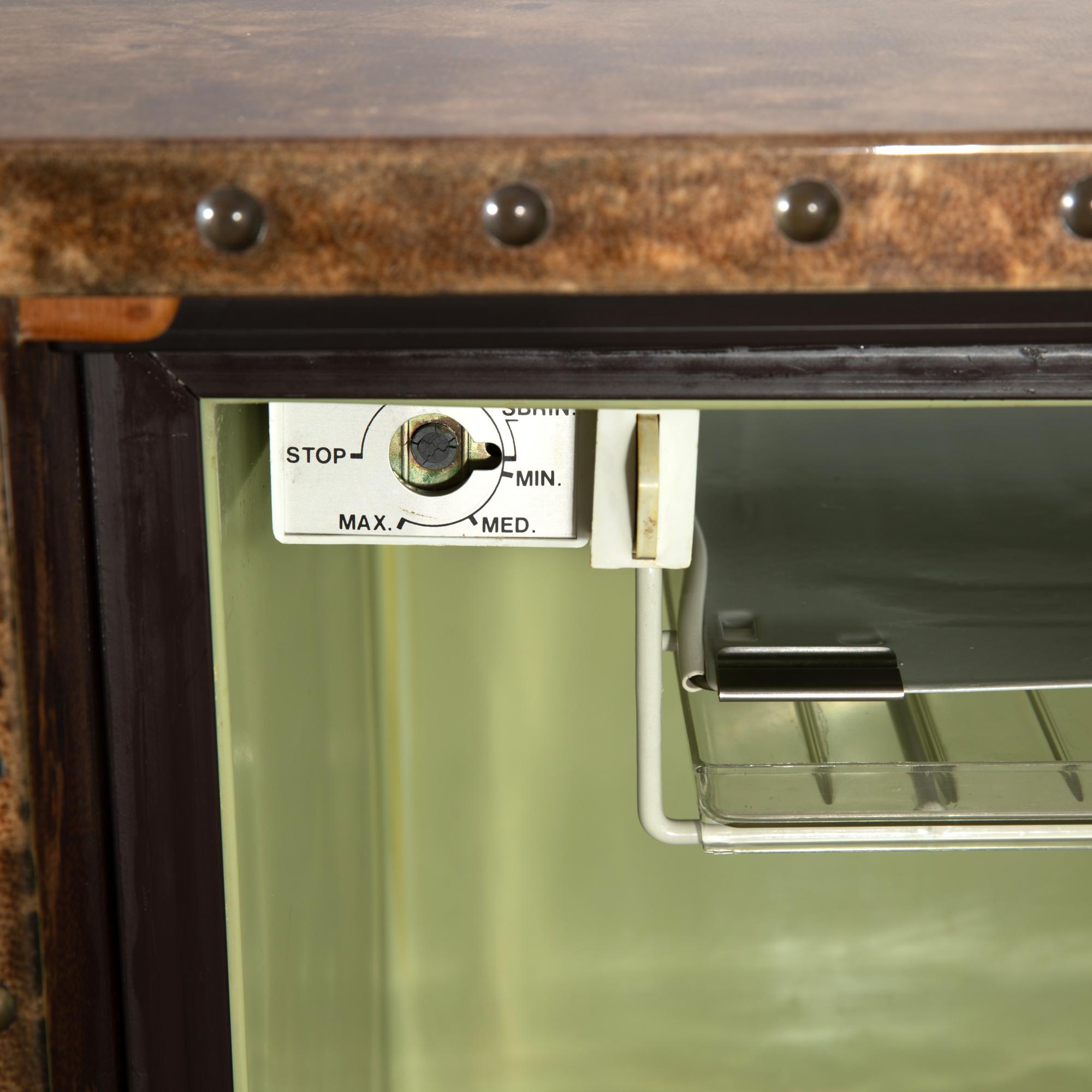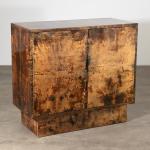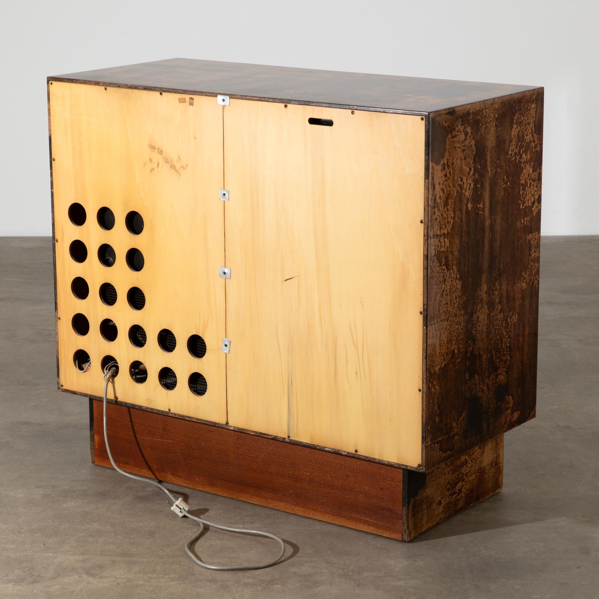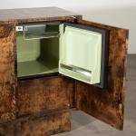 Entwurf 1960/70er Jahre. Ausführung Tura, Milano. Holzkorpus bezogen mit braunem Pergament / Ziegenhaut und klarlackierter Oberfläche, Ziernägel aus Messing. Interieur mit Beleuchtung, Spiegeln und Kühlschrank. 101 x 112 x 52 cm. Rückseitig mit Aufkleber bezeichnet.