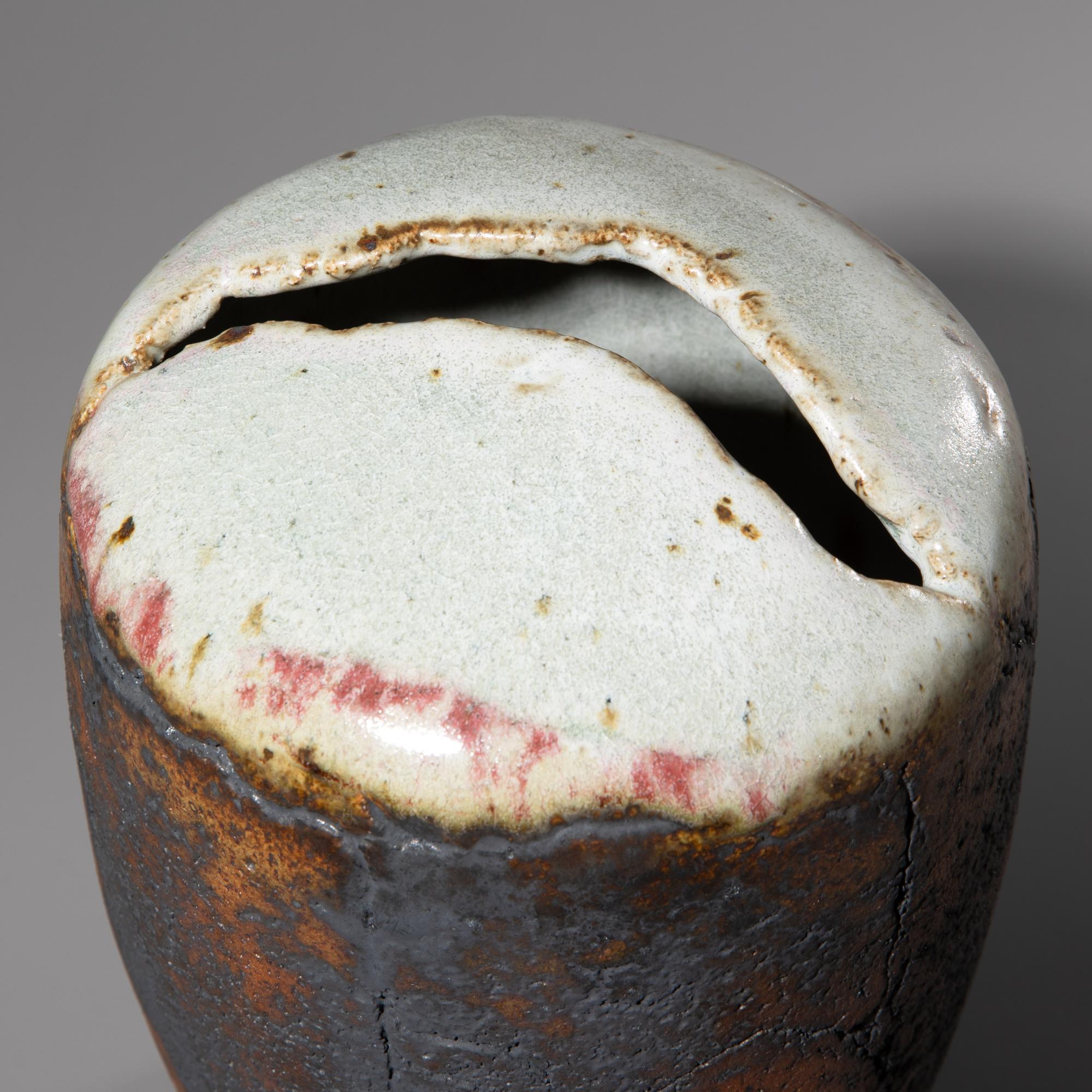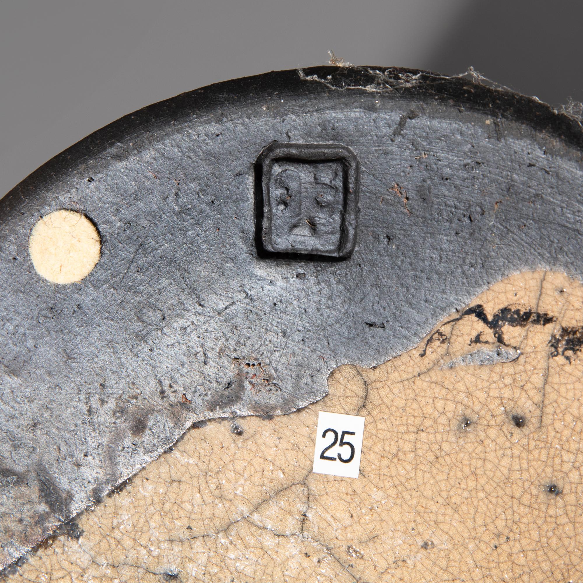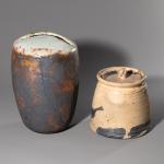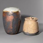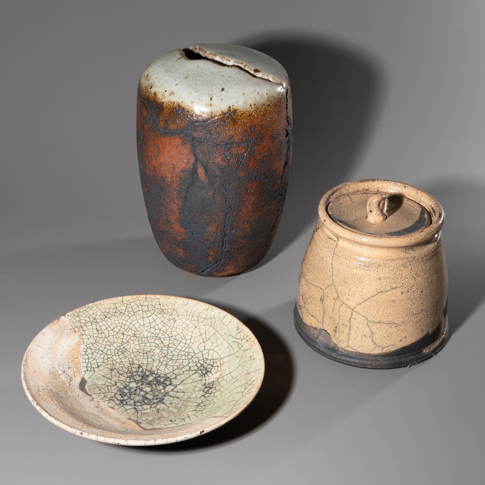 Keramik, glasiert. Eine Vase, ein Deckelgefäß, eine flache Schale. H. 26 cm / H. 17 cm / H. 5,5 cm, D. 24 cm. Jeweils unterseitig bezeichnet mit Werkstattmarke.