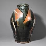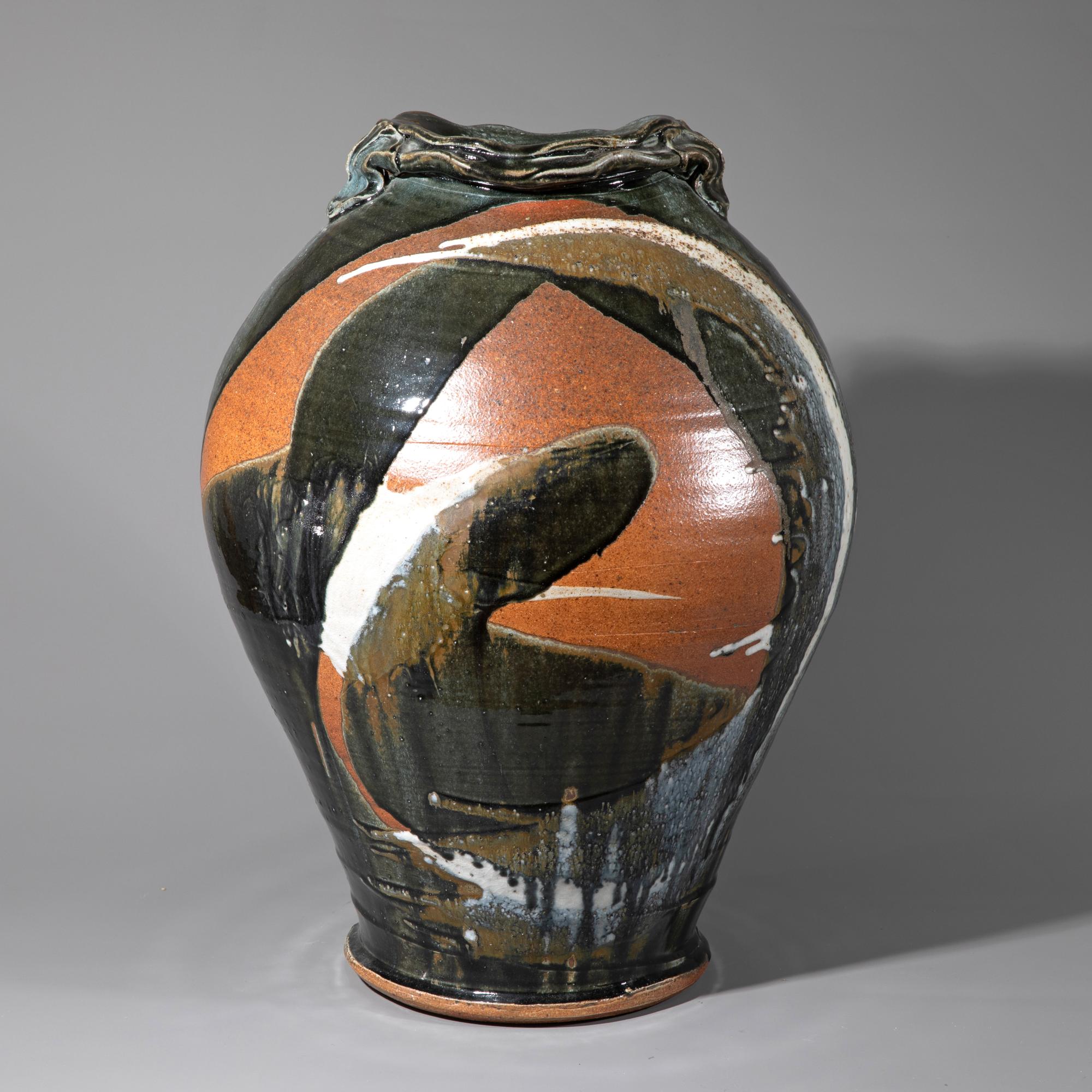 Keramik, glasiert. Bauchige Vase mit rundem Stand und gewelltem Mündungsrand. 57 x 40 x 30 cm. Am Stand bezeichnet mit Künstlersignet.