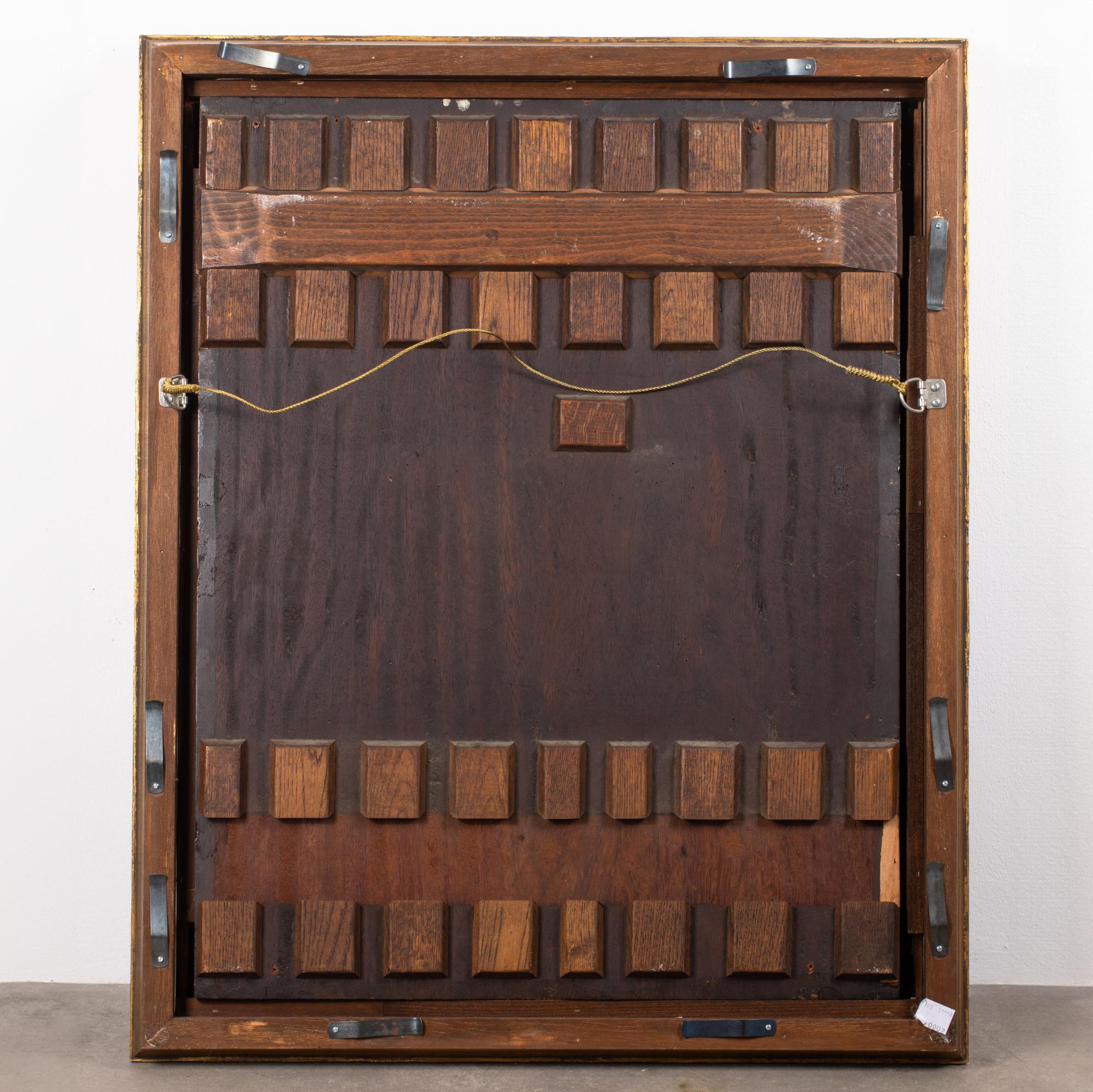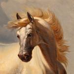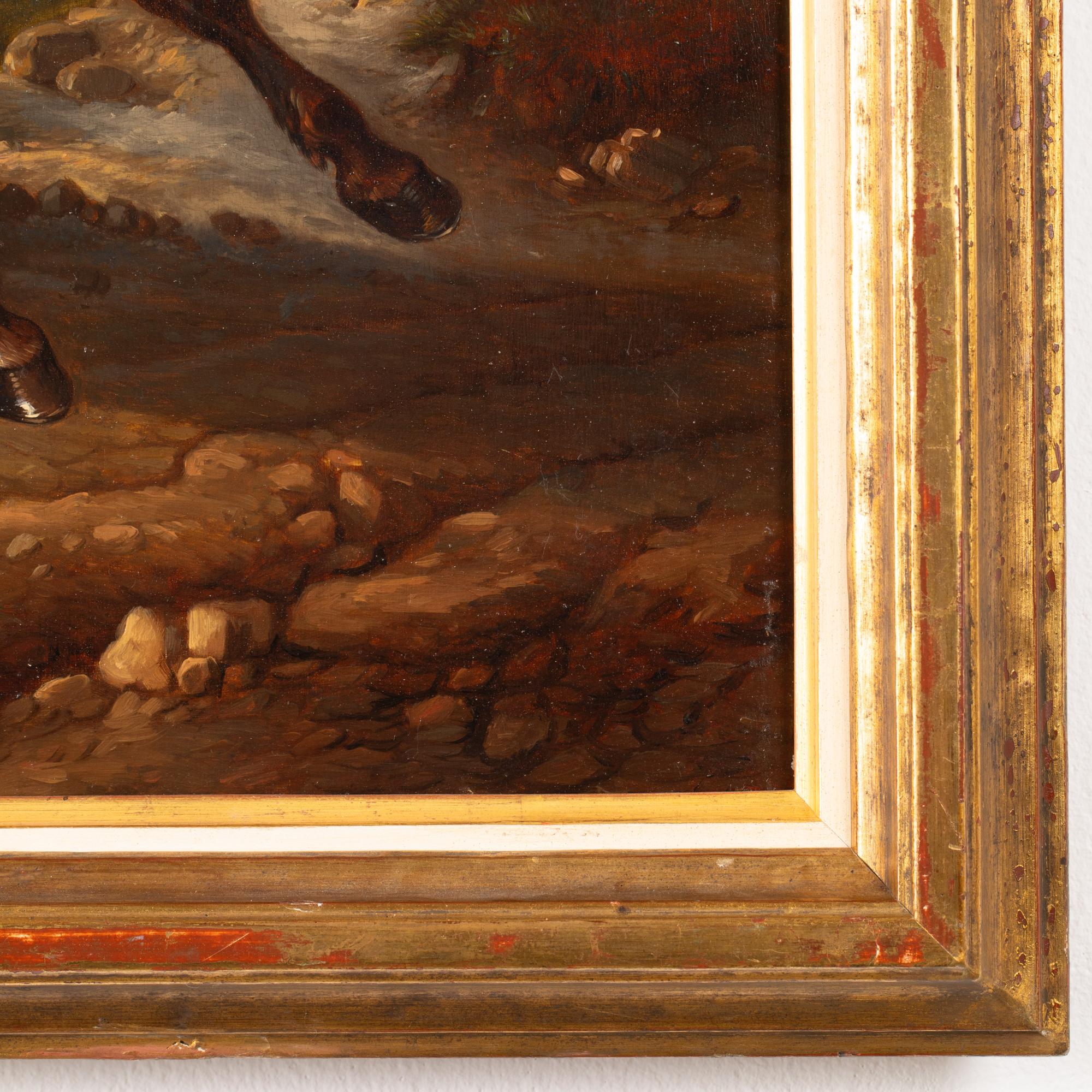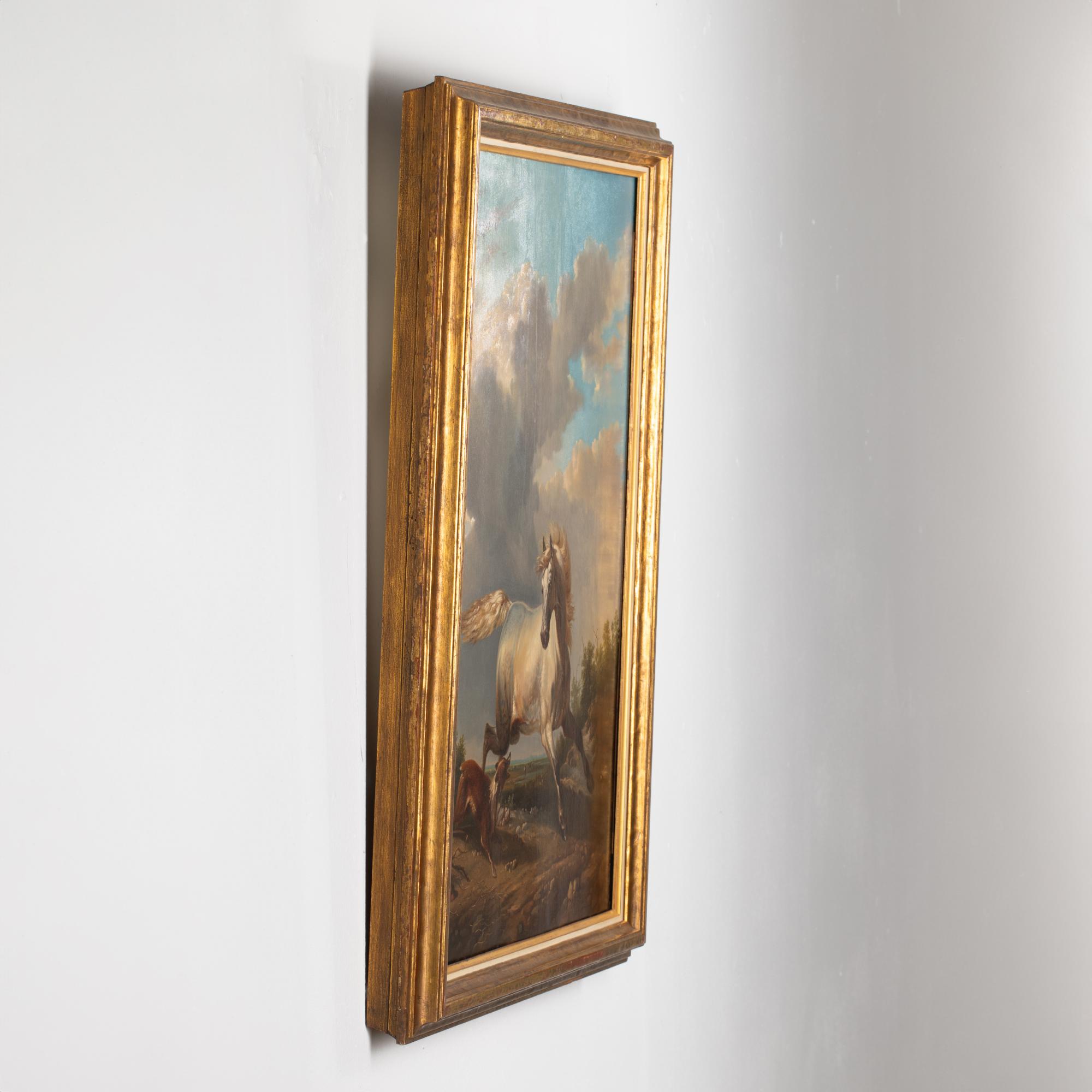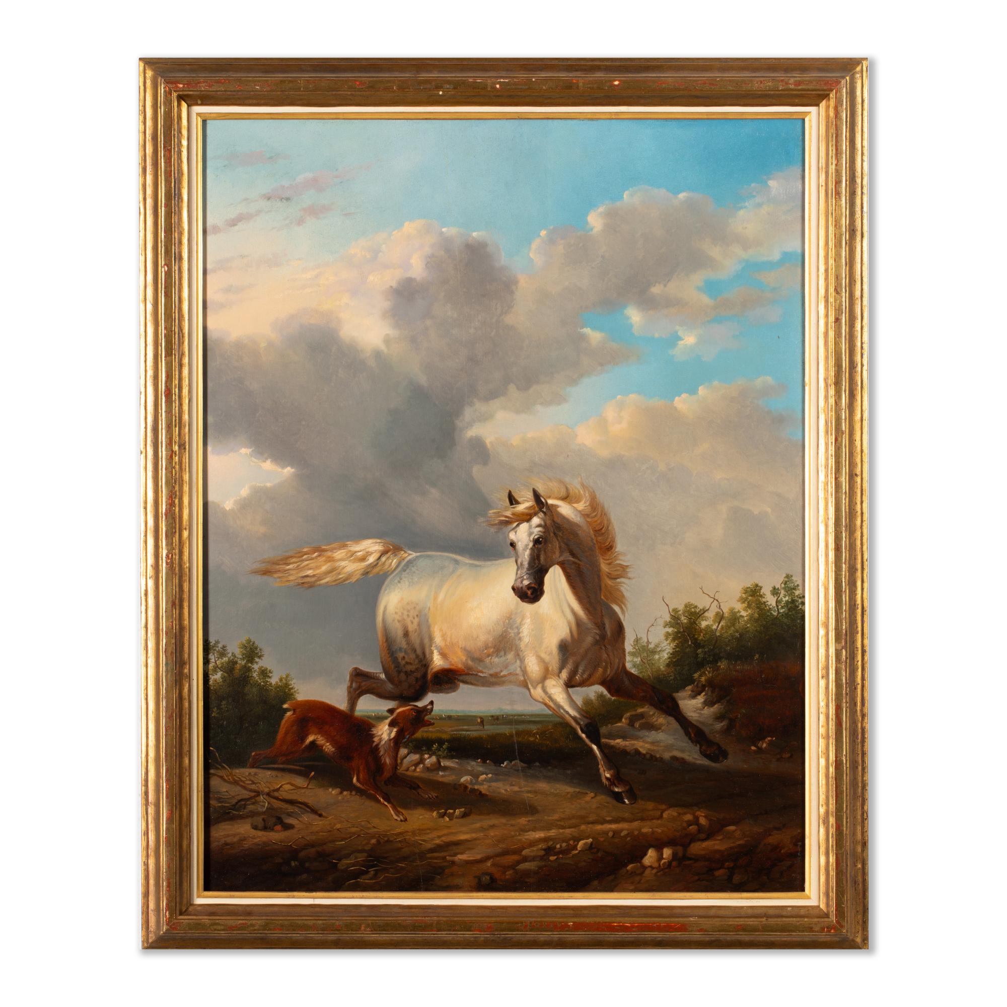 Öl auf Eichenholz, parkettiert. 66 x 51 cm. Gallopierender Hengst mit Hund in weiter Landschaft unter hohem Wolkenhimmel. Gerahmt und so beschrieben.