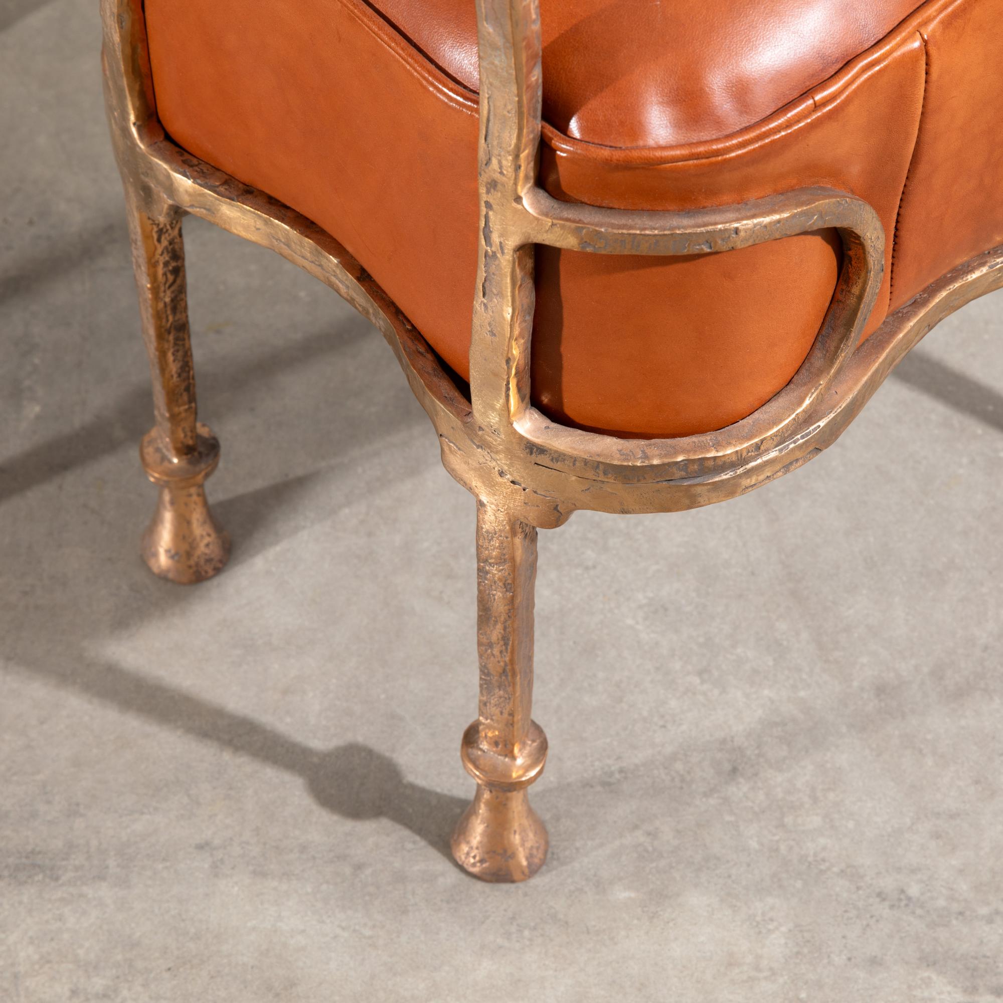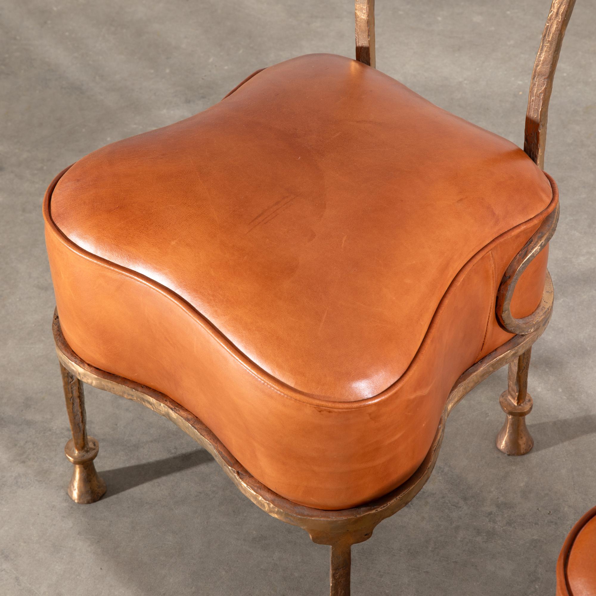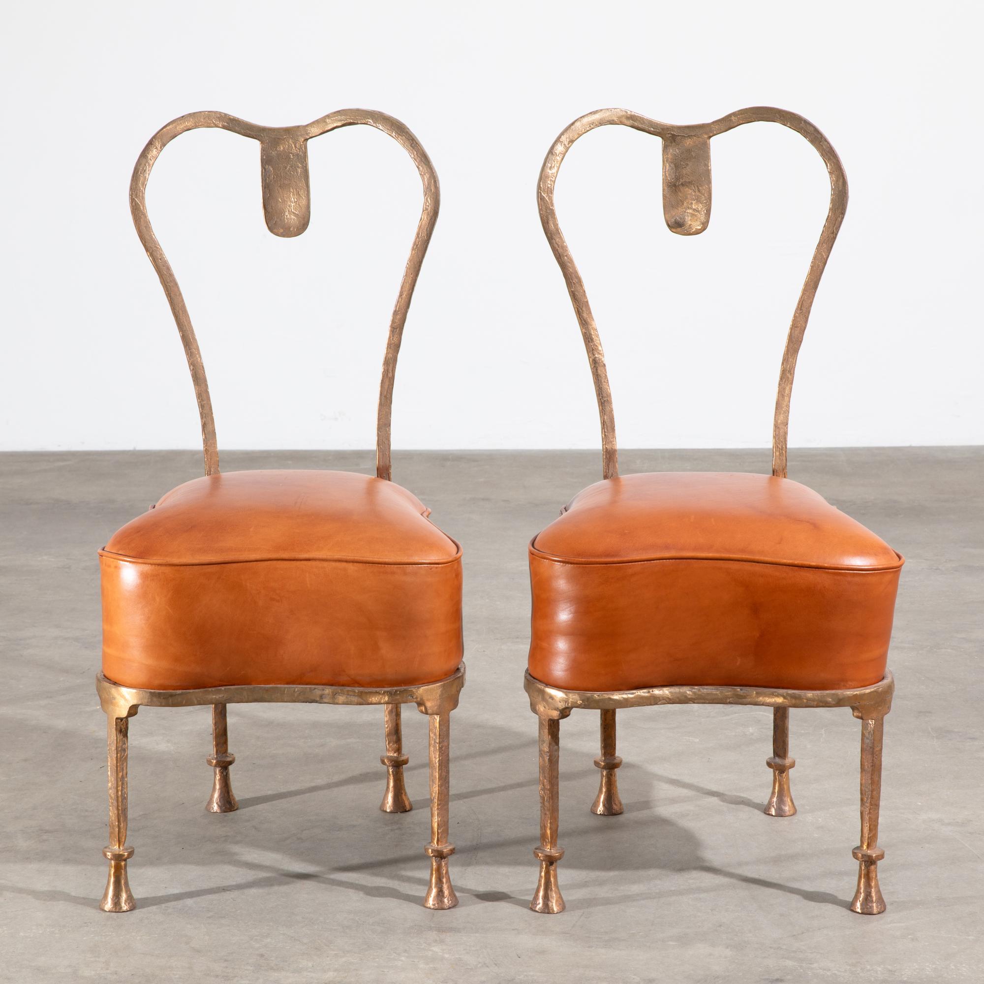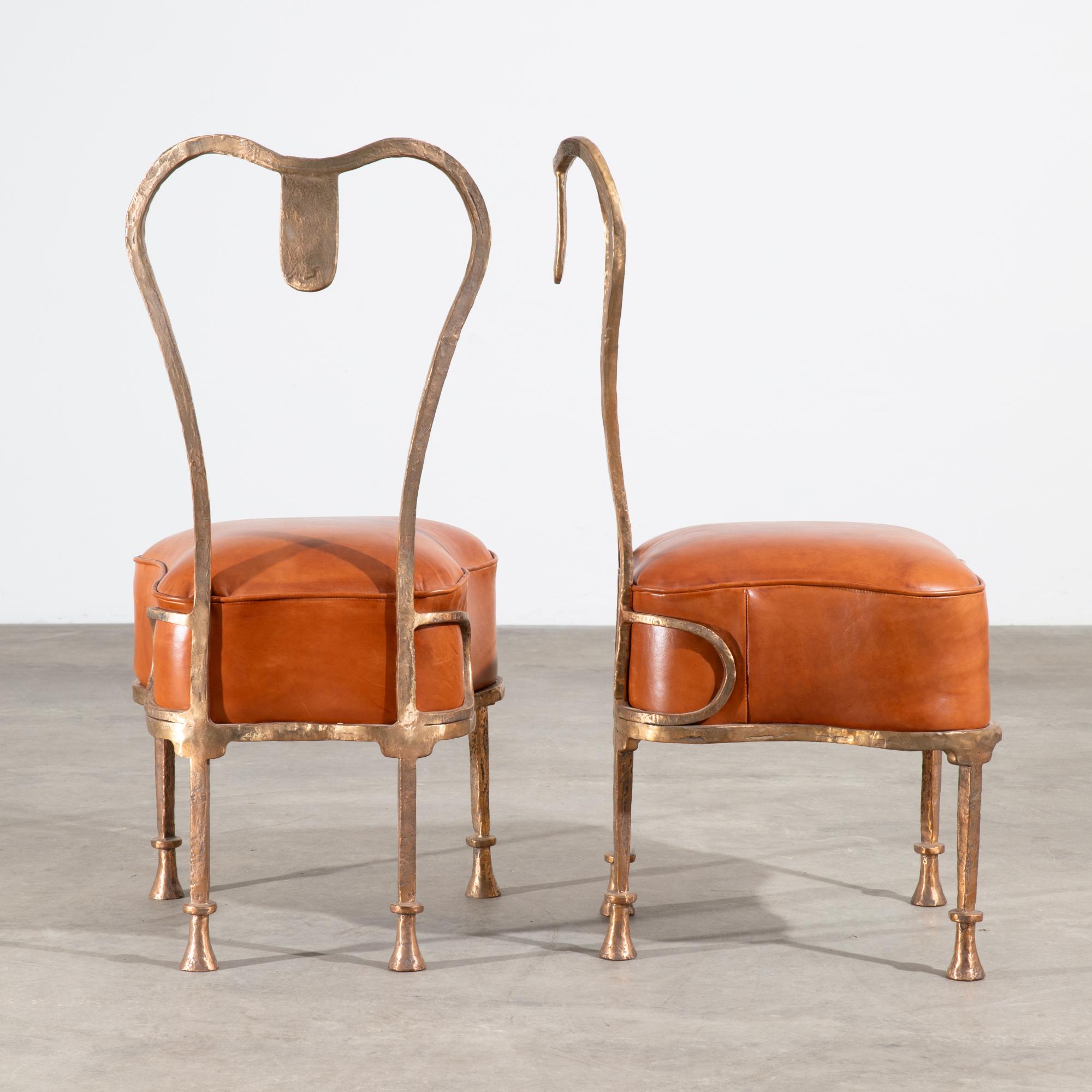 Entwurf 1996. Ausführung Studio Eric Schmitt. Bronze und Leder. 88 x 43 x 49 cm. Beide Stühle hinten links mit 'es' im Oval bezeichnet.