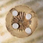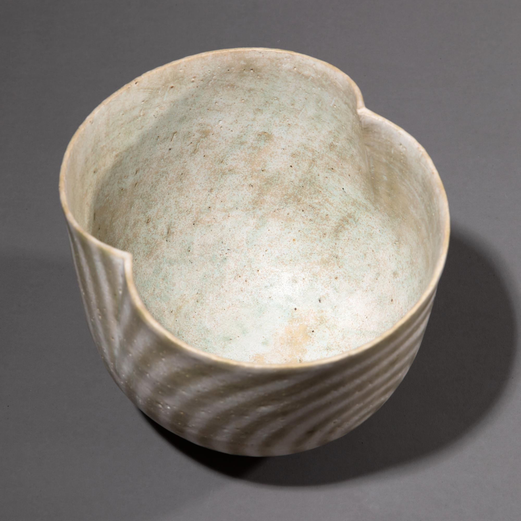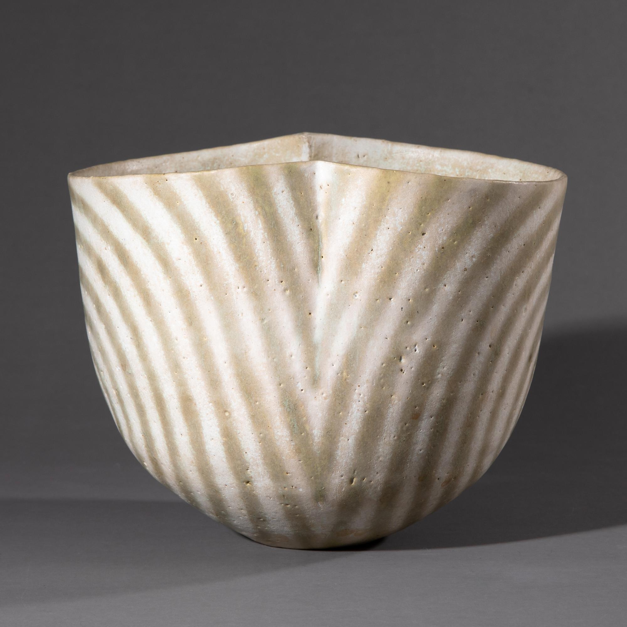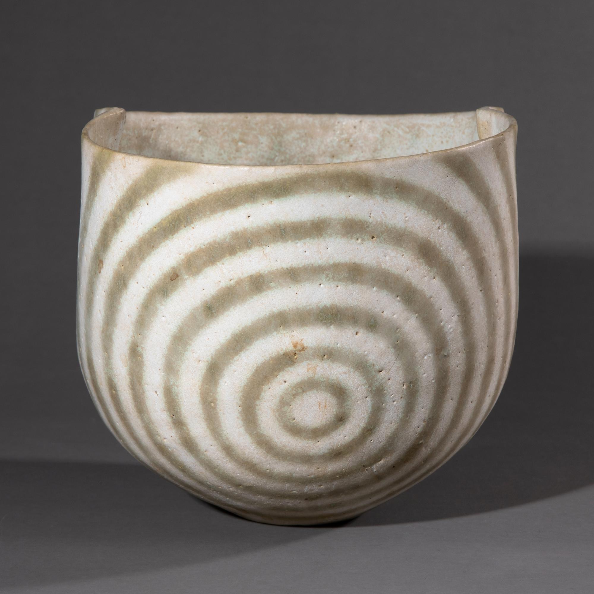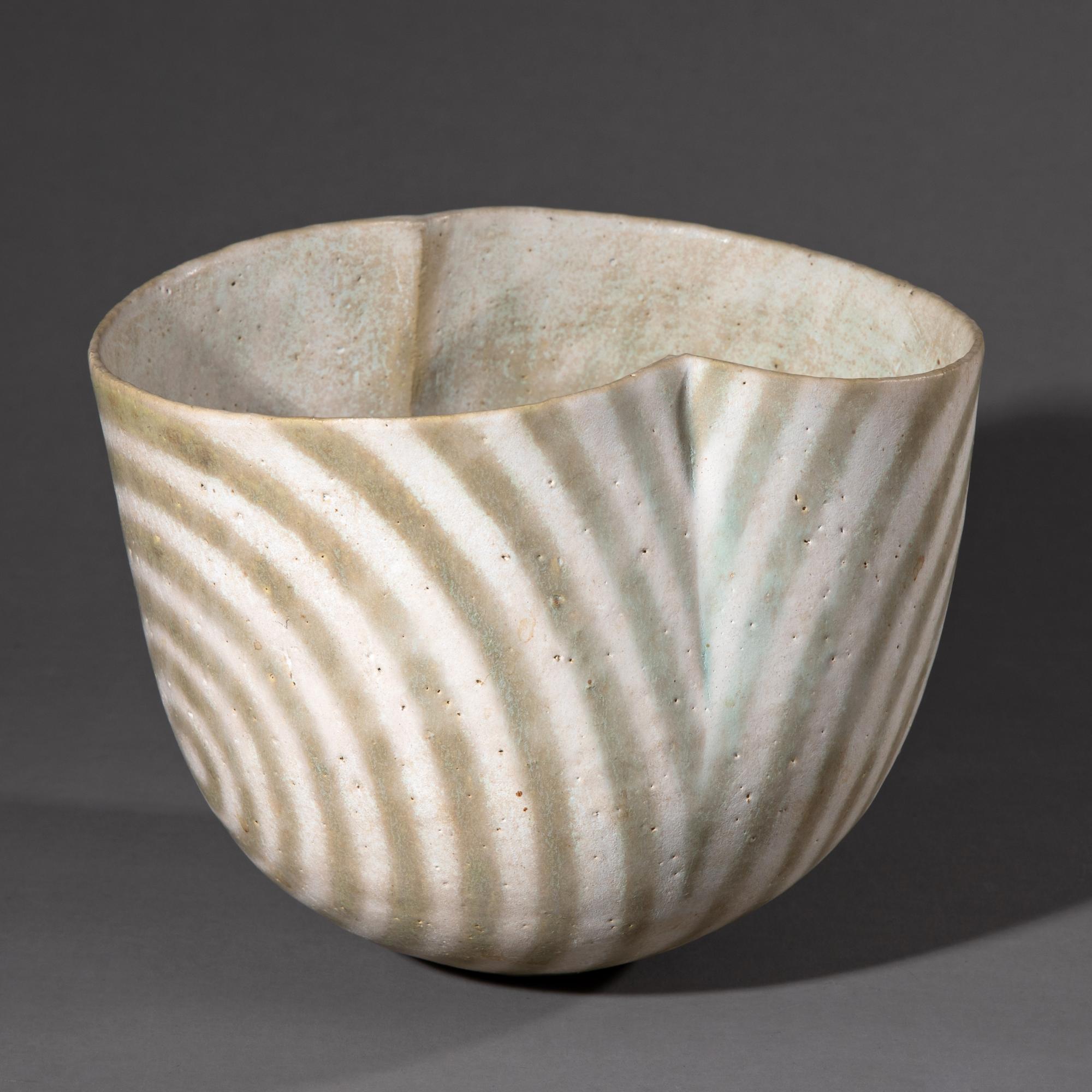 Keramik. Weiß und grün glasiert mit Streifendekor. 17,5 x 22 x 18 cm. Unterseitig bezeichnet mit Künstlersignet.