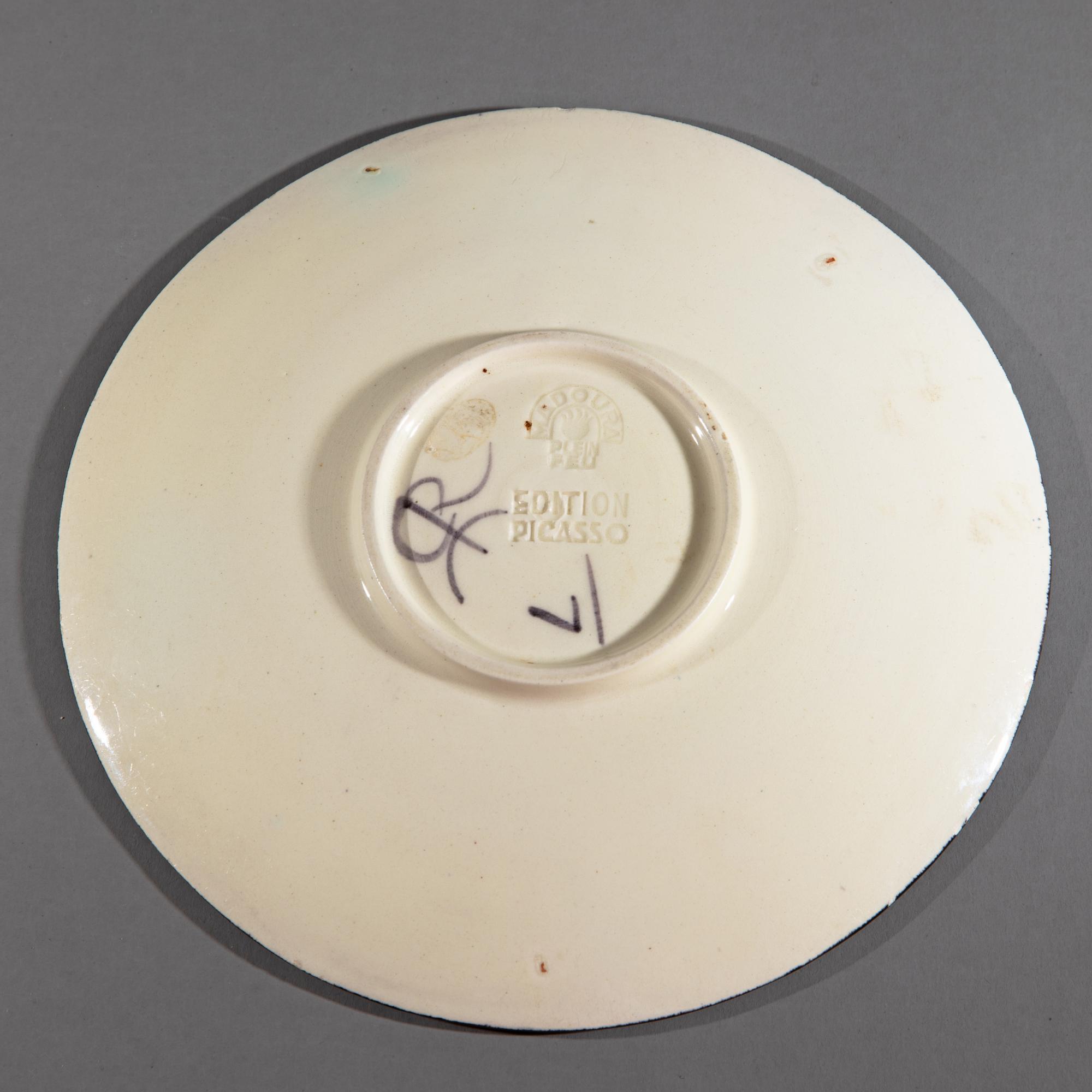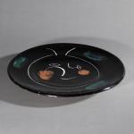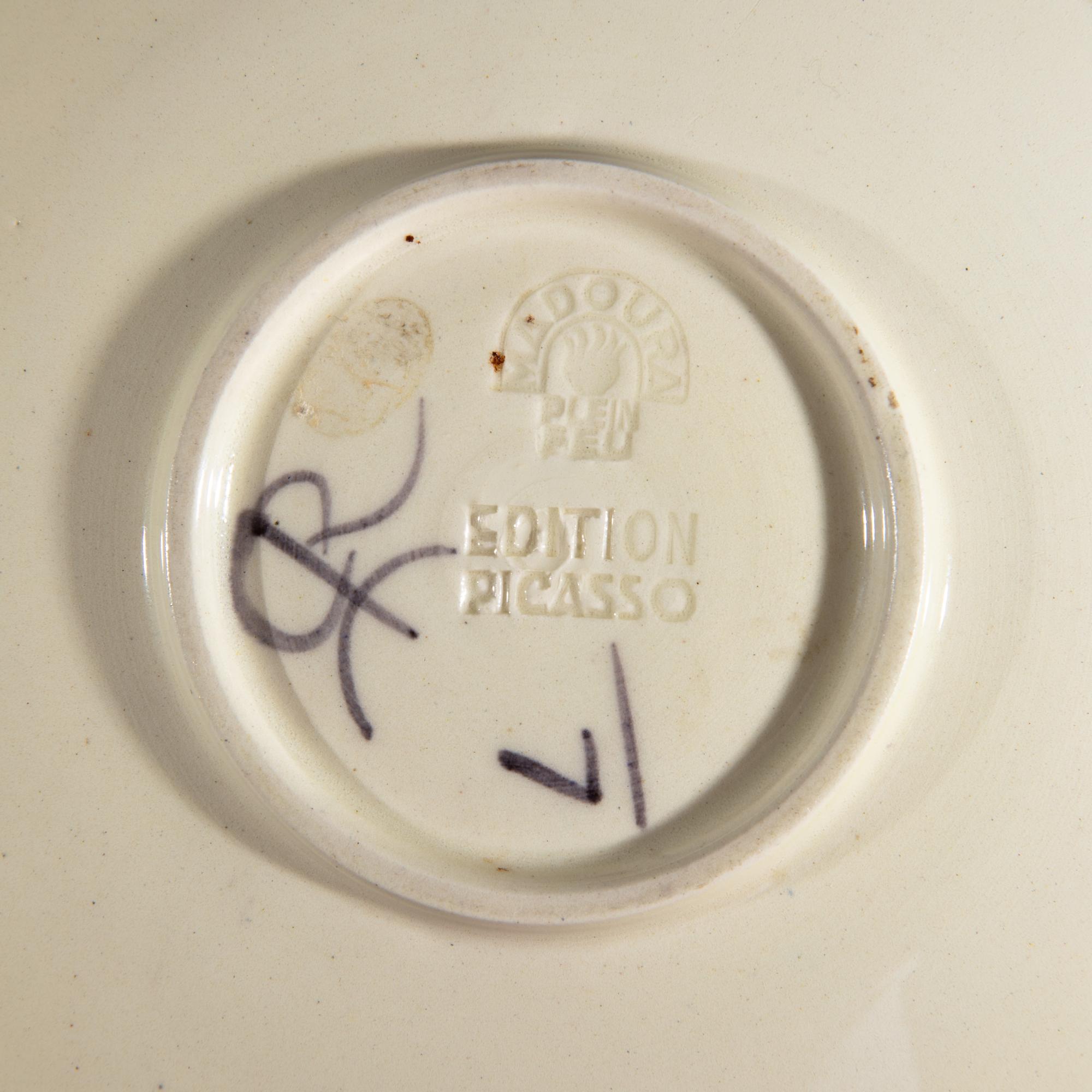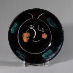 Weißer Steingutscherben, mit farbiger Engobe und Glasur. D. 24 cm. Auf der Unterseite bezeichnet: L (gemalt) und zwei Editionsstempel: MADOURA PLEIN FEU / EDITION PICASSO. Eines von 100 Exemplaren.