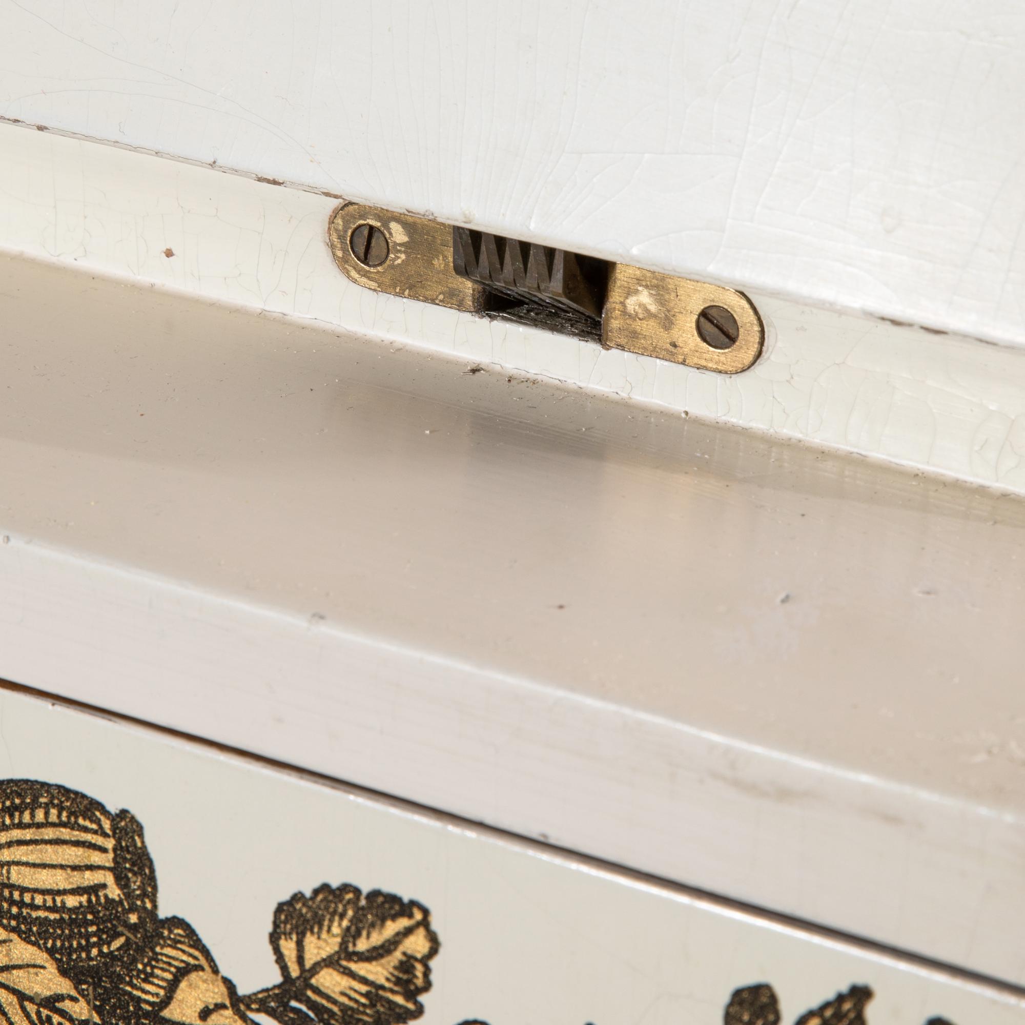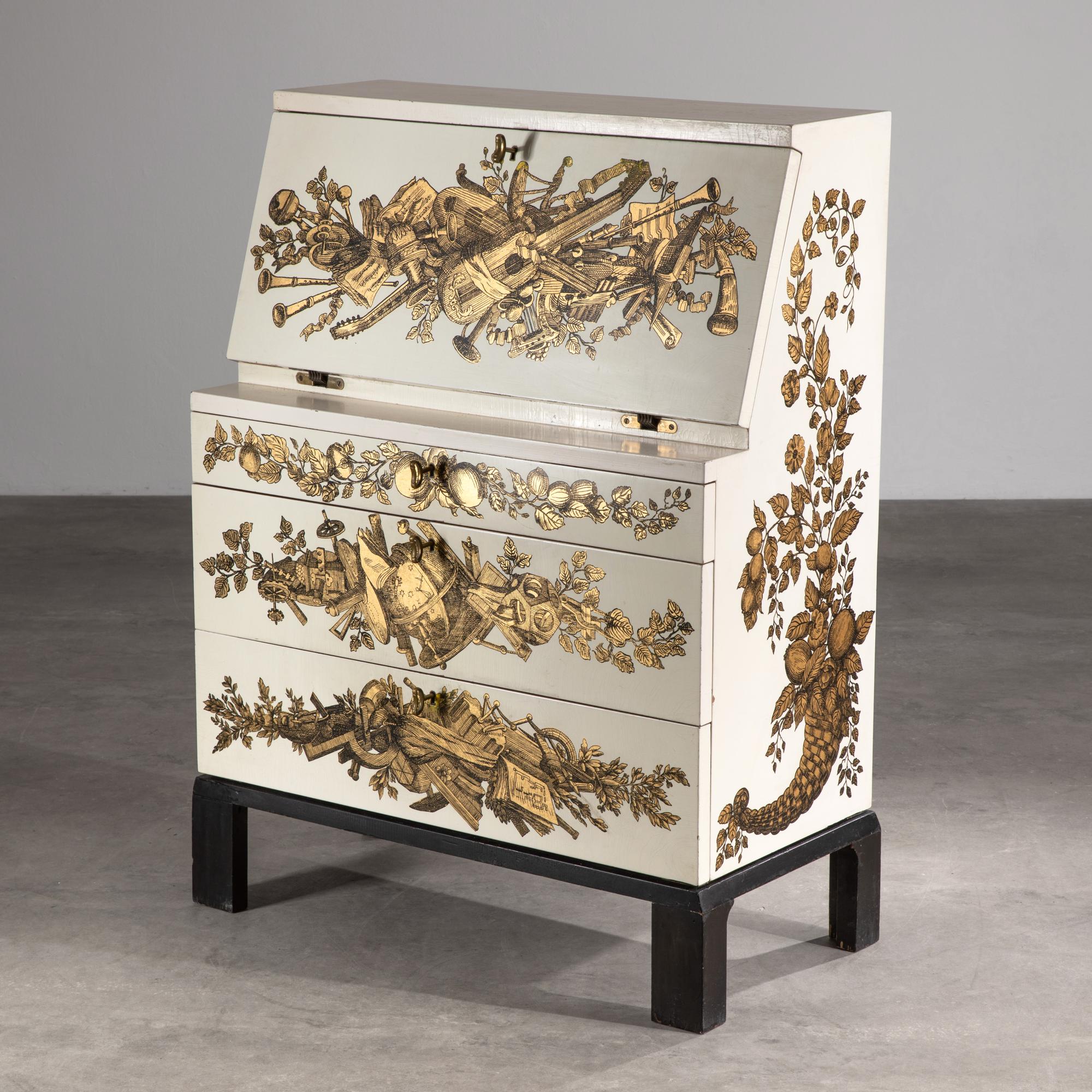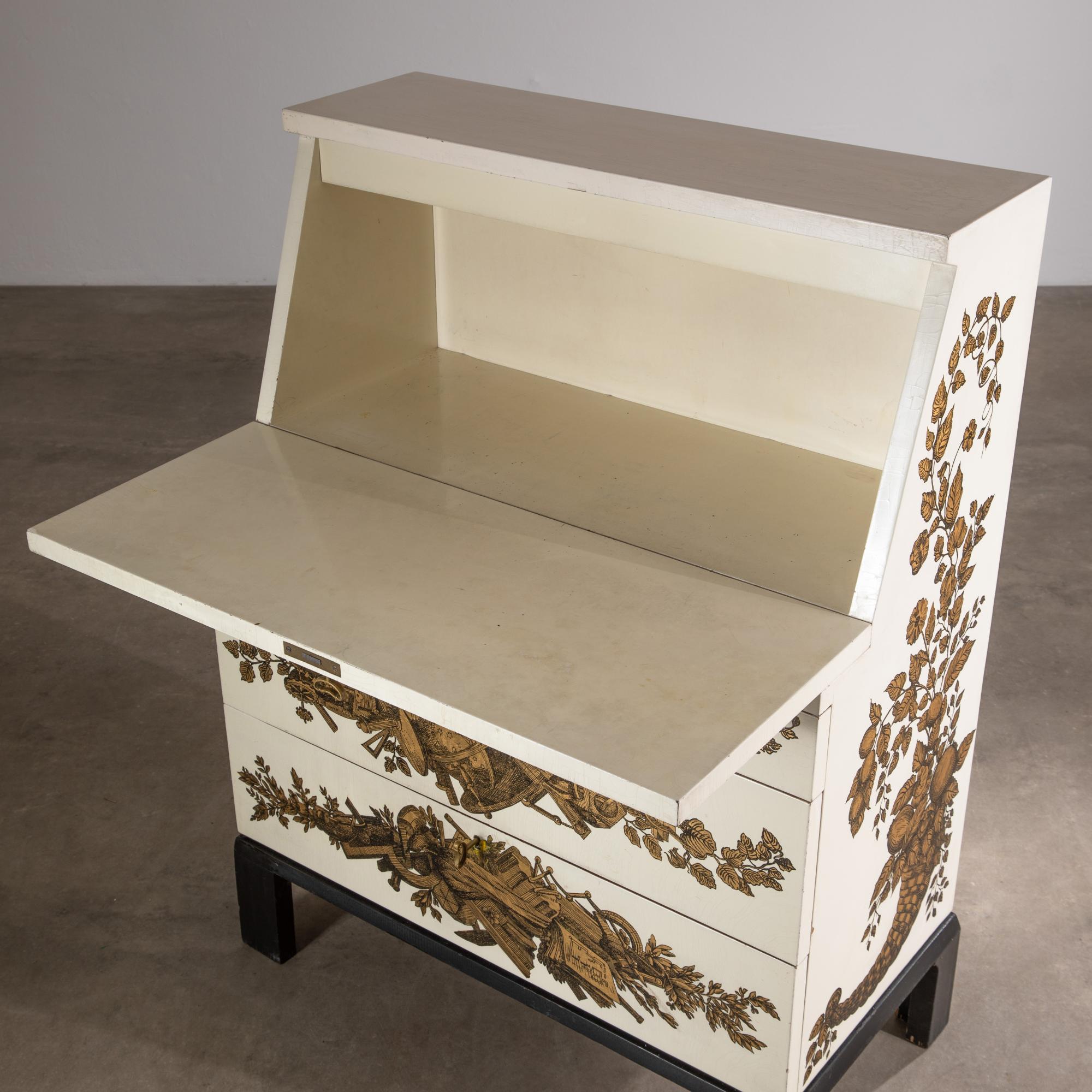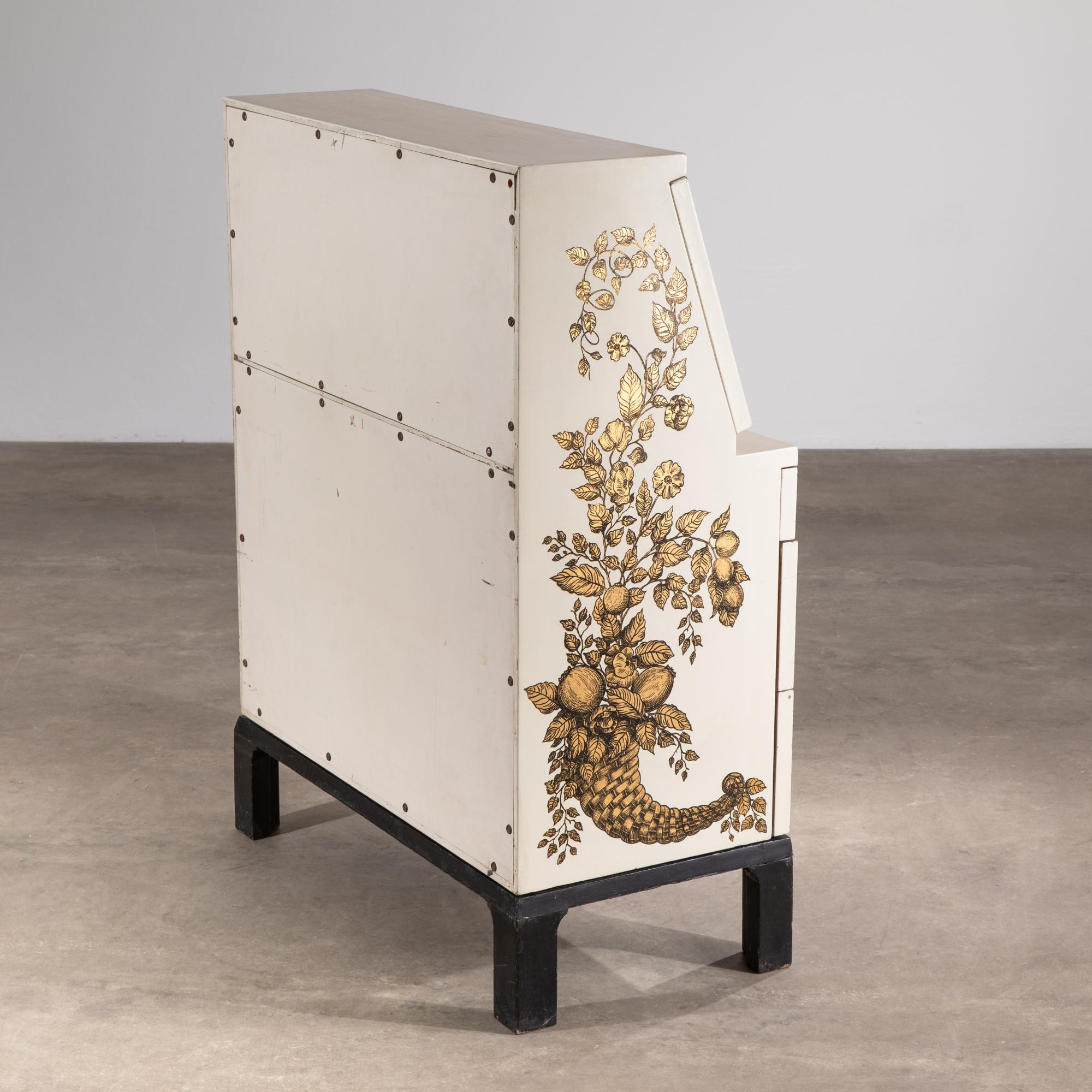 Entwurf um 1955. Holz lackiert, Goldtransfer-Druck. 108,5 x 80 x 40,5 cm.