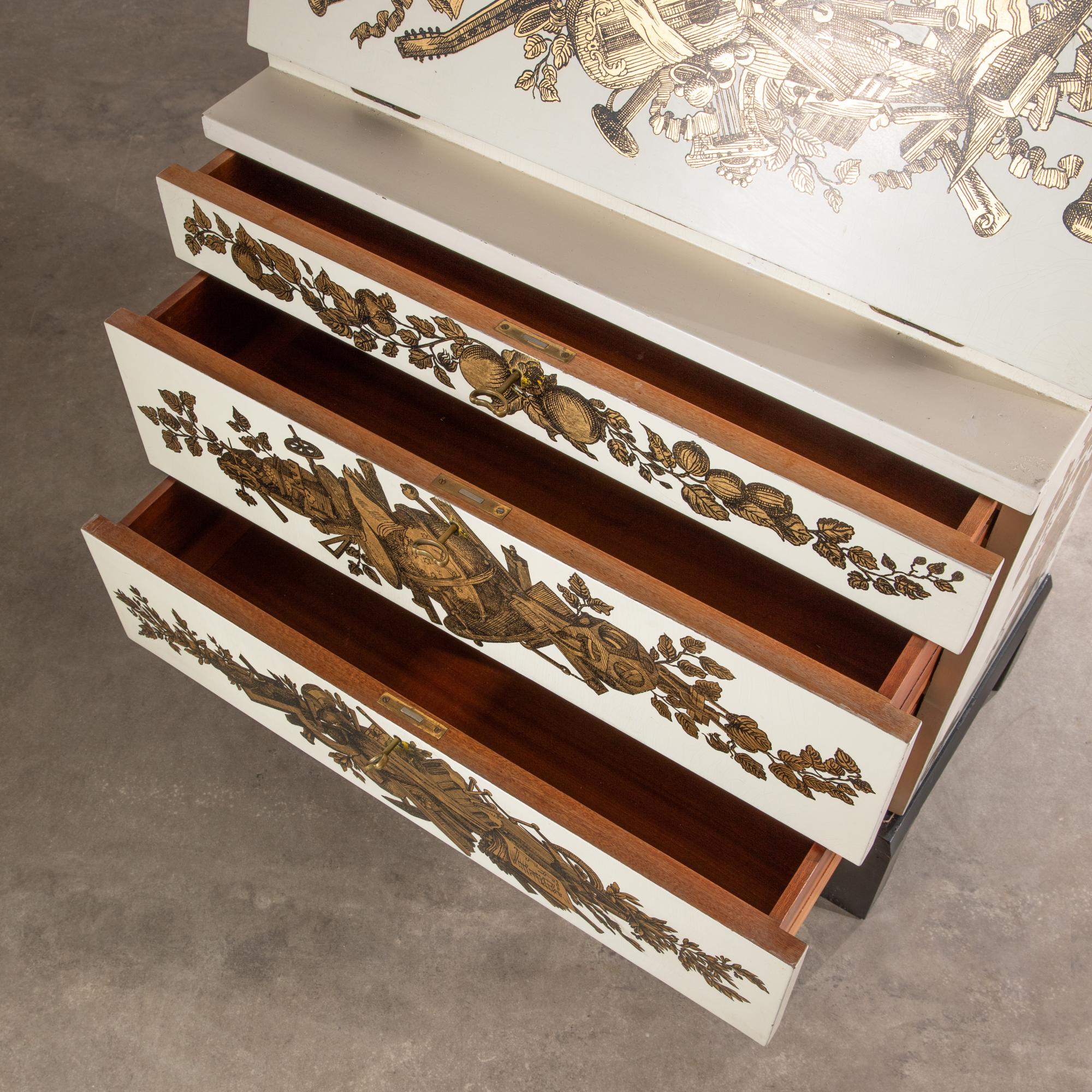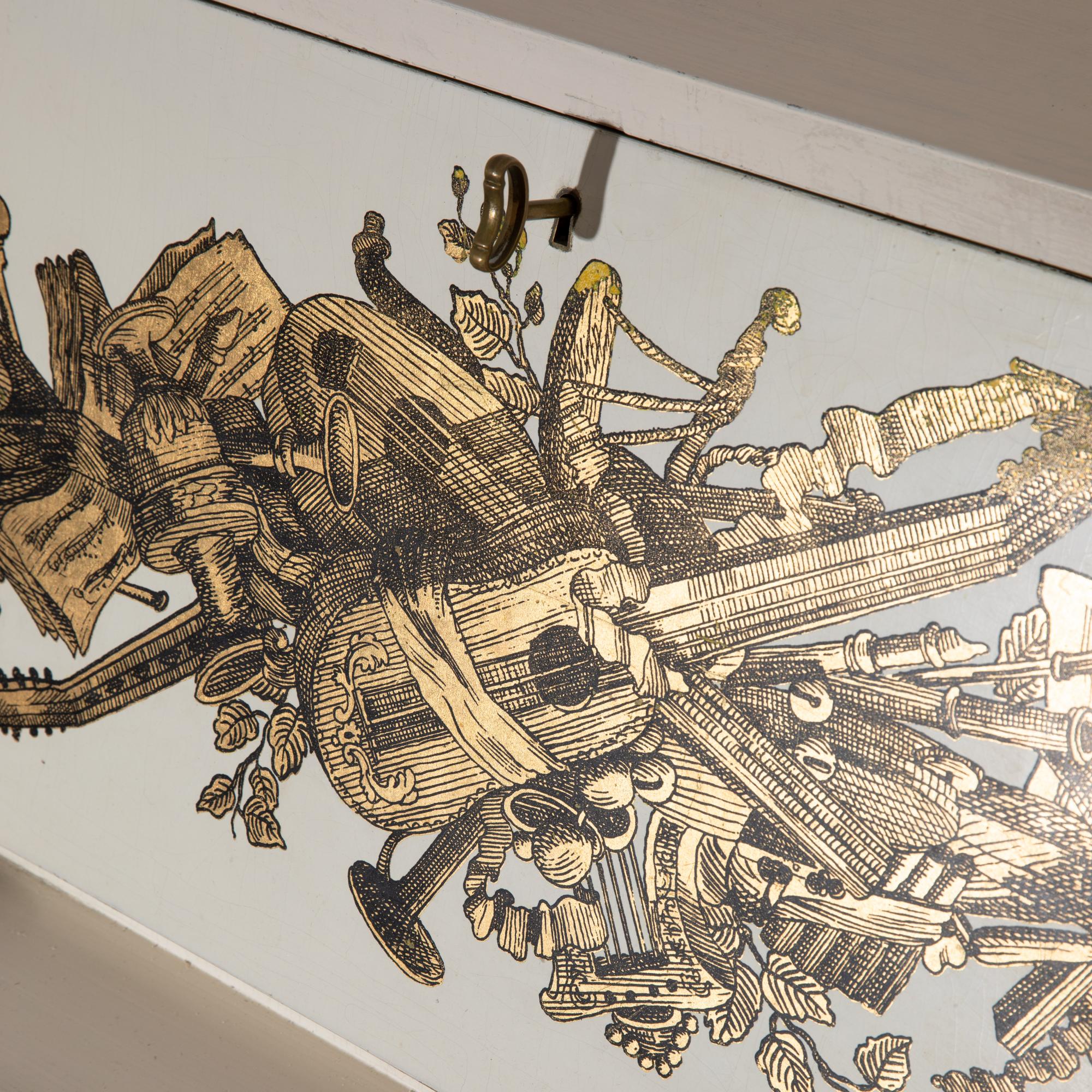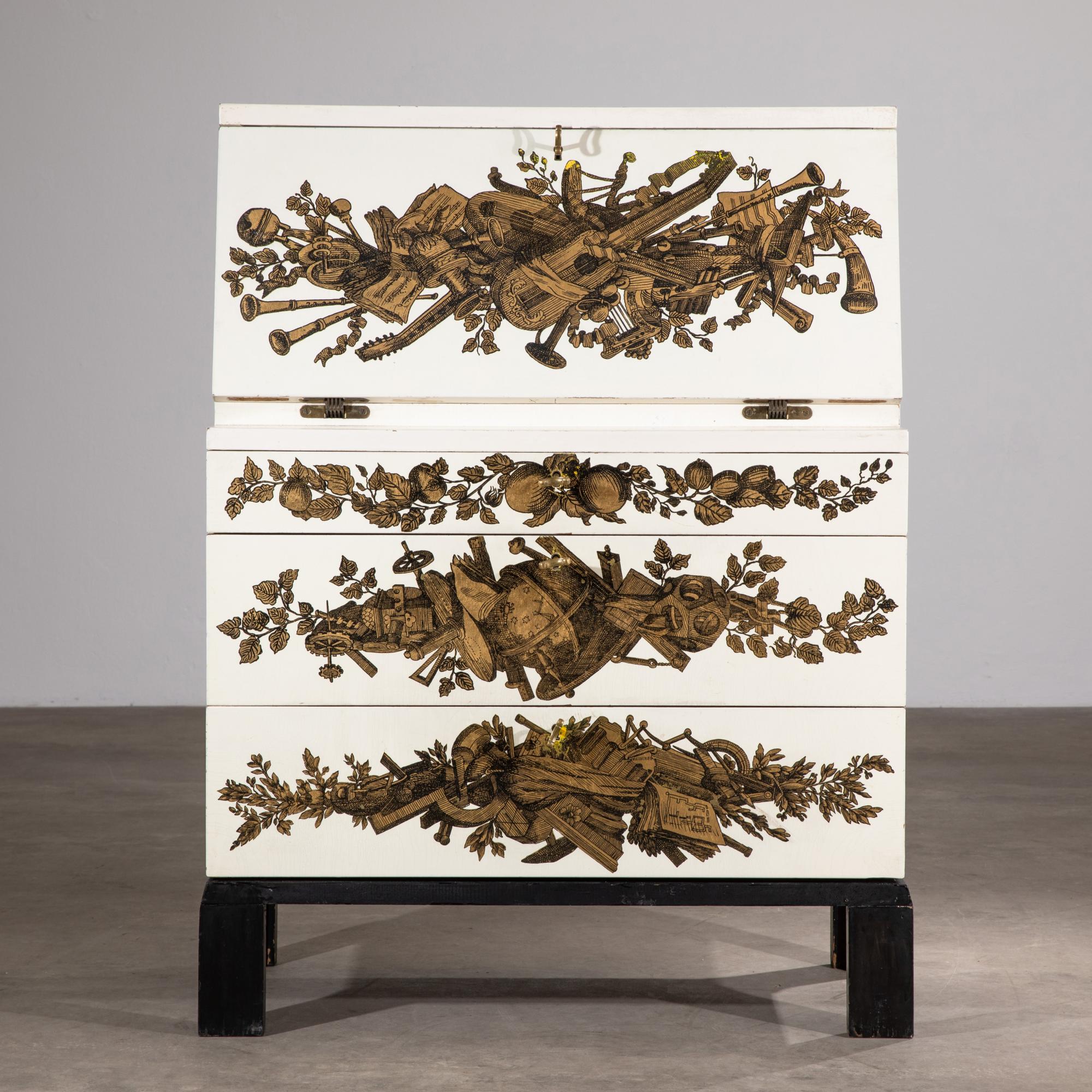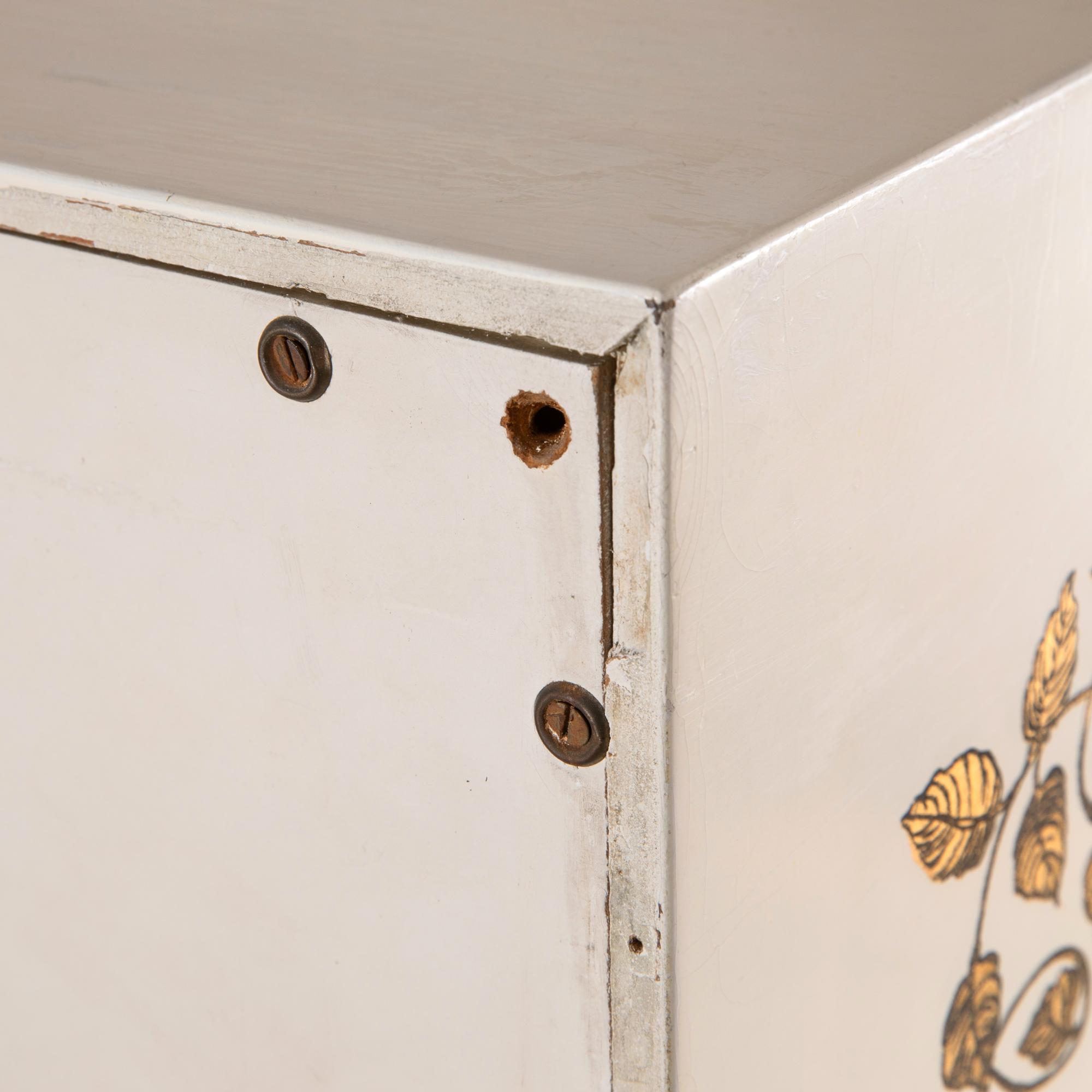 Entwurf um 1955. Holz lackiert, Goldtransfer-Druck. 108,5 x 80 x 40,5 cm.