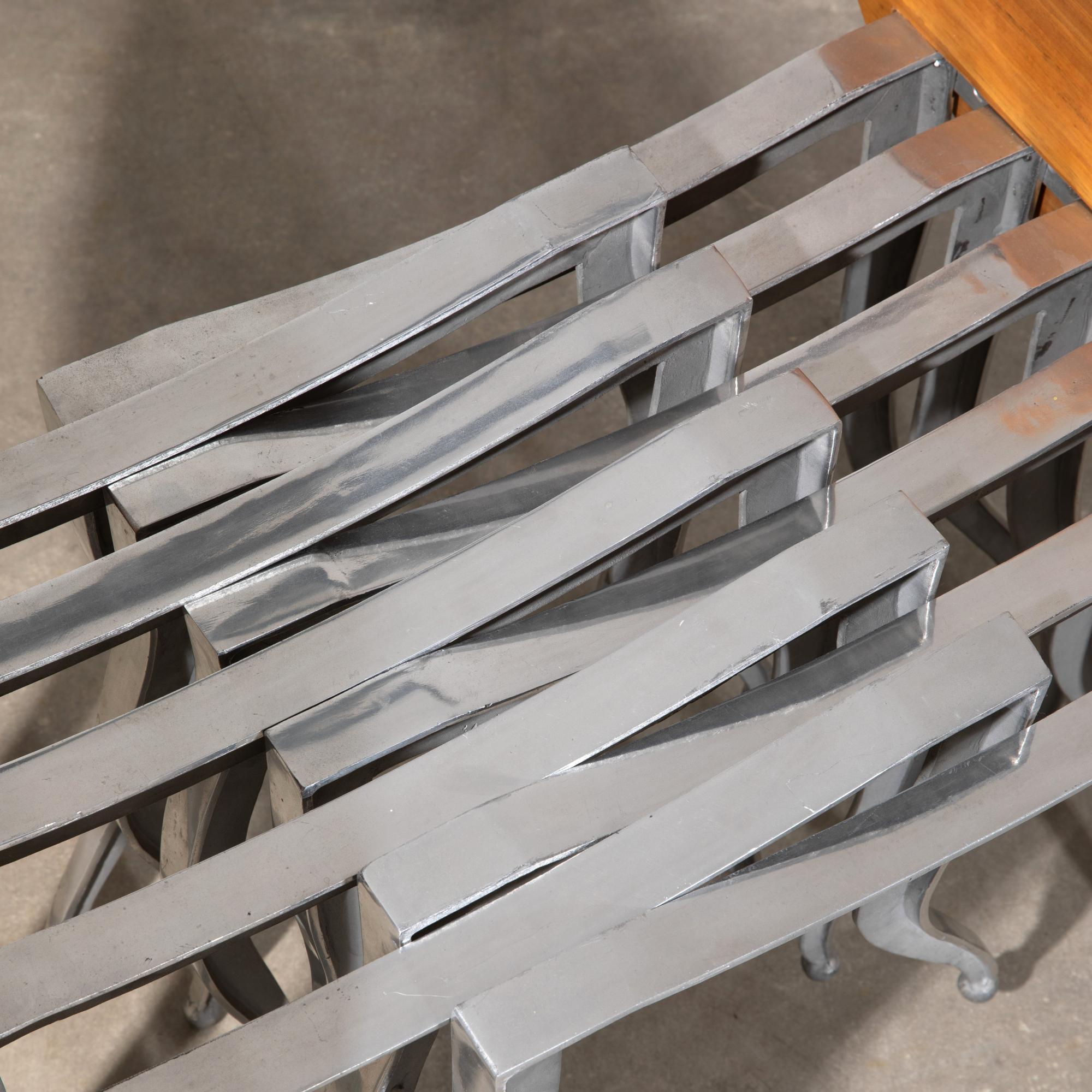 Entwurf um 1989. Zweiteilige Konstruktion aus Aluminiumguss und europäischem Nussbaum. 76 x 60/64 x 55 cm.
