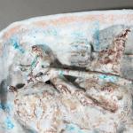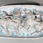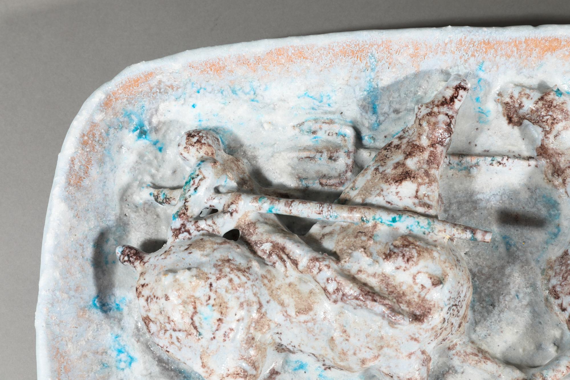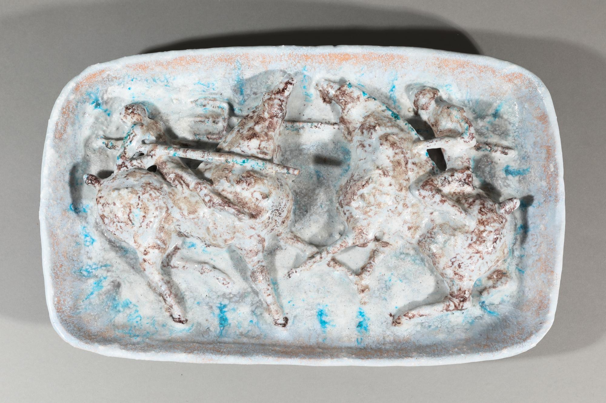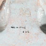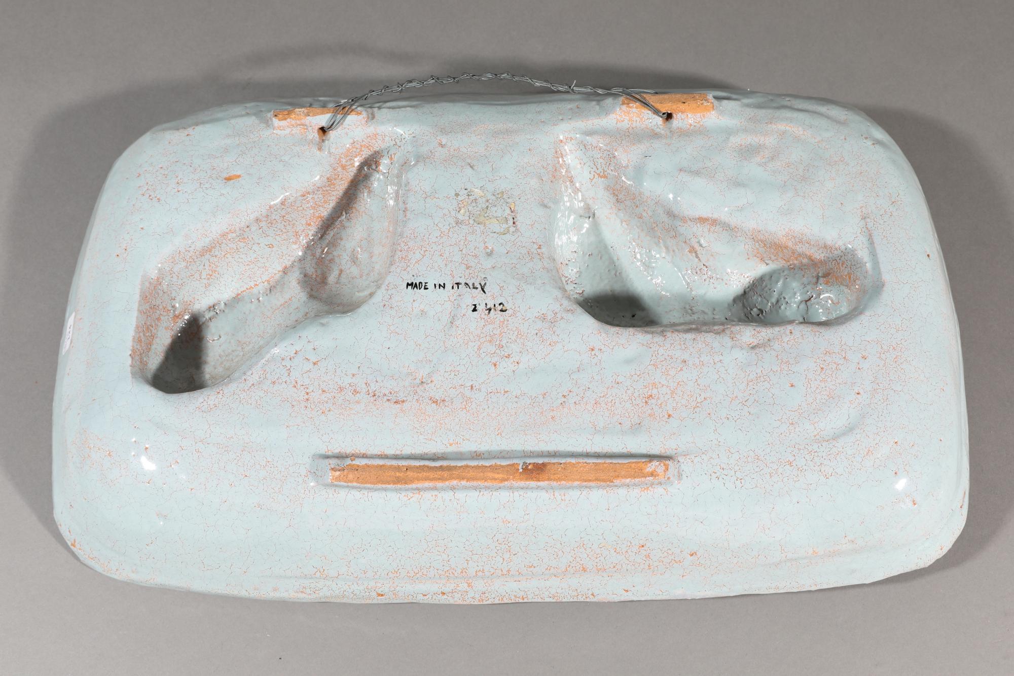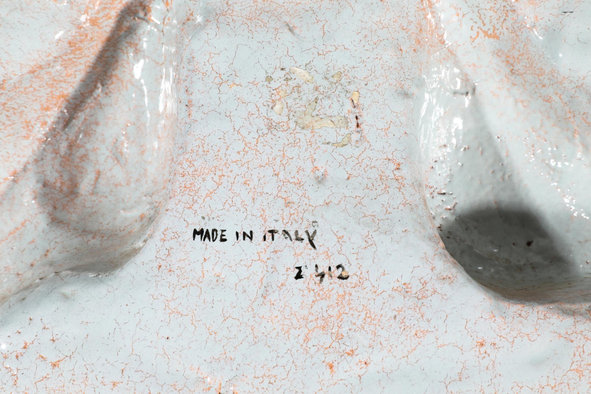 Earthenware, polychrome glaze with craquelure. Circa 1950. Mark: MADE IN ITALY Z412, Dimensions: 50 x 31 cm. Provenance: Otto Bantele private collection.